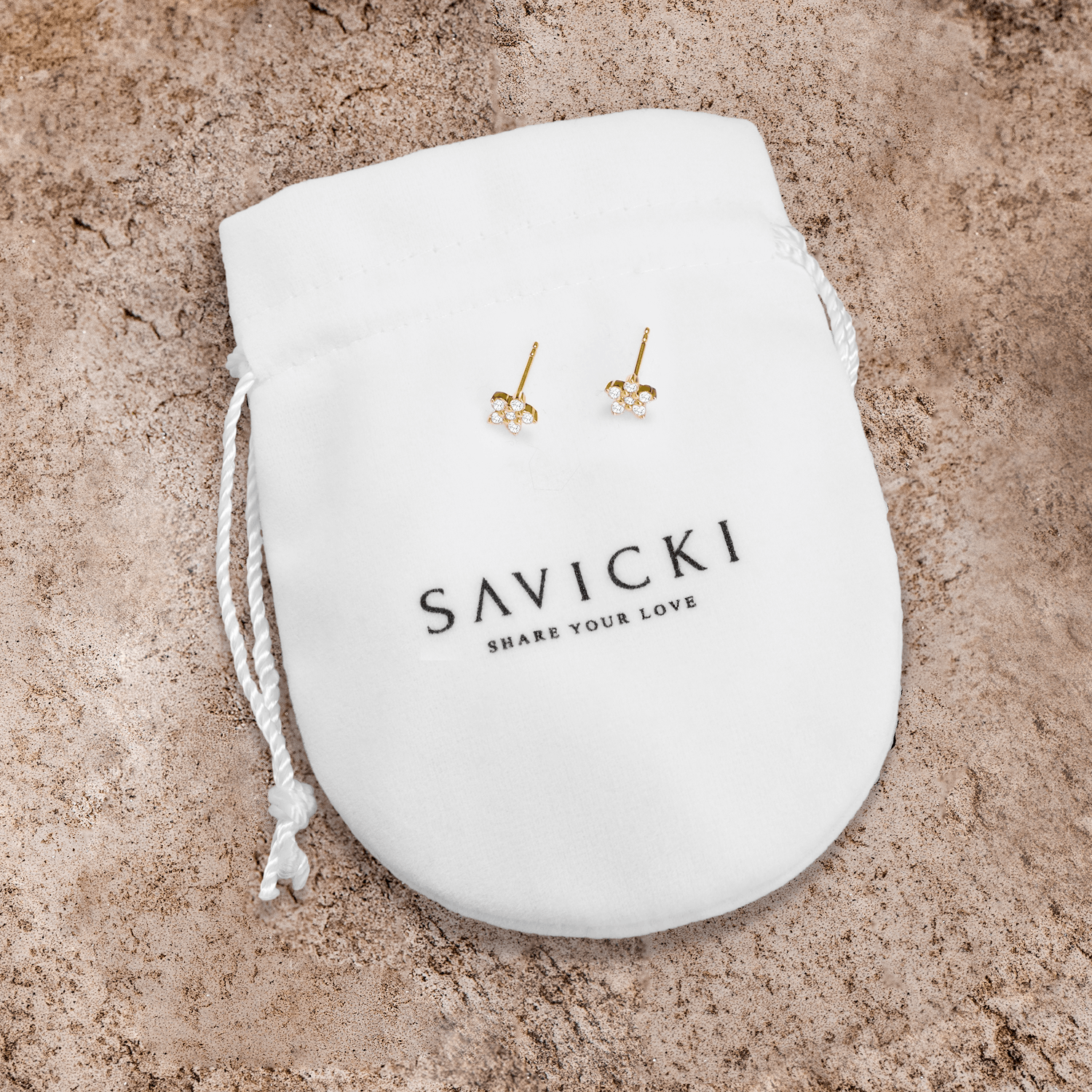 Kolczyki śnieżynki Savicki wykonane z żółtego złota (próba 375). W kolczykach zostało osadzonych 12 diamentów o łącznej masie 0,28 ct. Kolczyki posiadają blokadę, która zabezpiecza zapięcie przed zsunięciem się.
