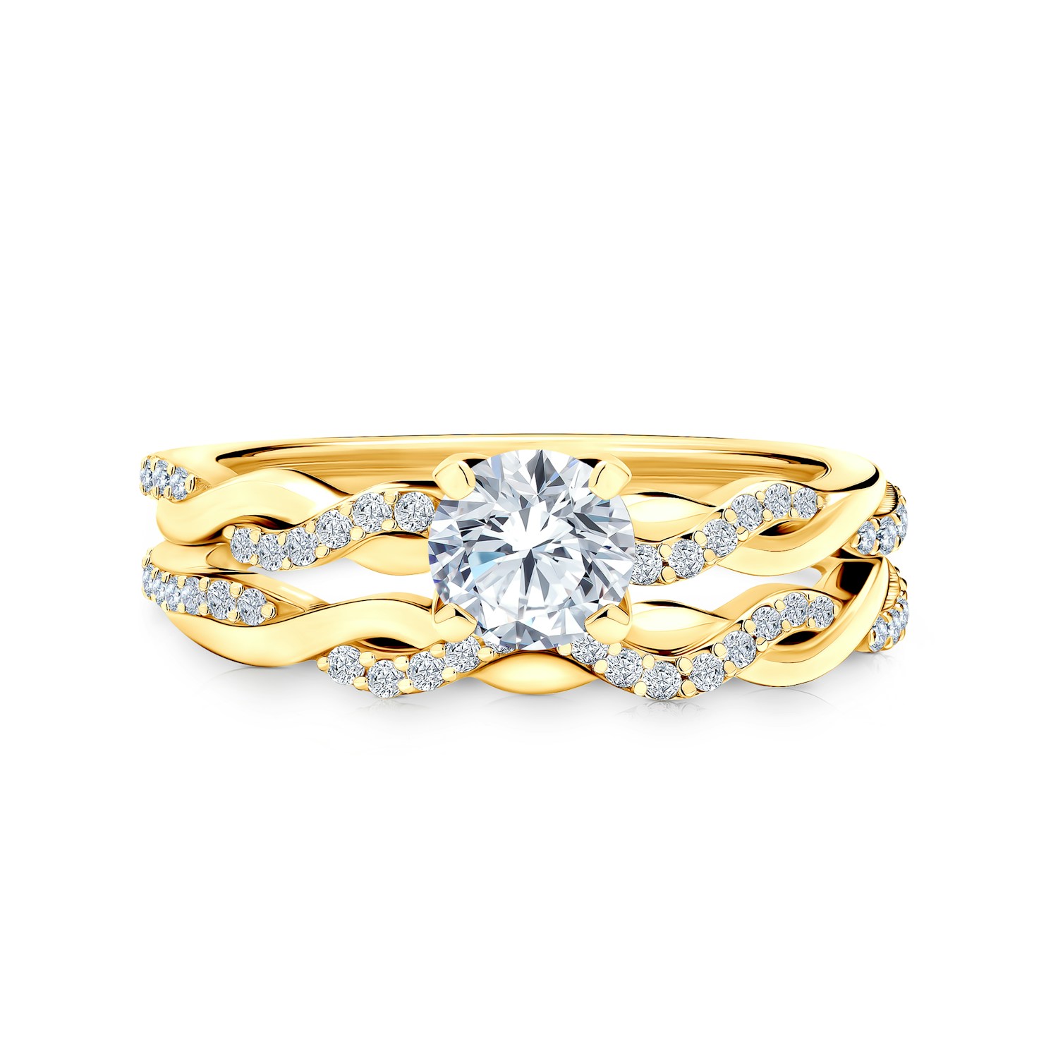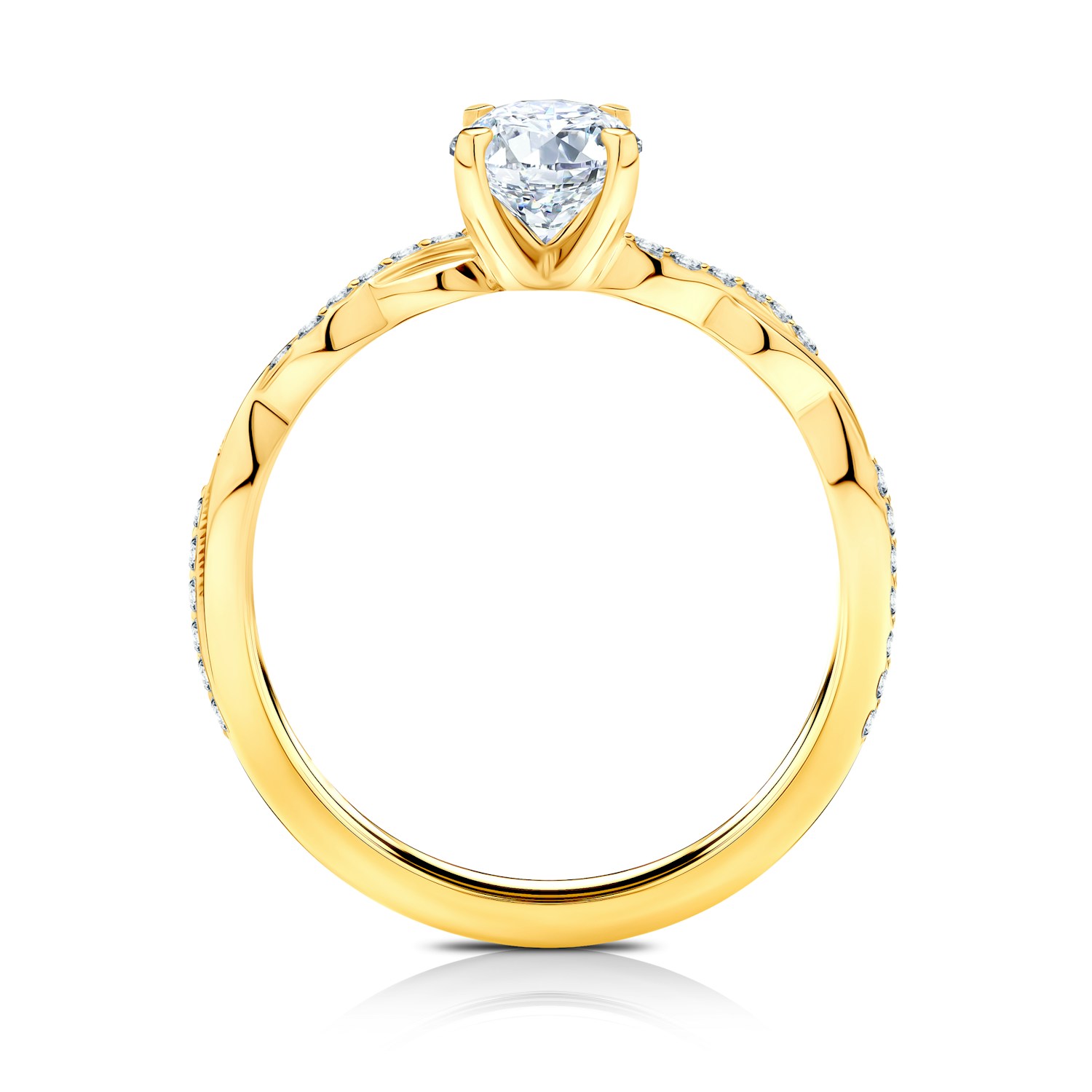Pierścionek zaręczynowy z diamentem 0,4ct o szlifie brylantowym, wysokiej czystości SI2/H oraz kamieniami w szynie 28szt x 0.0035ct Si 2/H, wykonany z 14-karatowego żółtego złota (próba 0,585).
