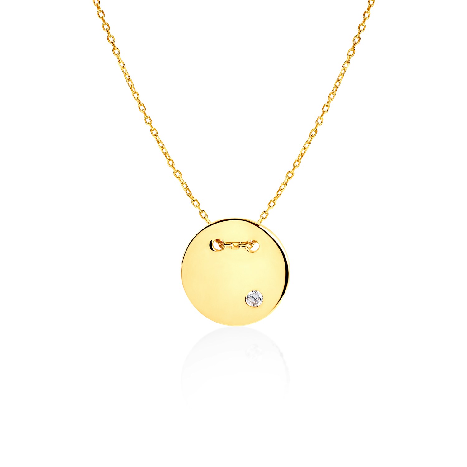 Naszyjnik koło Savicki wykonany z żółtego złota (próba 585). W naszyjniku został osadzony 1 diament o masie 0,02 ct.