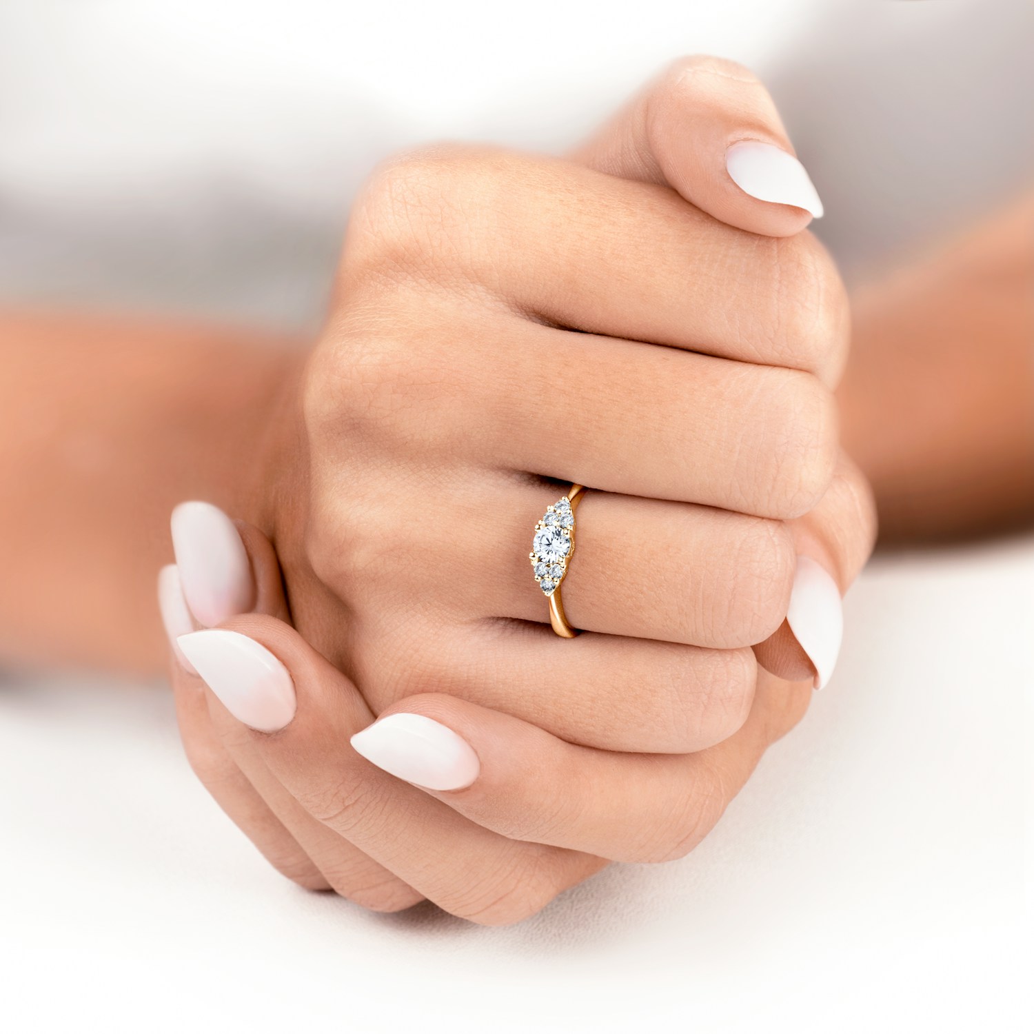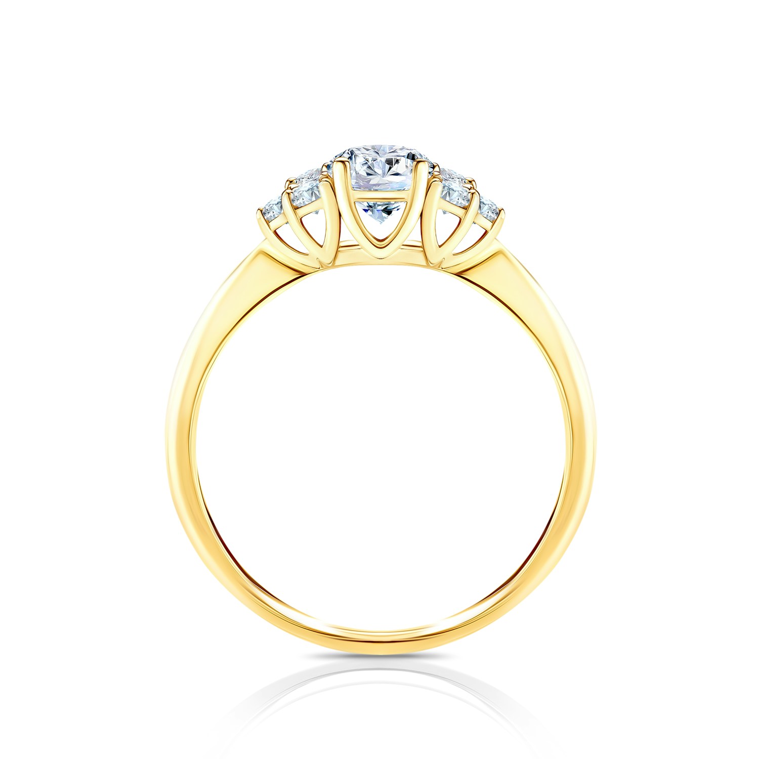 Ten olśniewający pierścionek zaręczynowy z białym szafirem o szlifie brylantowym i masie 0,30 ct oraz otaczającymi go sześcioma białymi szafirami, wykonany został z 14-karatowego żółtego złota próby 0,585.