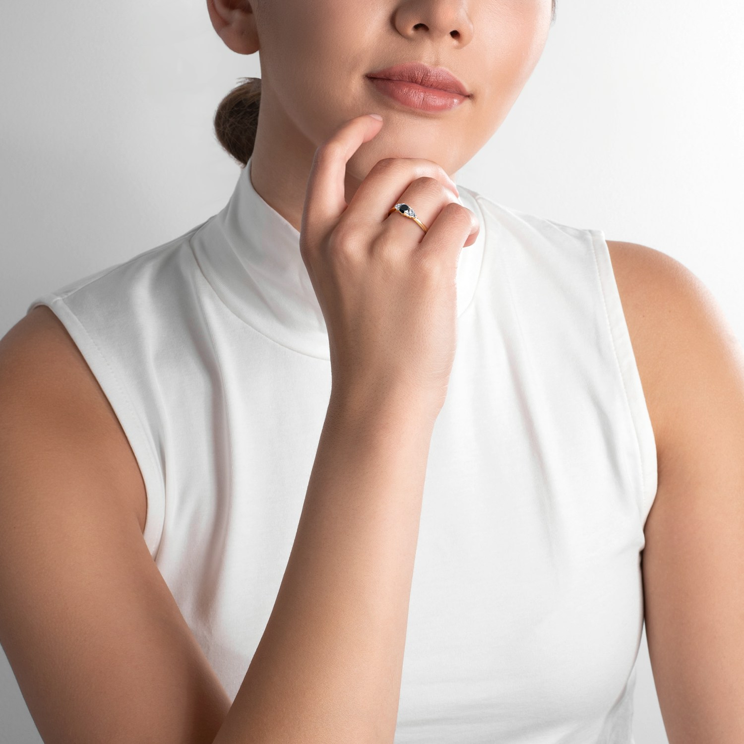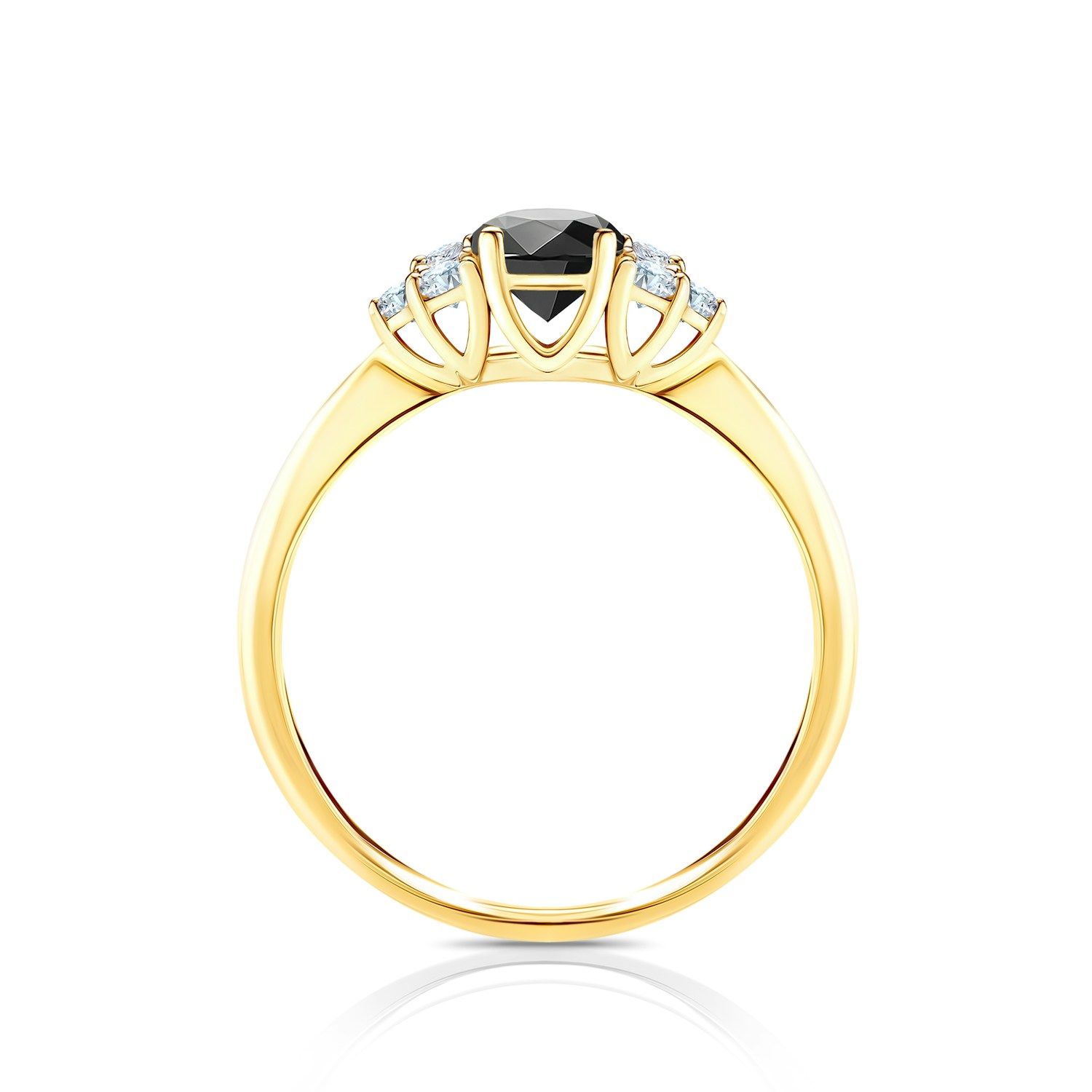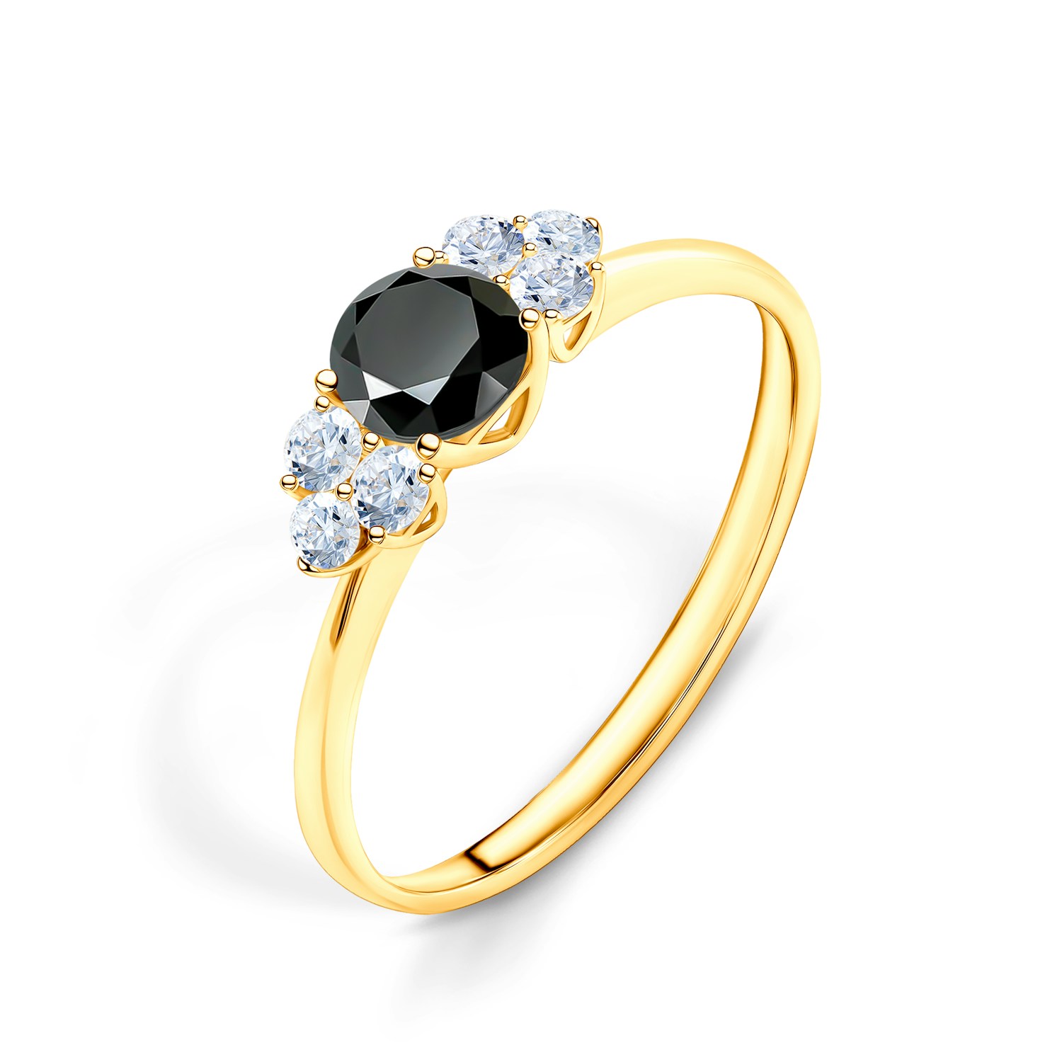 Ten olśniewający pierścionek zaręczynowy z czarnym diamentem o szlifie brylantowym i masie 0,30 ct oraz otaczającymi go sześcioma białymi szafirami, wykonany został z 14-karatowego żółtego złota próby 0,585.