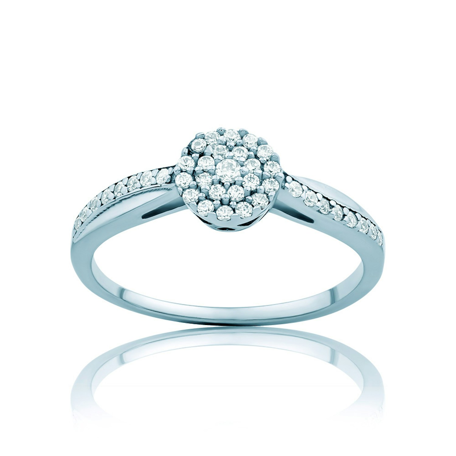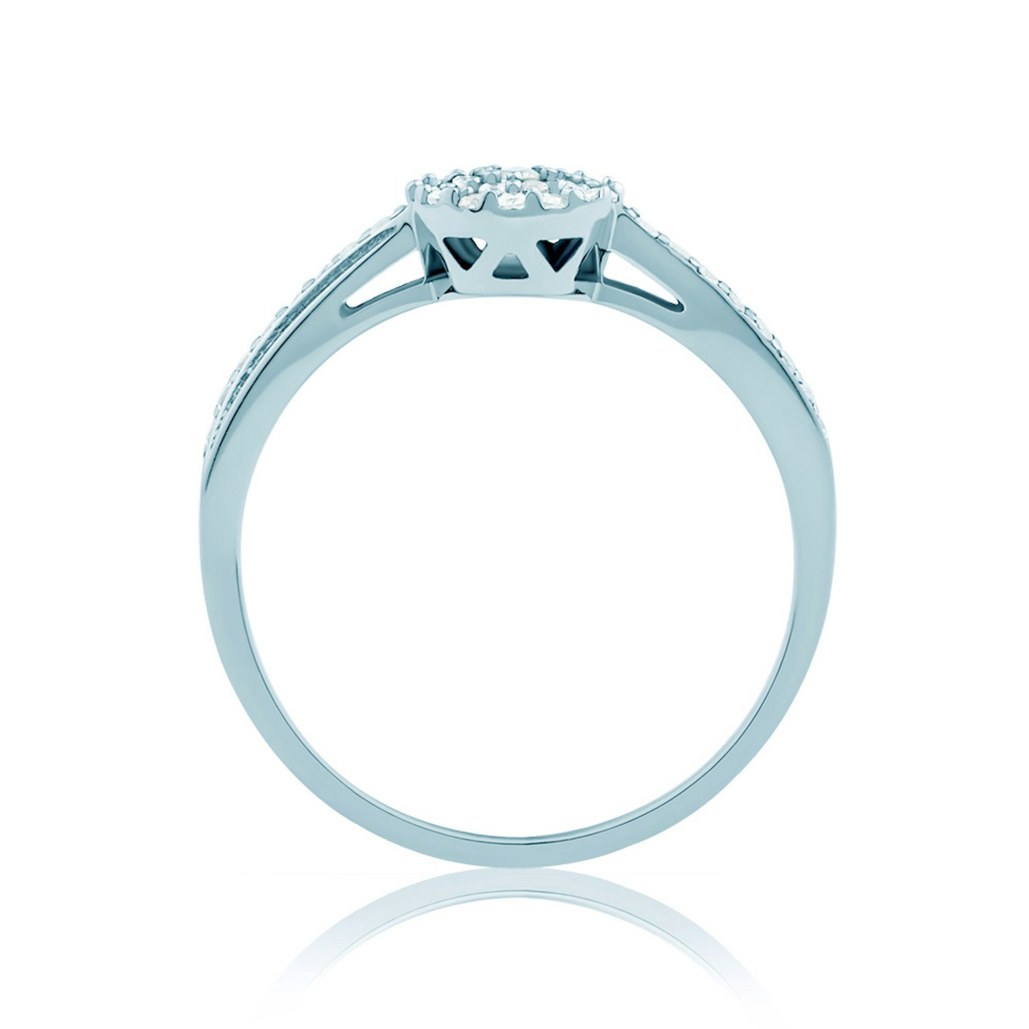 Pierścionek zaręczynowy z 39 diamentami o szlifie brylantowym wysokiej czystości SI/H, o łącznej masie 0,21 ct (0,012 ct oraz 38x0,005 ct). Wykonany z 14-karatowego białego złota (próba 0,585).