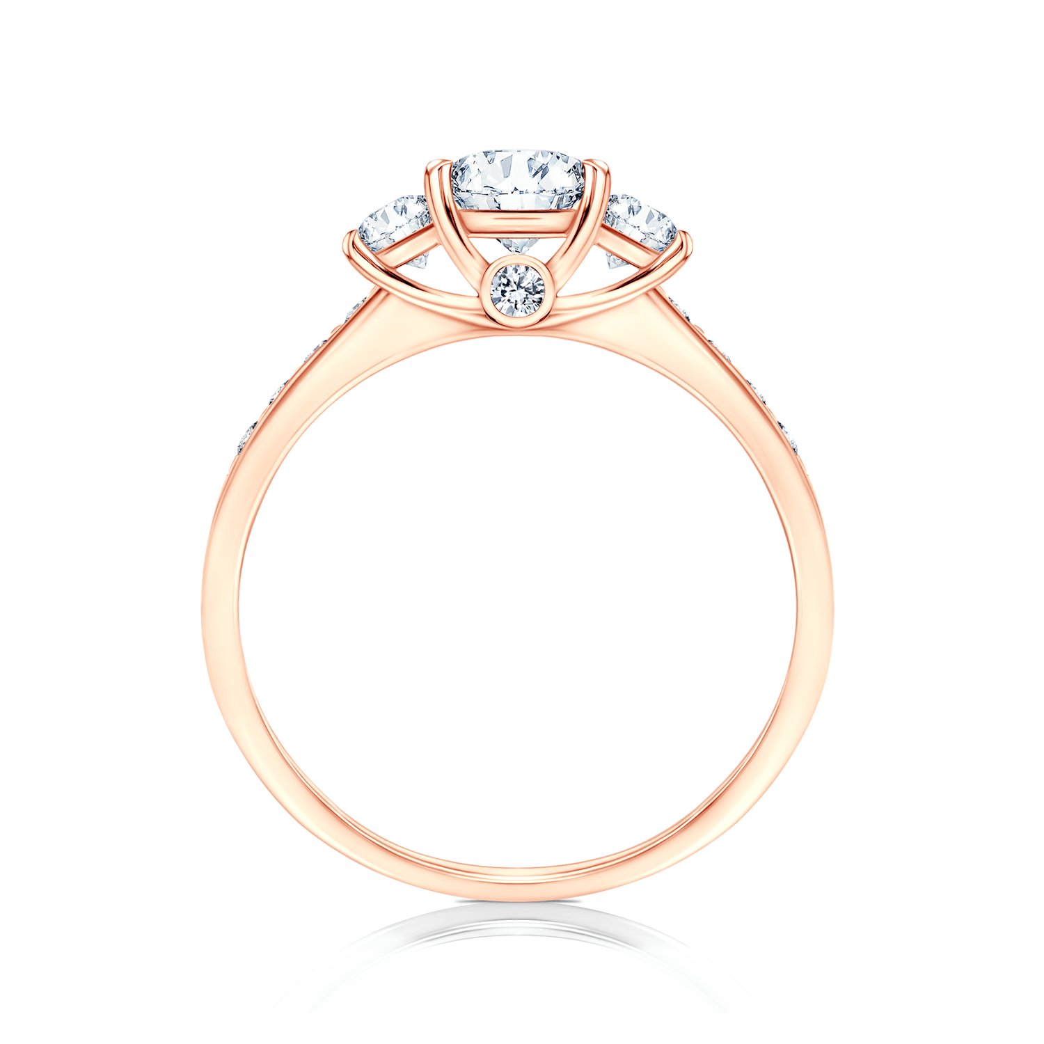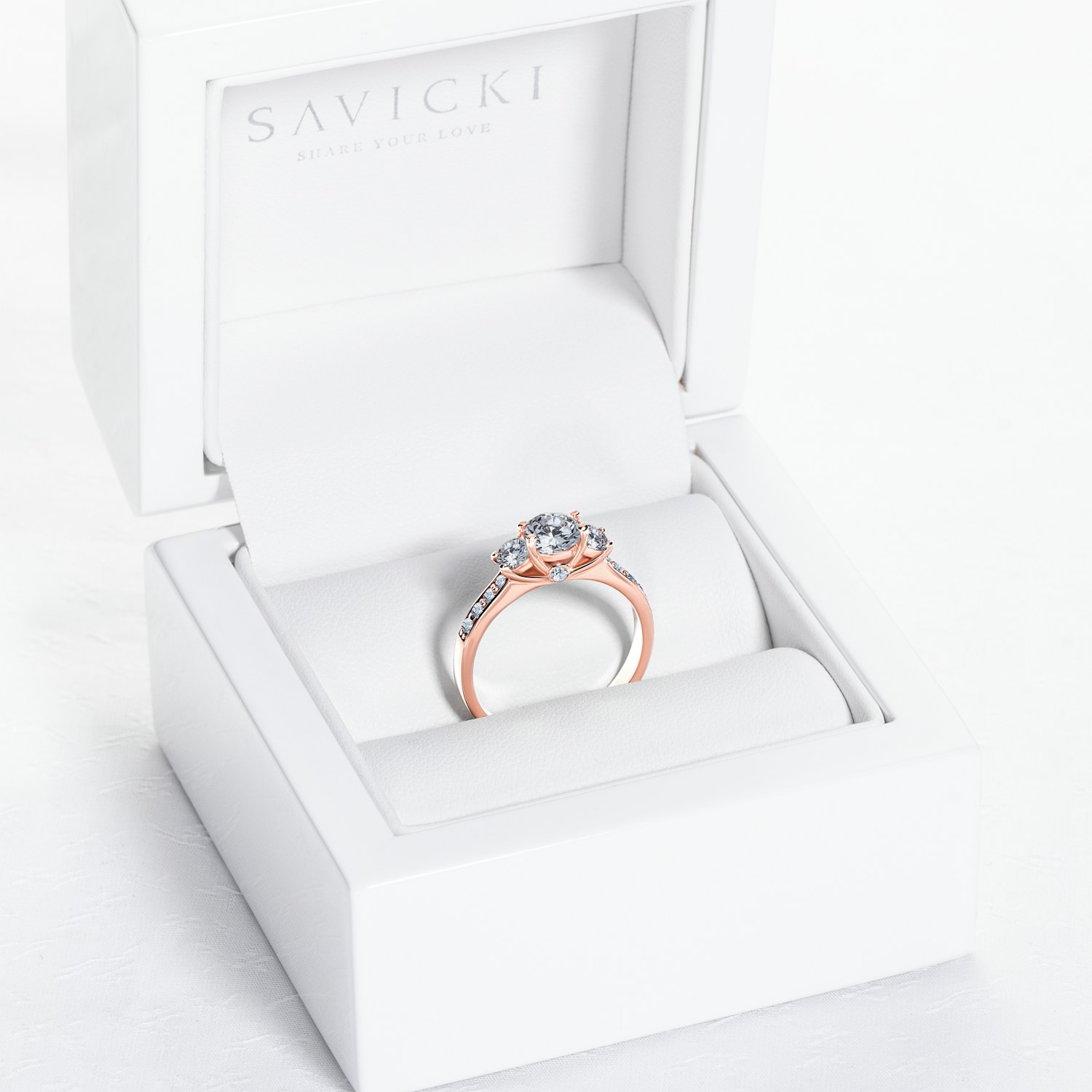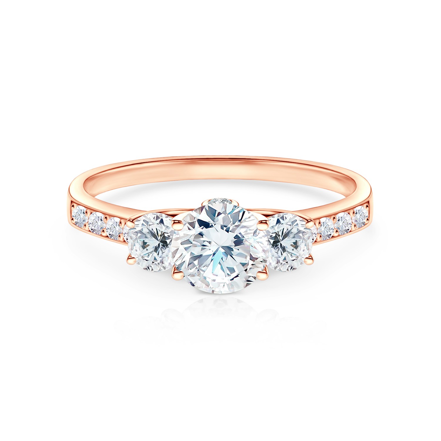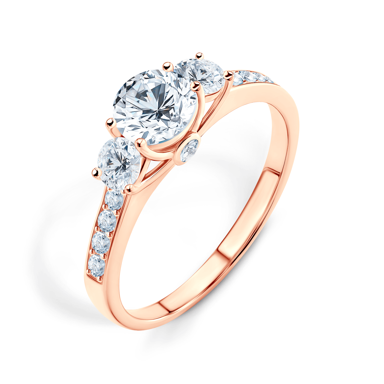 Pierścionek zaręczynowy z centralnie umieszczonym diamentem o masie 0,5 ct oraz 12 bocznymi diamentami o łącznej masie 0,39 ct o wysokiej czystości SI/H i szlifie brylantowym. Wykonany z 14-karatowego różowego złota (próba 585).