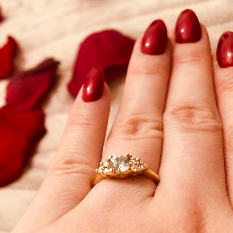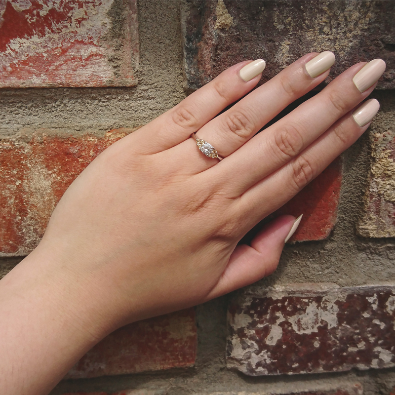 Ten olśniewający pierścionek zaręczynowy z diamentem o szlifie brylantowym i masie 0,5 ct oraz otaczającymi go sześcioma diamentami o łącznej masie 0,18 ct, wykonany został z 14-karatowego czarnego złota próby 0,585.