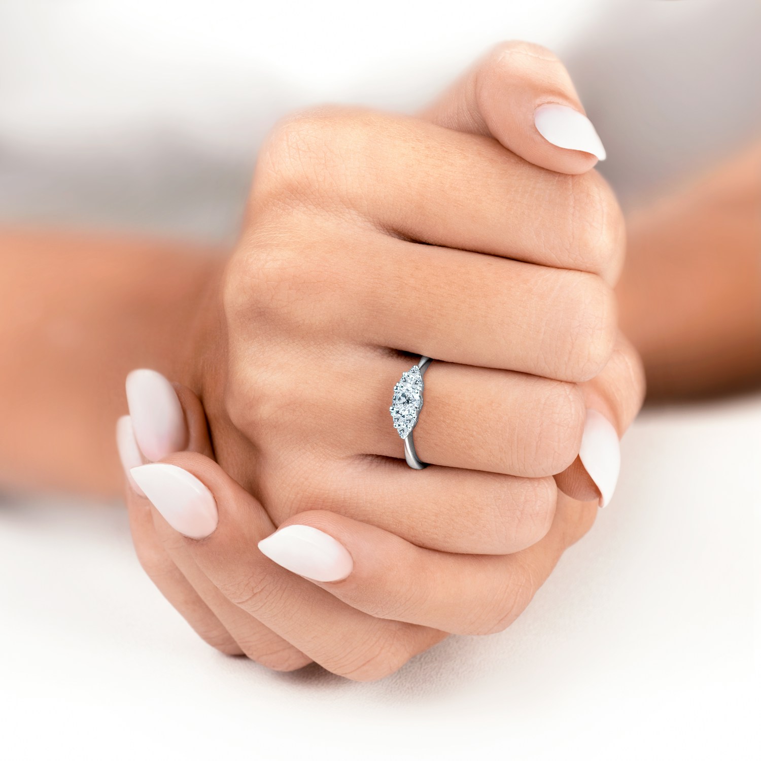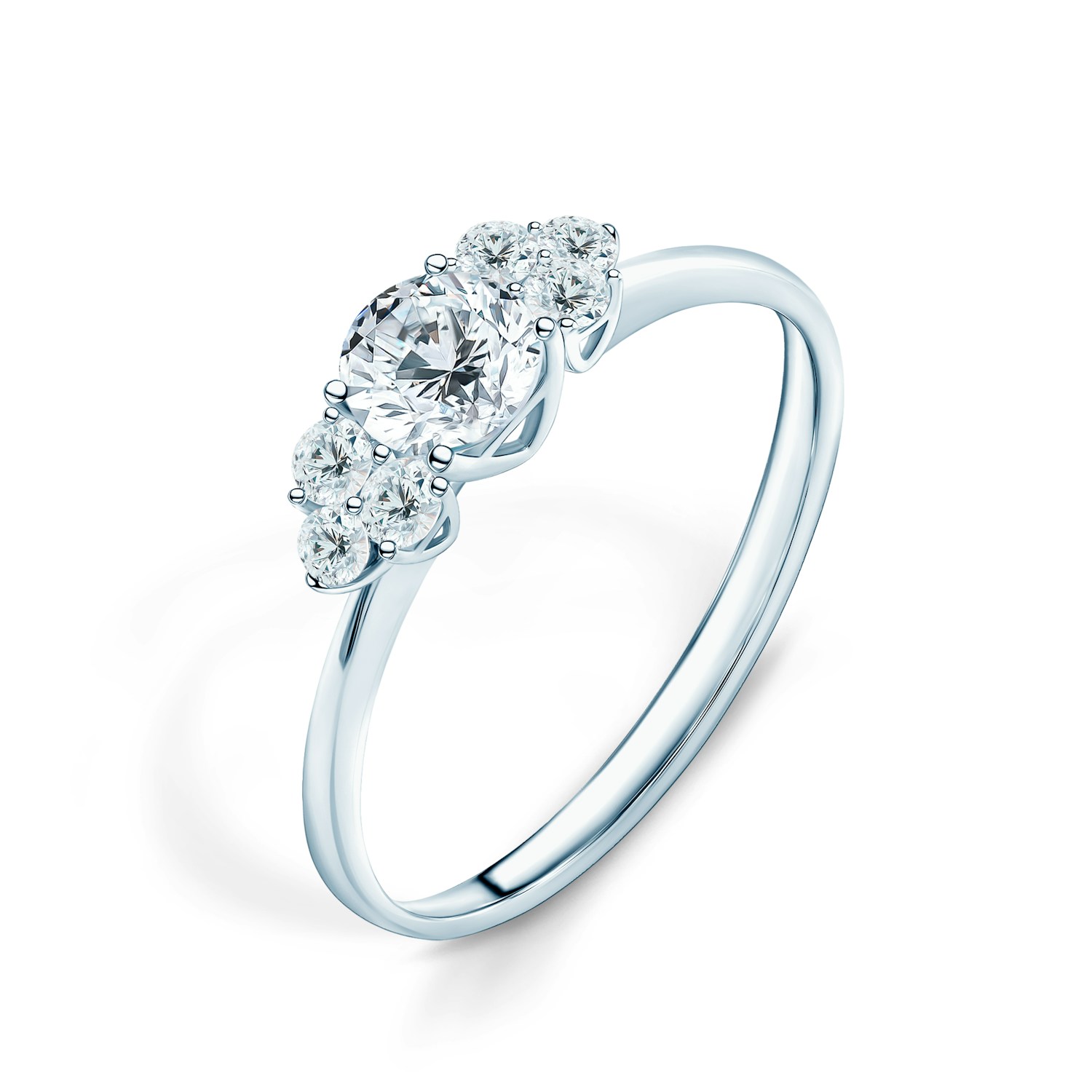 Ten olśniewający pierścionek zaręczynowy z diamentem o szlifie brylantowym i masie 0,3 ct oraz otaczającymi go sześcioma diamentami o łącznej masie 0,12 ct, wykonany został z 14-karatowego białego złota próby 0,585.
