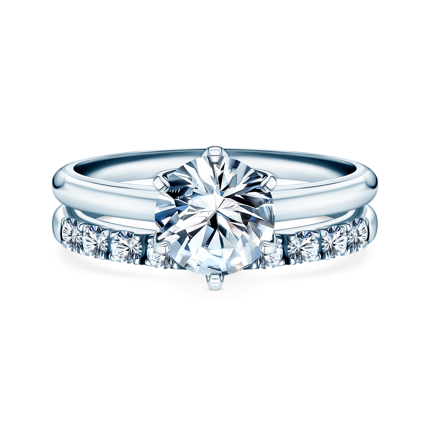 Specjalnie wyprofilowana obrączka idealnie wpasowuje się w pierścionek zaręczynowy, tworząc jedyną taką kompozycję biżuterii.