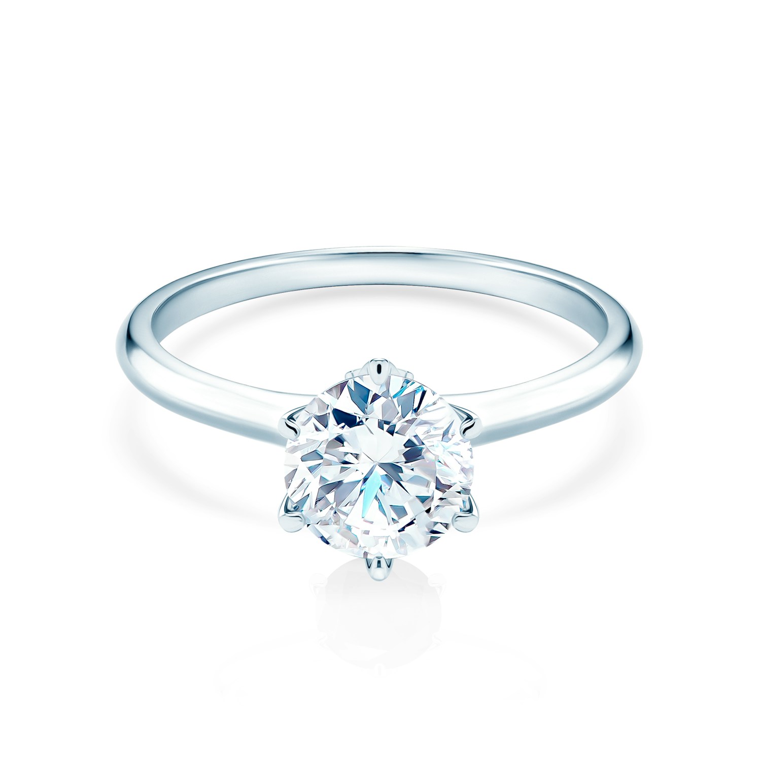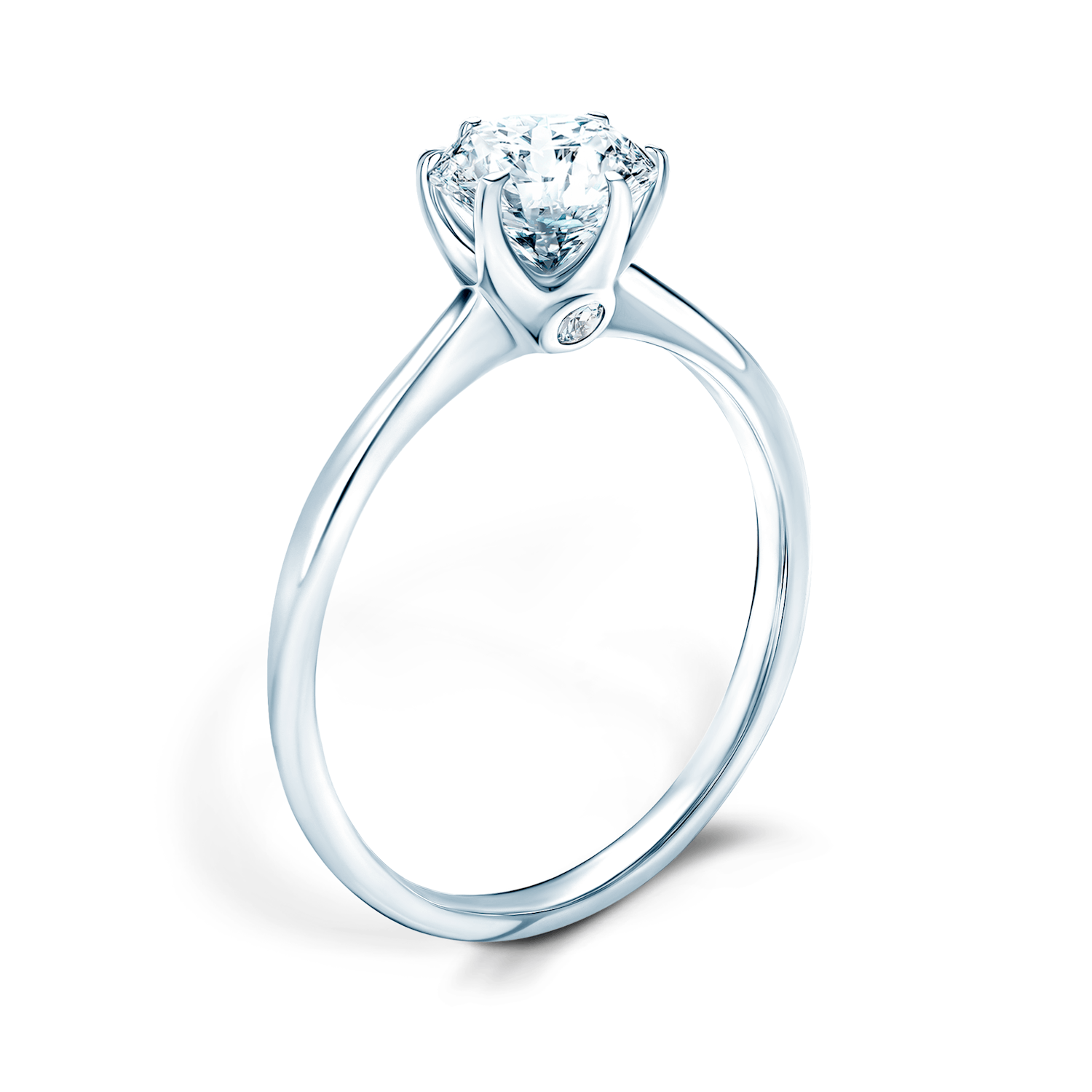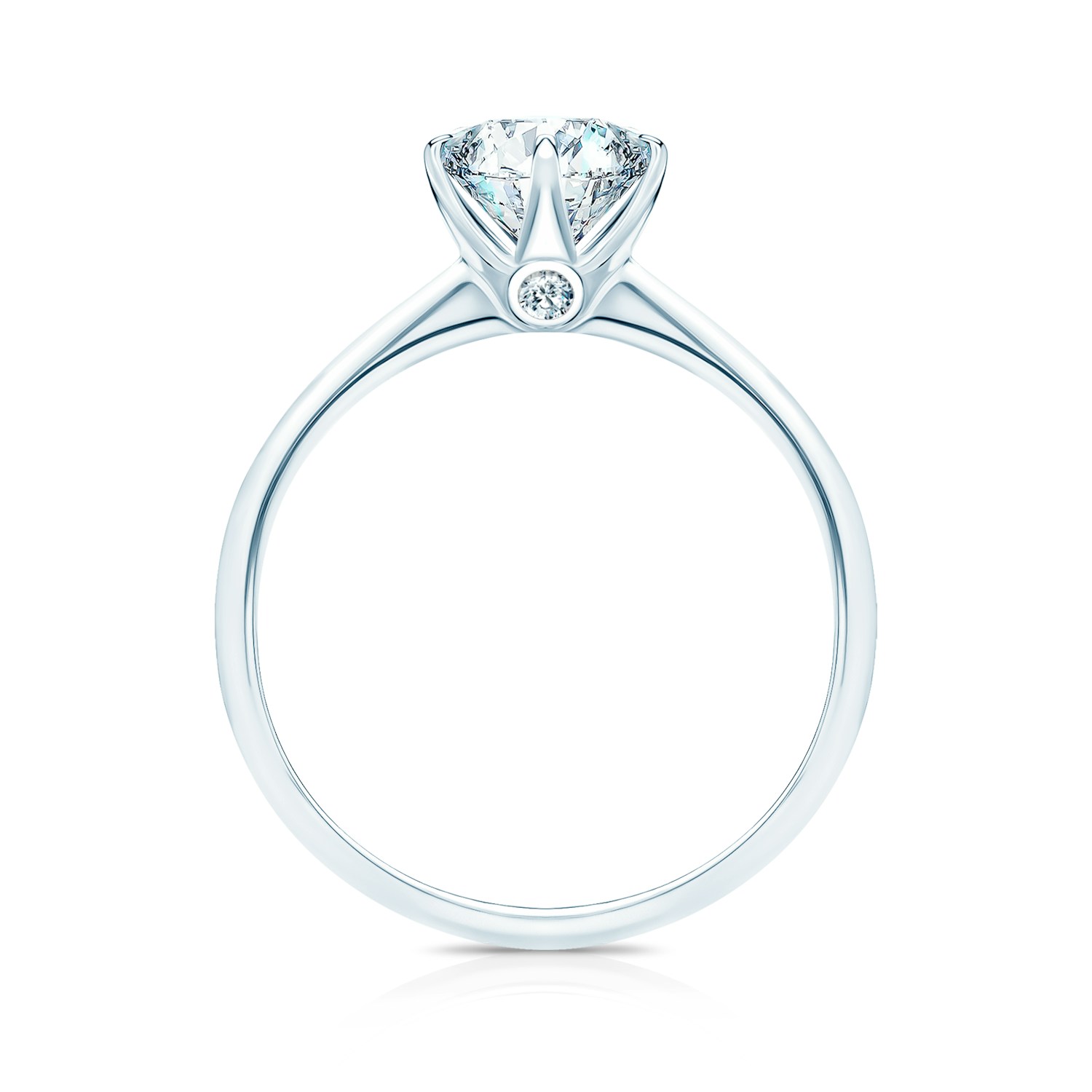 Pierścionek zaręczynowy z centralnie umieszczonym diamentem o masie 1 ct oraz dwoma diamentami o łącznej masie 0,034 ct, wysokiej czystości SI/H, o szlifie brylantowym. Wykonany z 14-karatowego białego złota (próba 0,585).