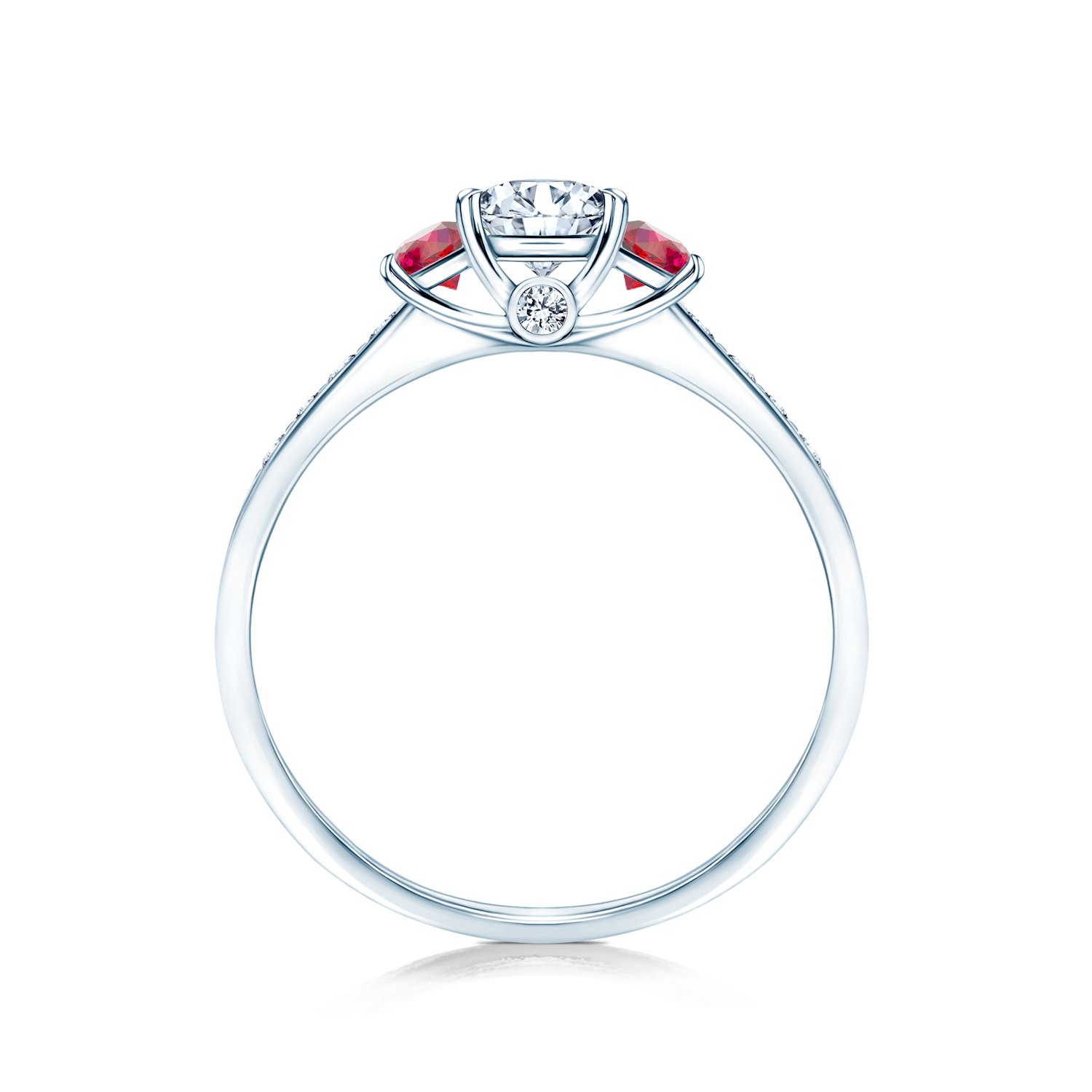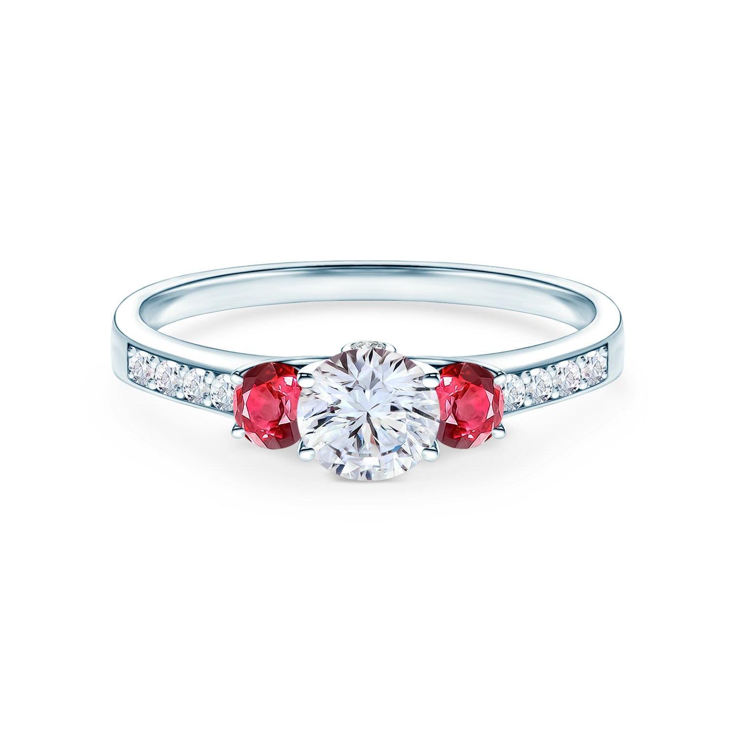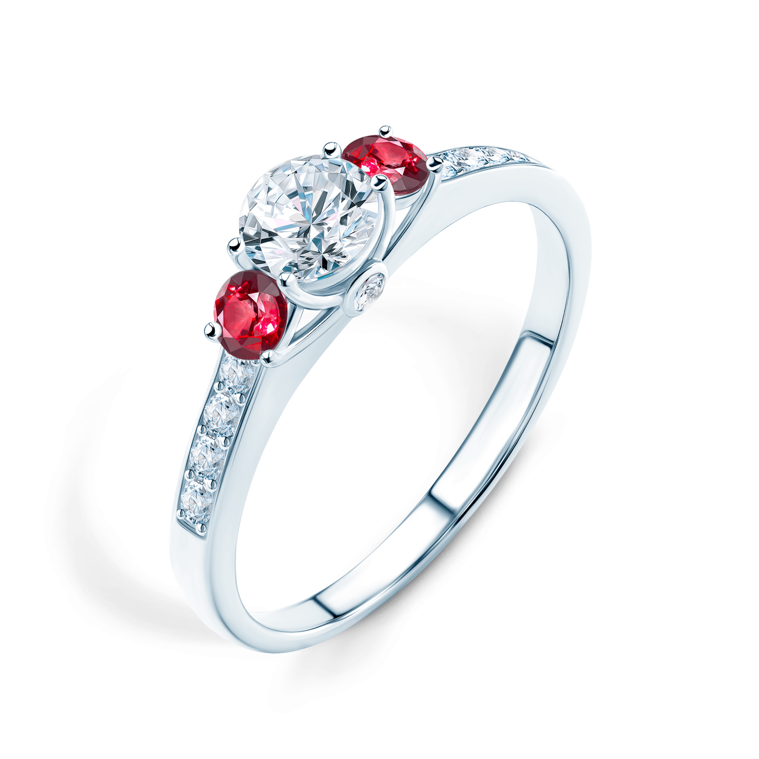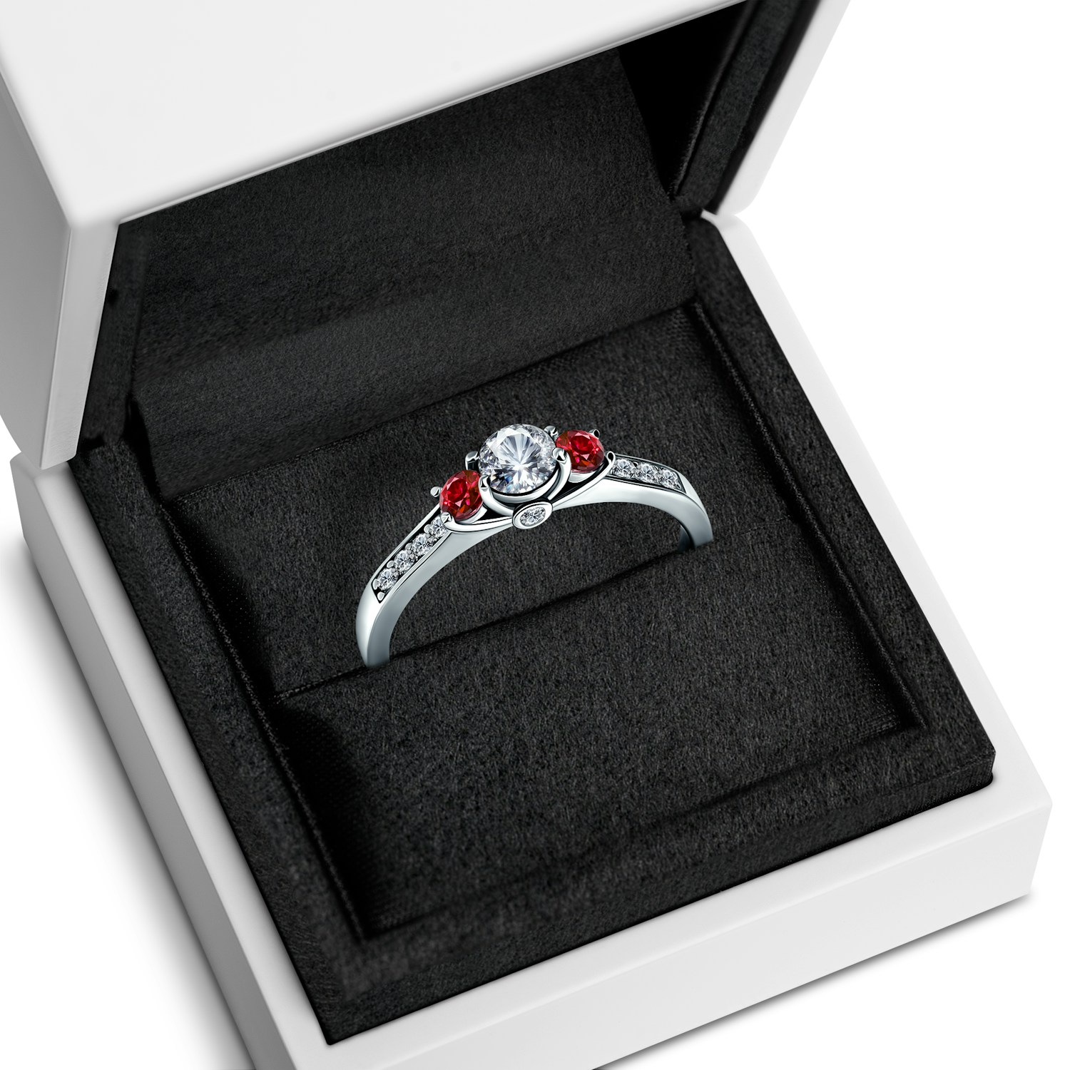 Pierścionek zaręczynowy z centralnie umieszczonym białym szafirem o masie 0,3 ct oraz dwoma rubinami o łącznej masie 0,2 ct. Boczne diamenty posiadają łączną masę 0,126 ct o wysokiej czystości SI/H i szlifie brylantowym. Wykonany z 14-karatowego białego złota (próba 585).