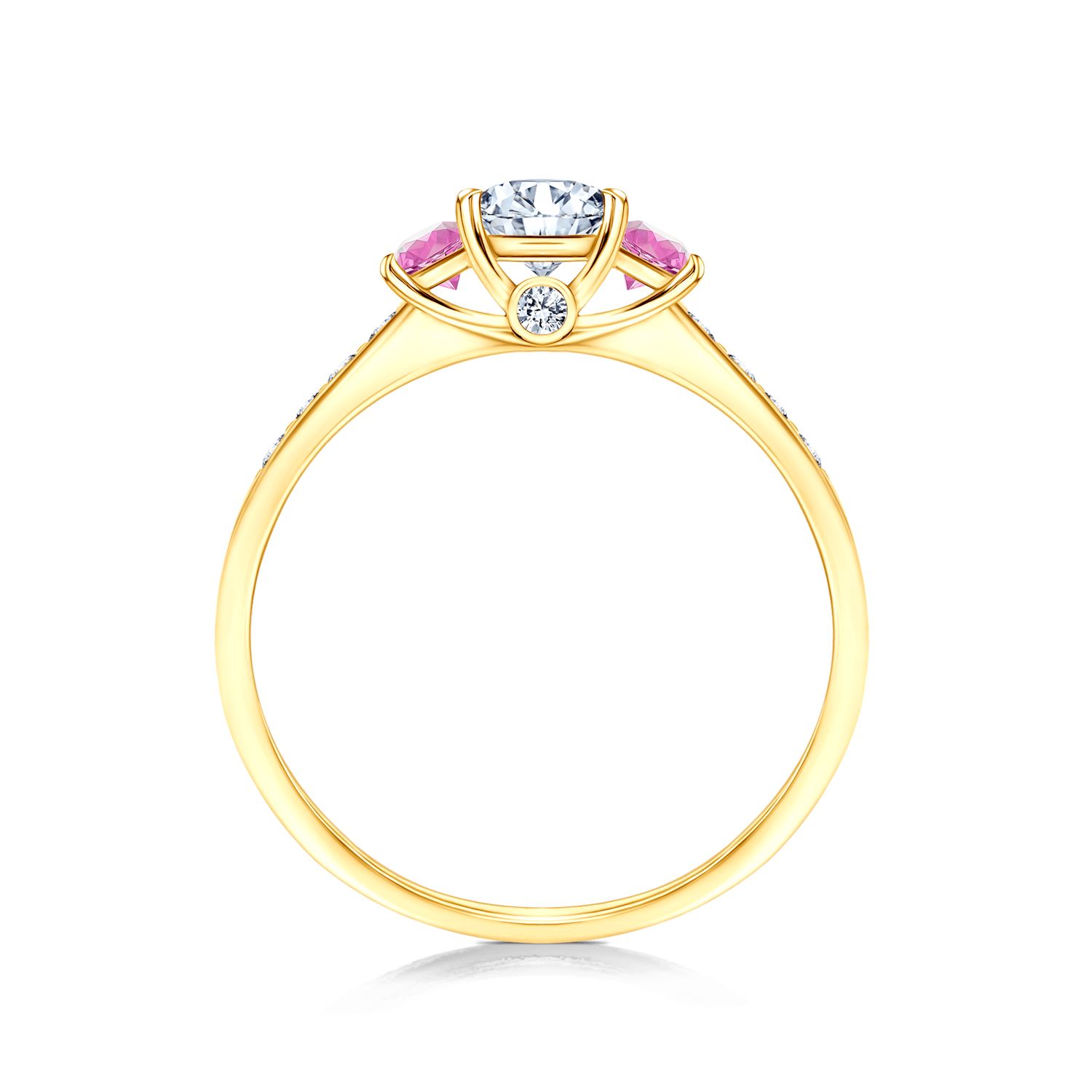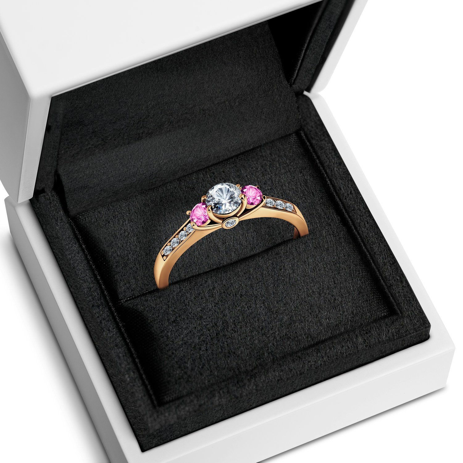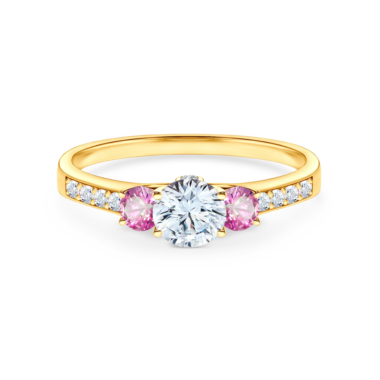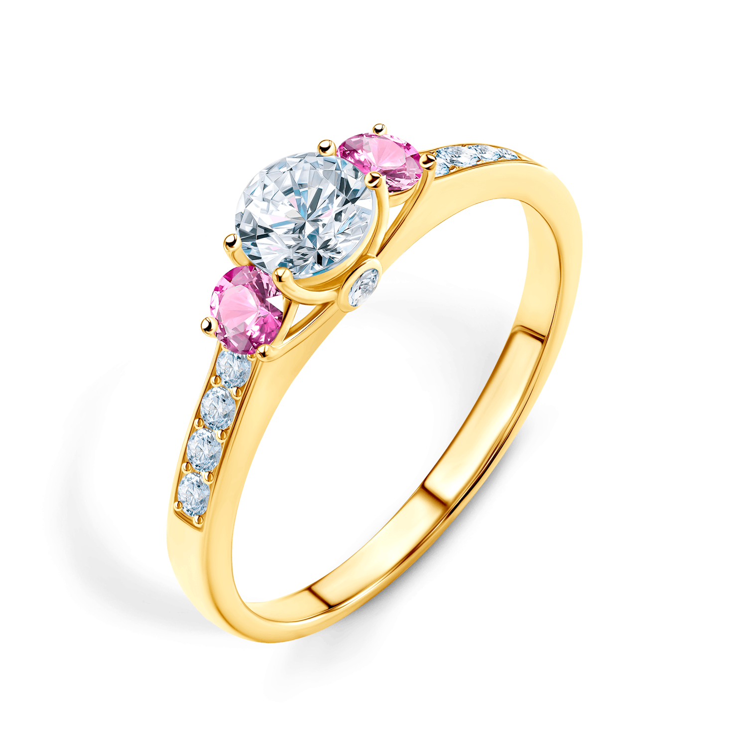 Pierścionek zaręczynowy z centralnie umieszczonym białym szafirem o masie 0,3 ct oraz dwoma różowymi szafirami o łącznej masie 0,2 ct. Boczne diamenty posiadają łączną masę 0,126 ct o wysokiej czystości SI/H i szlifie brylantowym. Wykonany z 14-karatowego żółtego złota (próba 585).