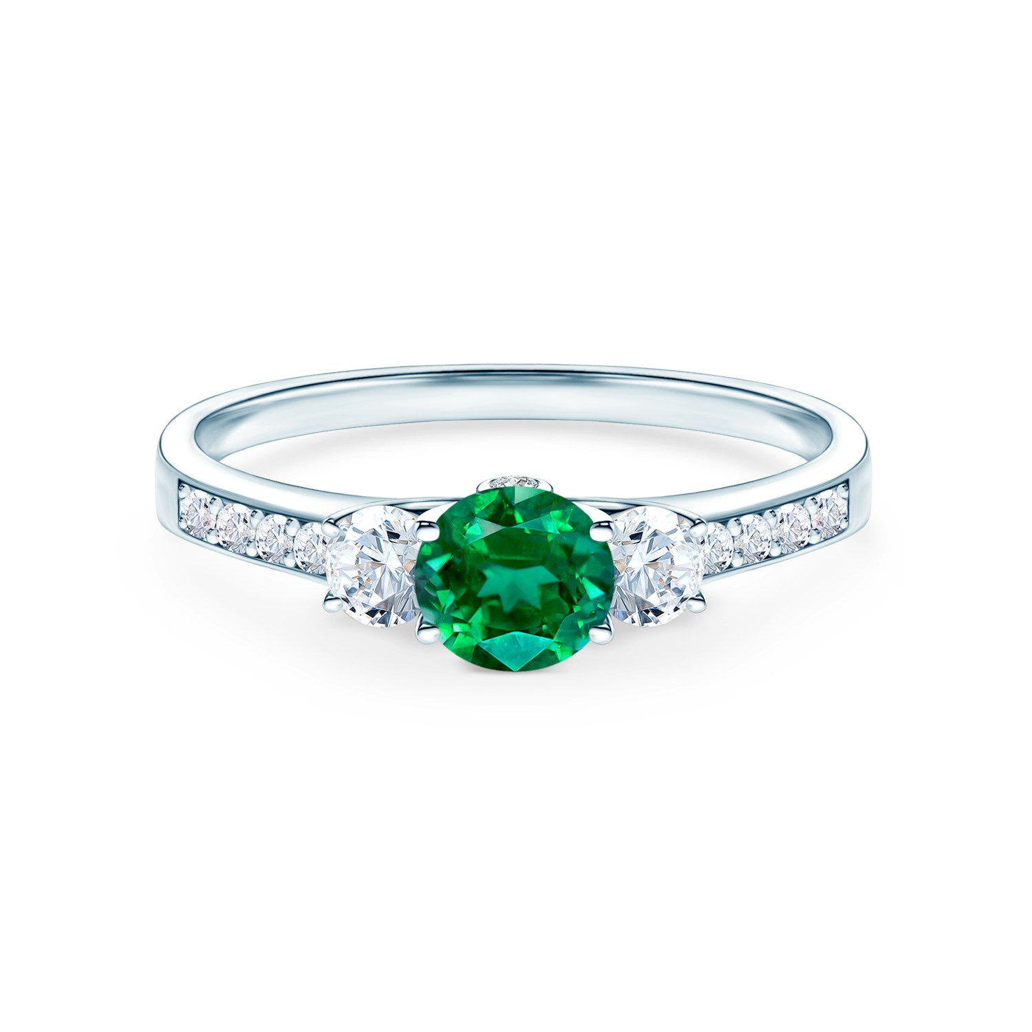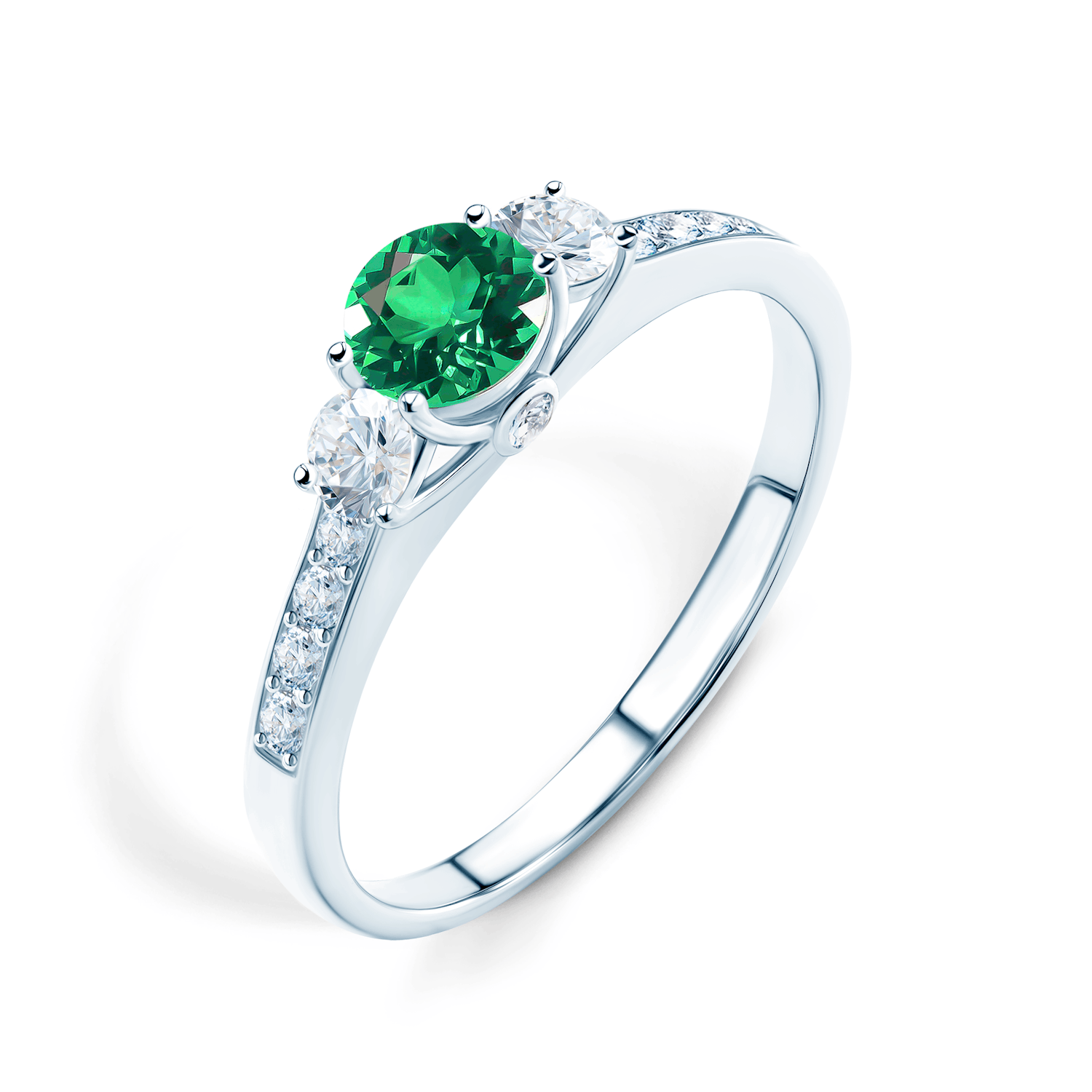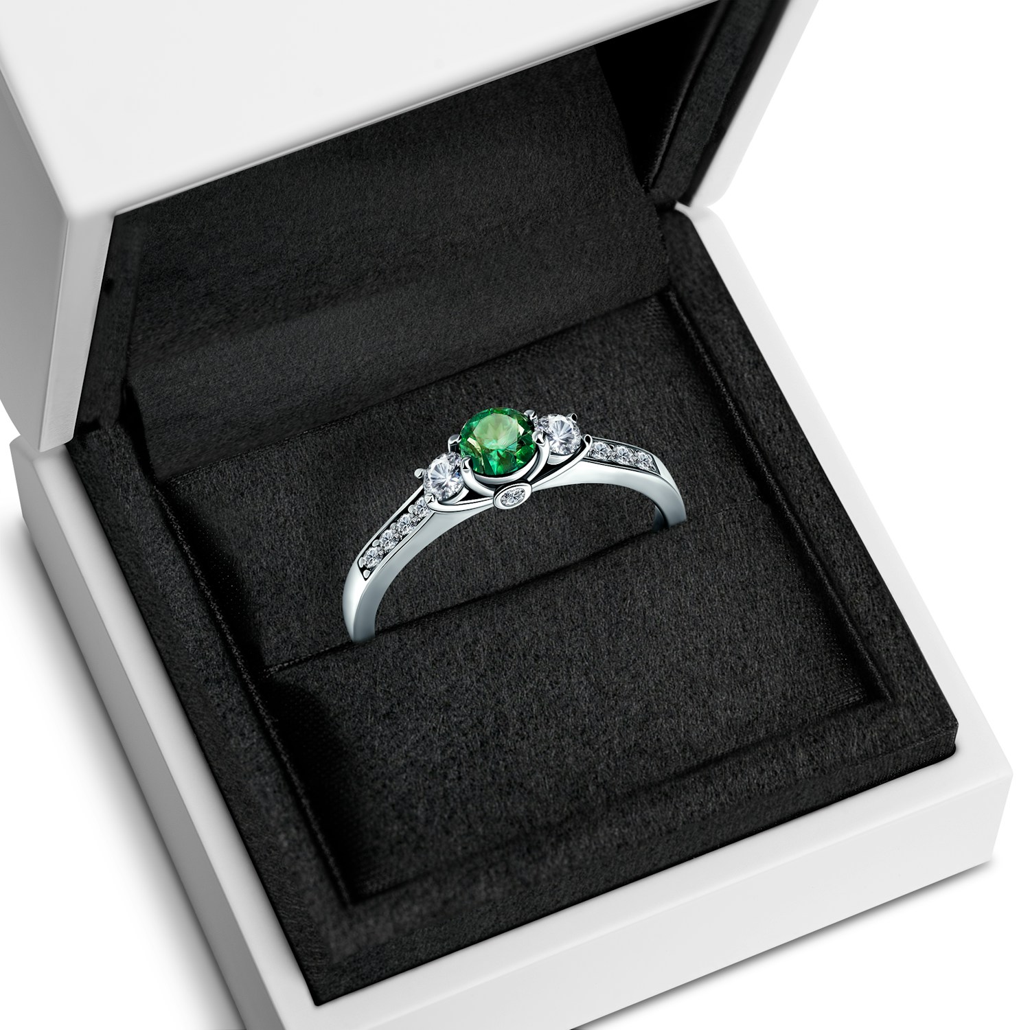 Pierścionek zaręczynowy z centralnie umieszczonym szmaragdem o masie 0,3 ct oraz dwoma białymi szafirami o łącznej masie 0,2 ct. Boczne diamenty posiadają łączną masę 0,126 ct o wysokiej czystości SI/H i szlifie brylantowym. Wykonany z 14-karatowego białego złota (próba 585).