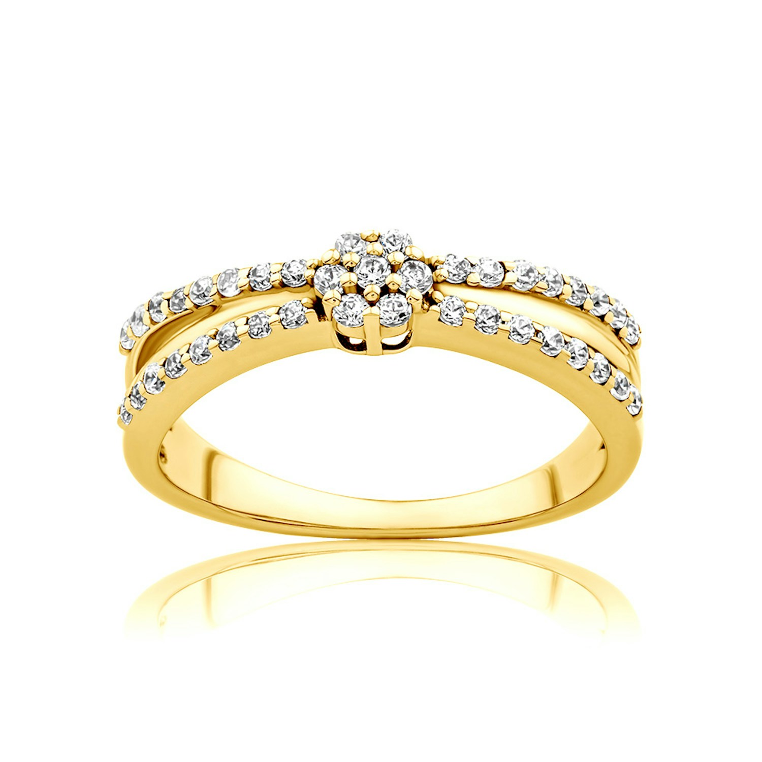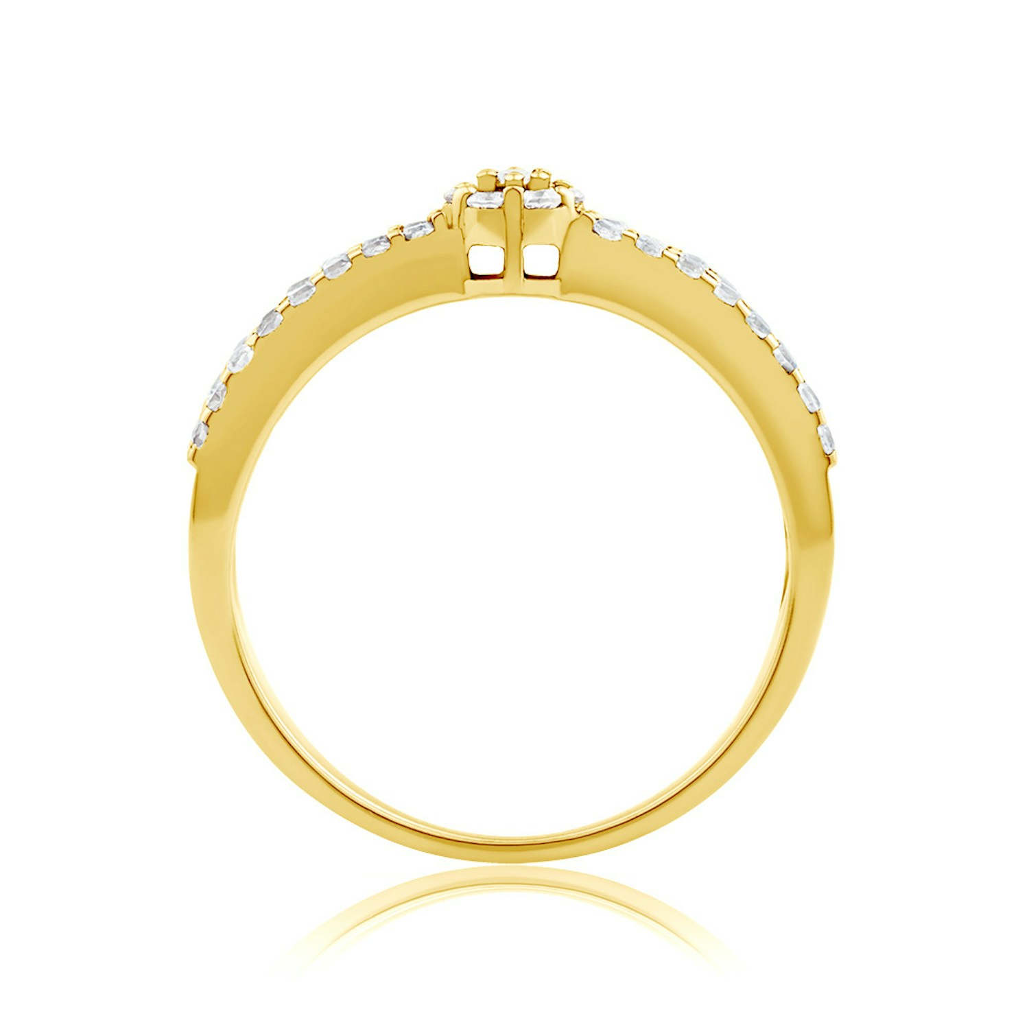 Pierścionek zaręczynowy z 36 diamentami o szlifie brylantowym wysokiej czystości SI2/H, o łącznej masie 0,25 ct , oraz 7 diamentami o szlifie brylantowym wysokiej czystości SI2/H, o łącznej masie 0,08 ct Wykonany z 14-karatowego żółtego złota (próba 0,585).
