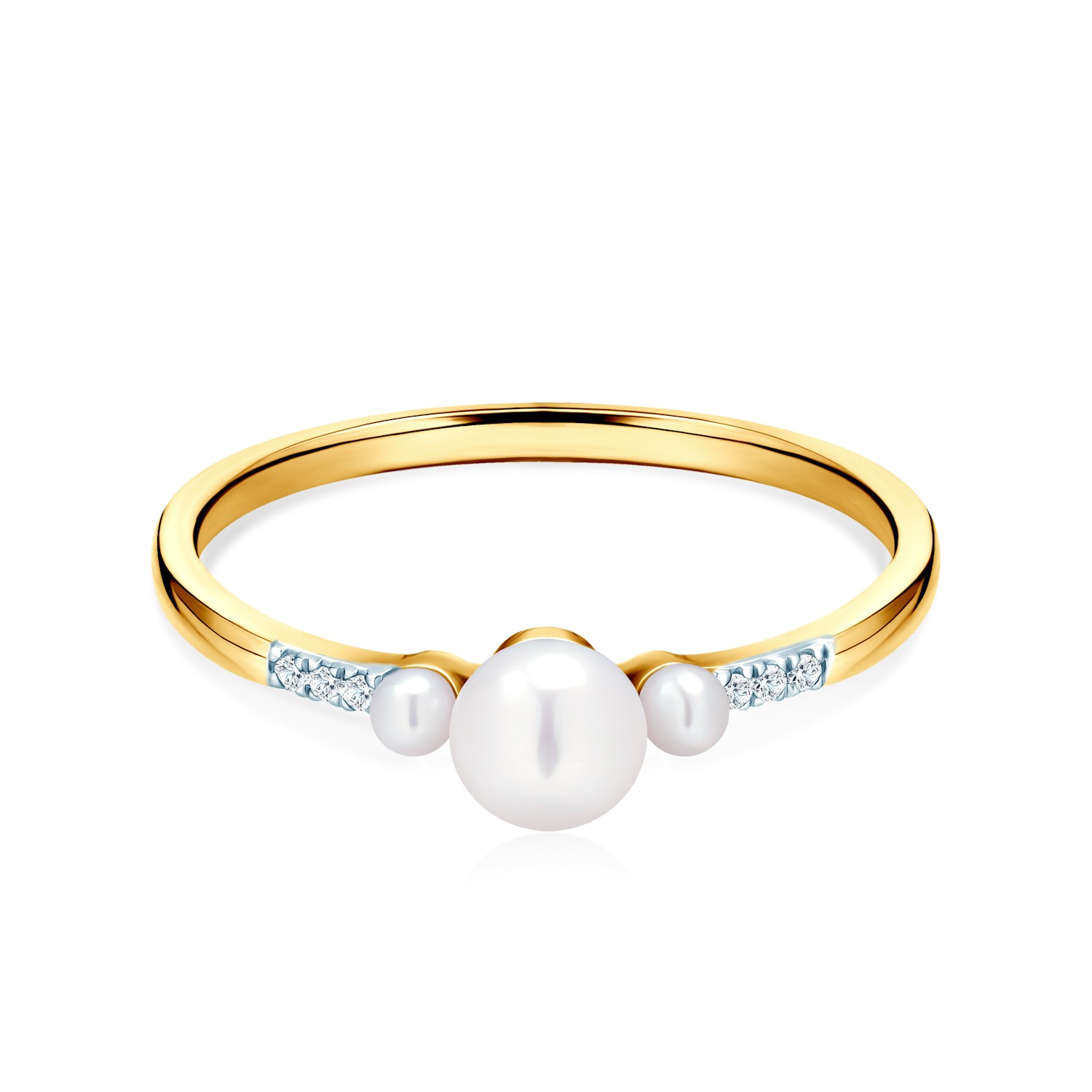 Pierścionek zaręczynowy z 3 perłami i 6 diamentami o łącznej masie 0,02 ct, szlifie brylantowym oraz wysokiej czystości SI2/H. Wykonany z 14-karatowego żółtego złota (próba 585).