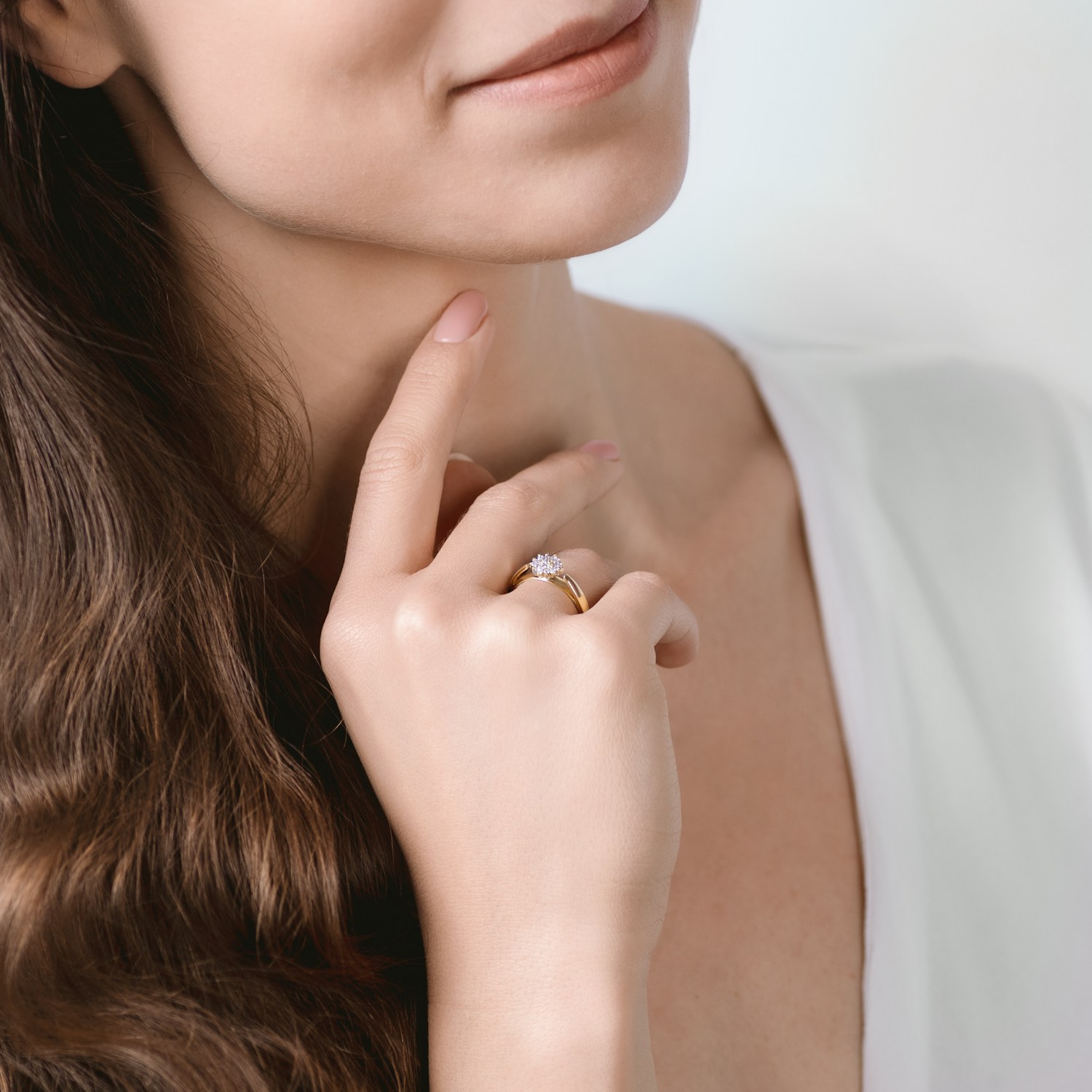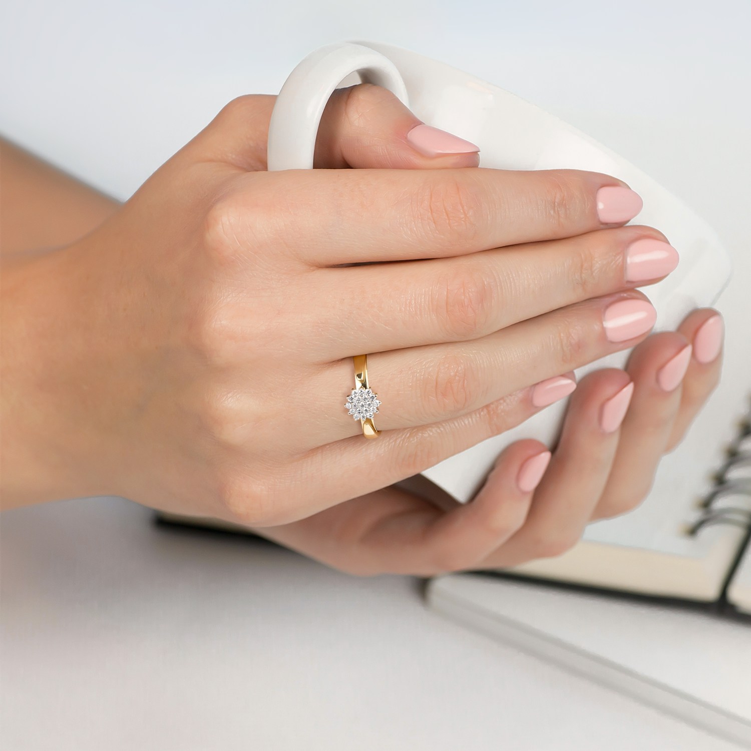 Pierścionek z diamentami o szlifie brylantowym wysokiej czystości SI/H, o łącznej masie 0,18 ct. Wykonany z 14-karatowego żółtego złota (próba 0,585).