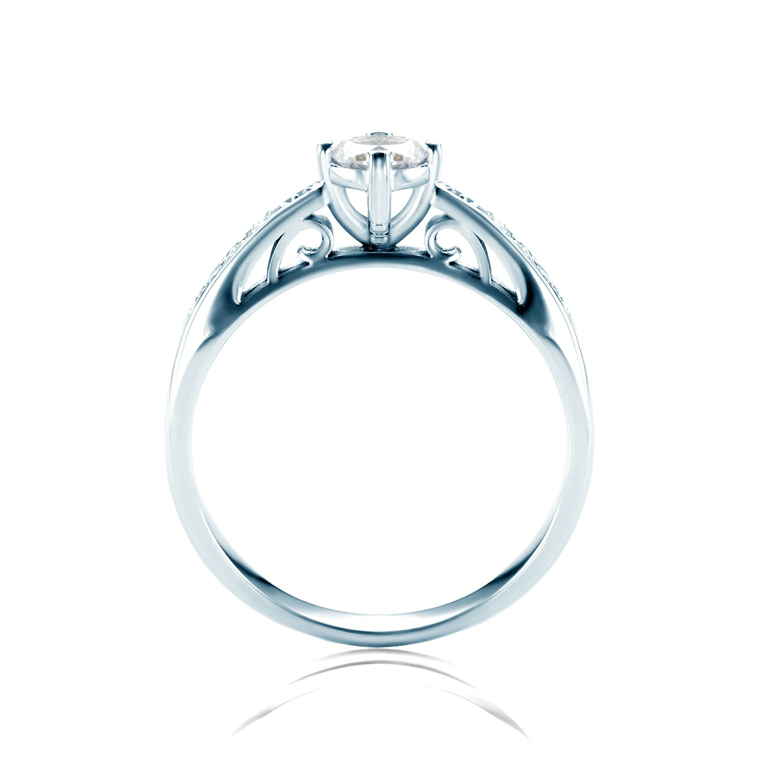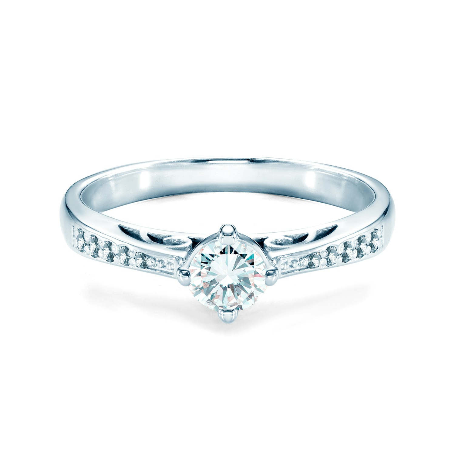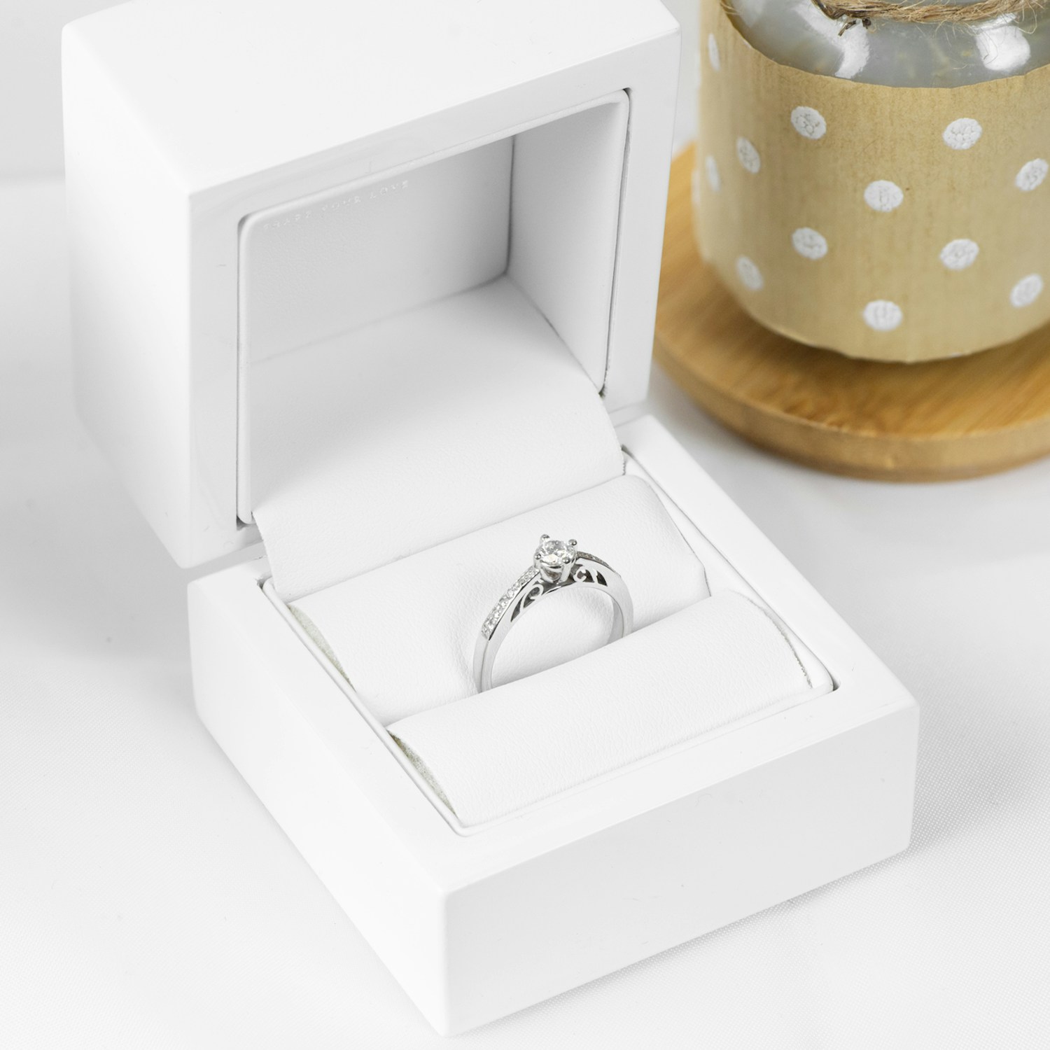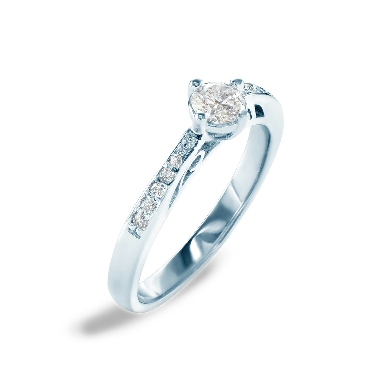 Pierścionek zaręczynowy z diamentami o szlifie brylantowym wysokiej czystości SI/H, o łącznej masie 0,35 ct. Wykonany z 14-karatowego białego złota (próba 0,585).