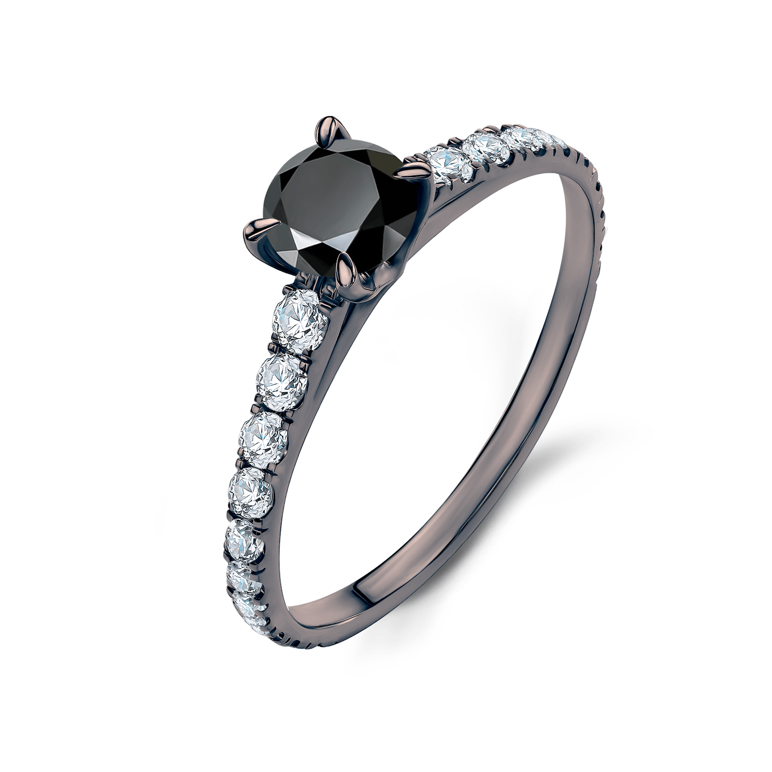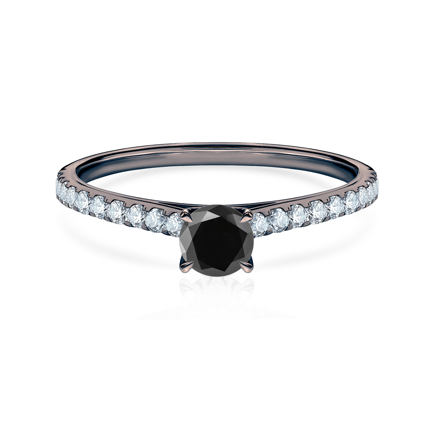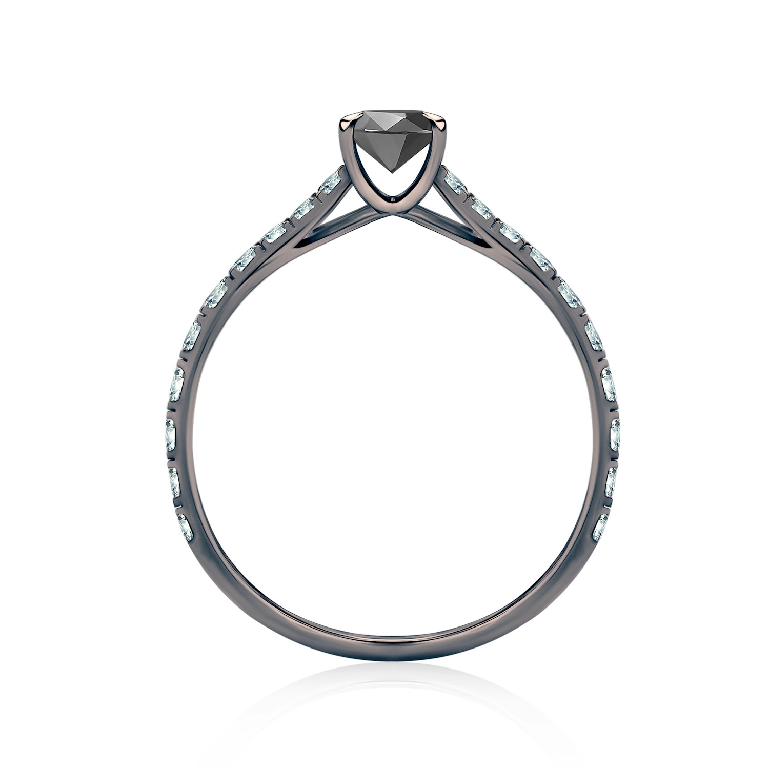 Pierścionek zaręczynowy z centralnie umieszczonym czarnym diamentem o masie 0,18 ct, wysokiej czystości i kolorze SI/H oraz perfekcyjnym szlifie brylantowym. Boczne diamenty posiadają łączną masę 0,2 ct, nieskazitelną czystość i kolor SI/H z doskonałym szlifem brylantowym. Wykonany z 14-karatowego czarnego złota (próba 585).