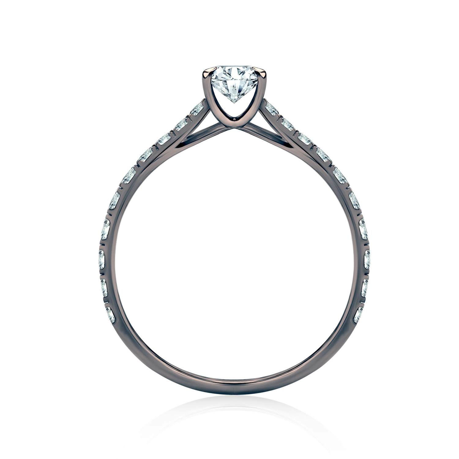 Pierścionek zaręczynowy z centralnie umieszczonym diamentem o masie 0,18 ct, wysokiej czystości i kolorze SI/H oraz perfekcyjnym szlifie brylantowym. Boczne diamenty posiadają łączną masę 0,2 ct, nieskazitelną czystość i kolor SI/H z doskonałym szlifem brylantowym. Wykonany z 14-karatowego czarnego złota (próba 585).