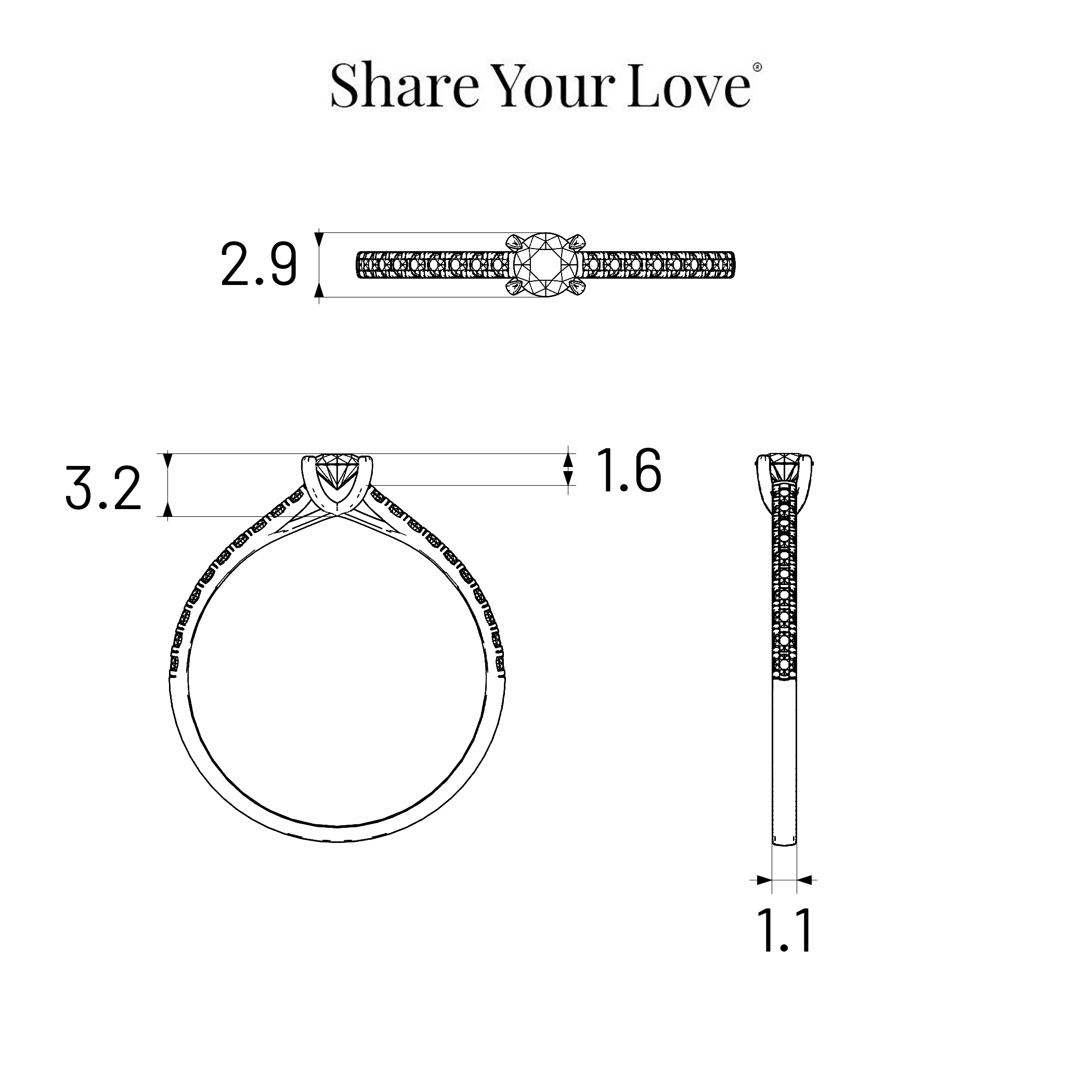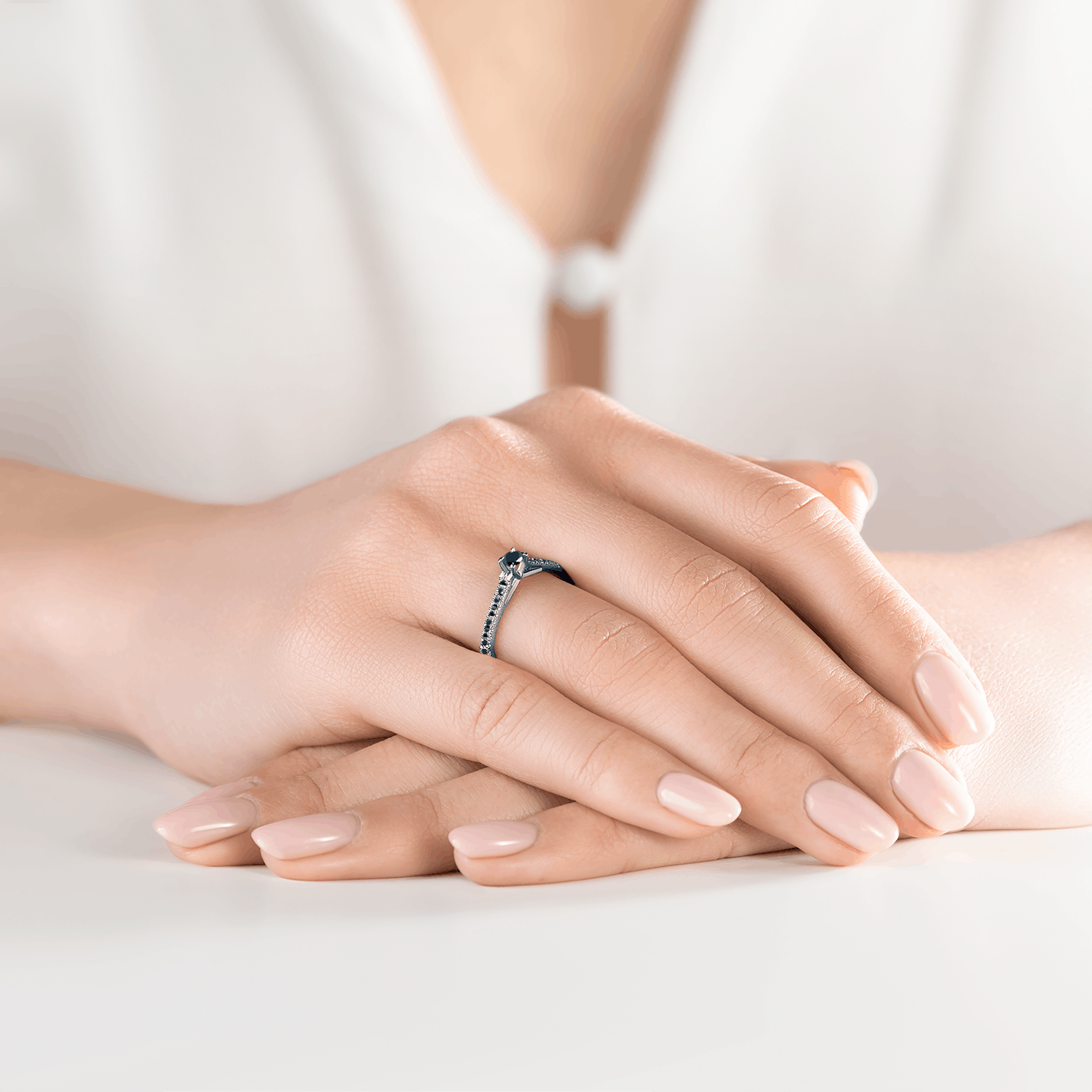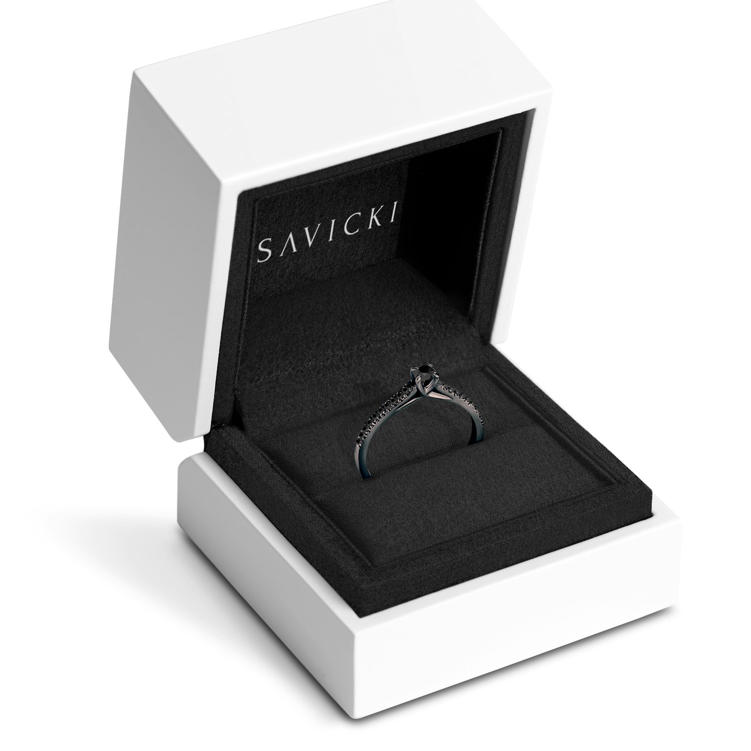 Pierścionek zaręczynowy z centralnie umieszczonym czarnym diamentem o masie 0,09 ct, wysokiej czystości i kolorze SI/H oraz perfekcyjnym szlifie brylantowym. Boczne czarne diamenty posiadają łączną masę 0,1 ct, nieskazitelną czystość i kolor SI/H z doskonałym szlifem brylantowym. Wykonany z 14-karatowego czarnego złota (próba 585).