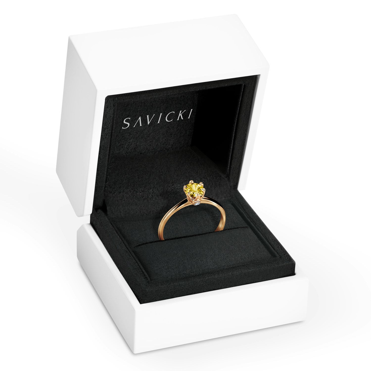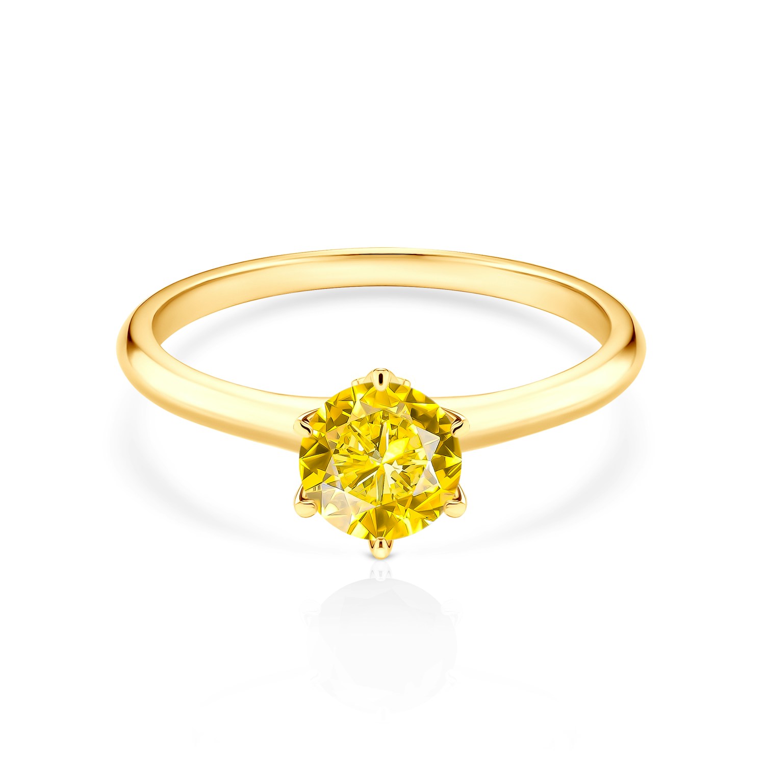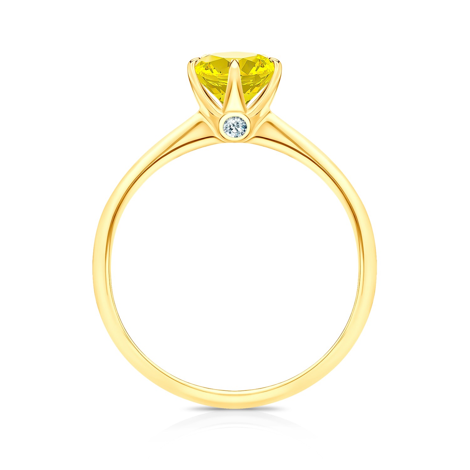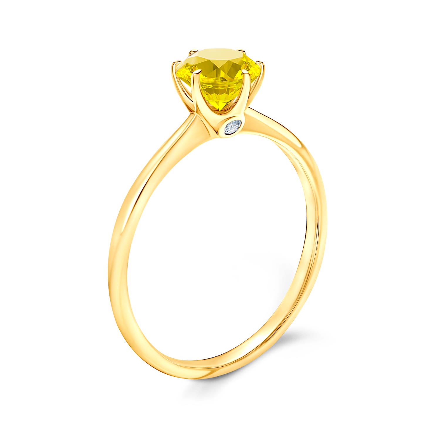 Pierścionek zaręczynowy z centralnie umieszczonym żółtym szafirem o masie 0,50 ct oraz dwoma diamentami o łącznej masie 0,03 ct, wysokiej czystości SI/H, o szlifie brylantowym. Wykonany z 14-karatowego żółtego złota (próba 0,585).