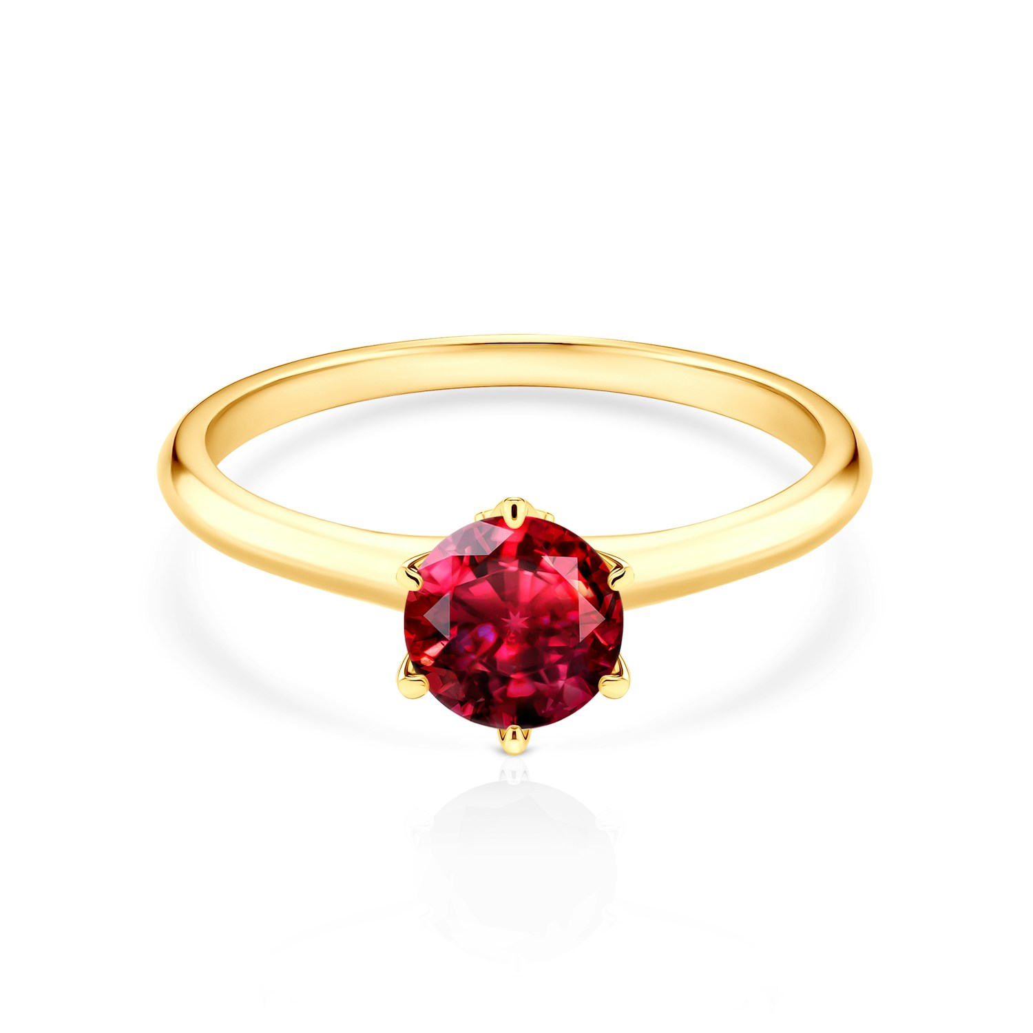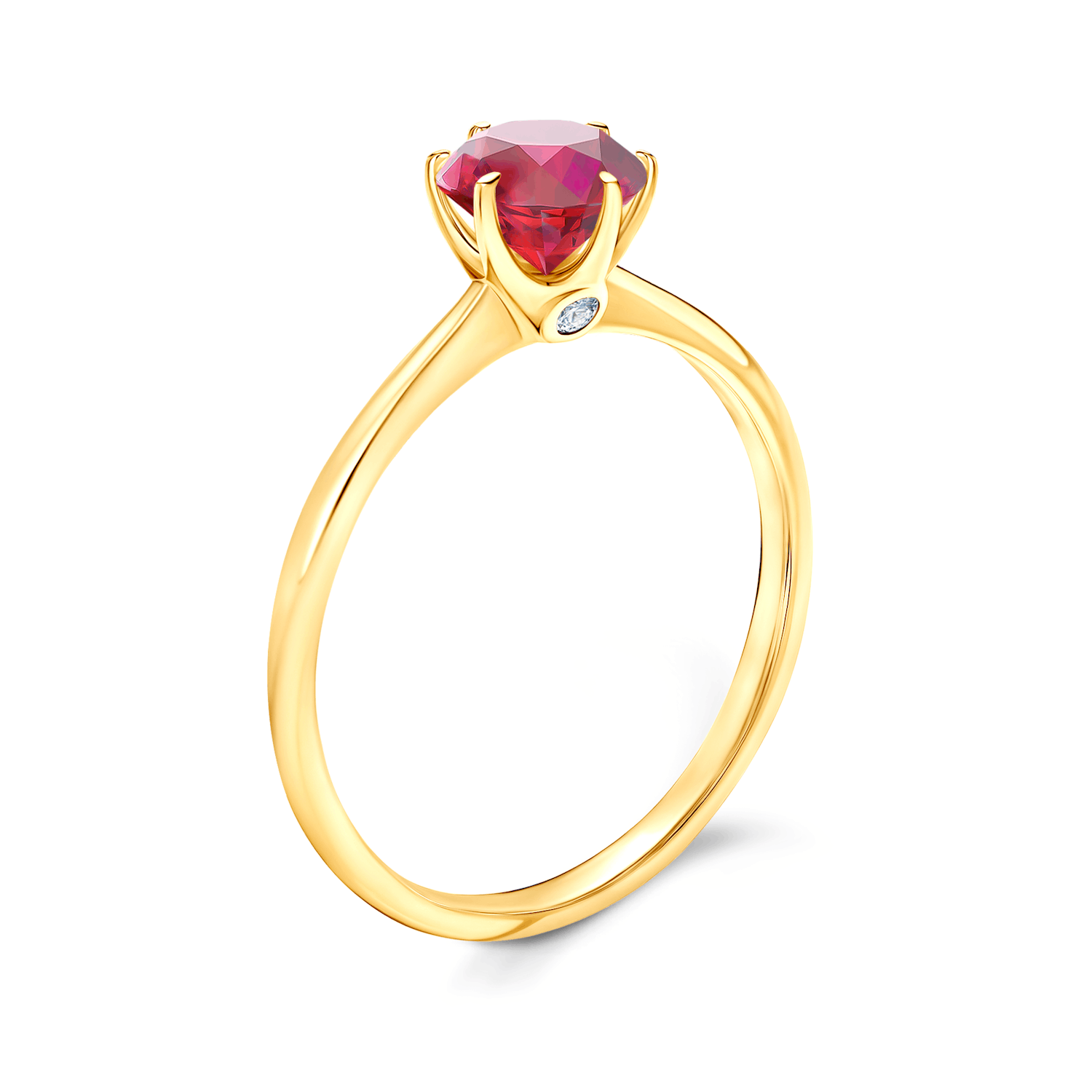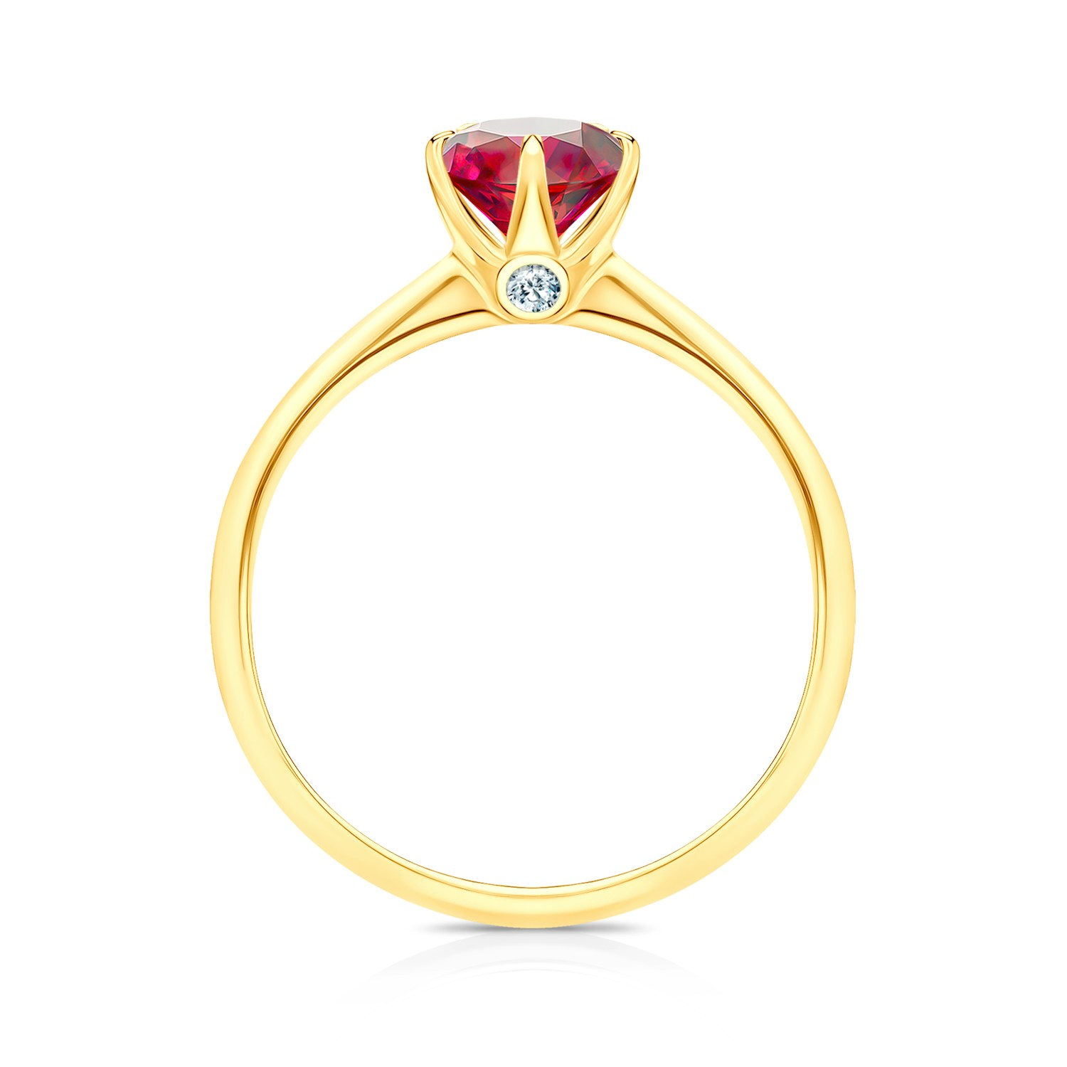 Pierścionek zaręczynowy z centralnie umieszczonym rubinem o masie 0,50 ct oraz dwoma diamentami o łącznej masie 0,03 ct, wysokiej czystości SI/H, o szlifie brylantowym. Wykonany z 14-karatowego żółtego złota (próba 0,585).