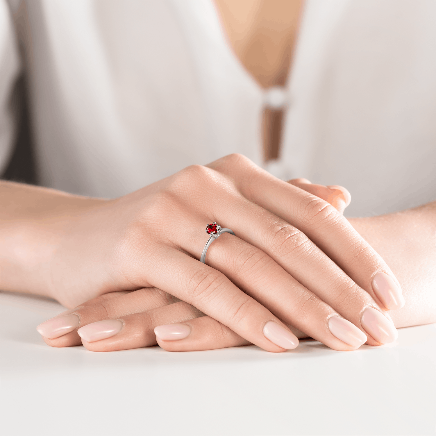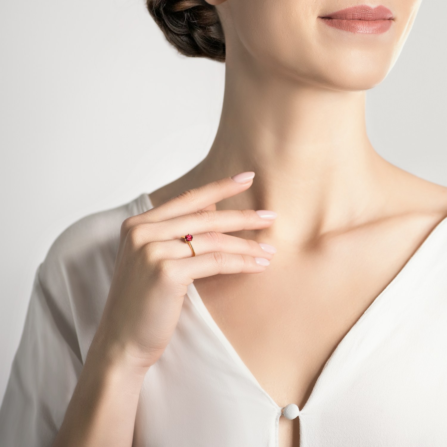 Zdjęcia przedstawiają pierścionek z rubinem o masie 0,50 ct oraz diamentami o łącznej masie 0,03 ct.