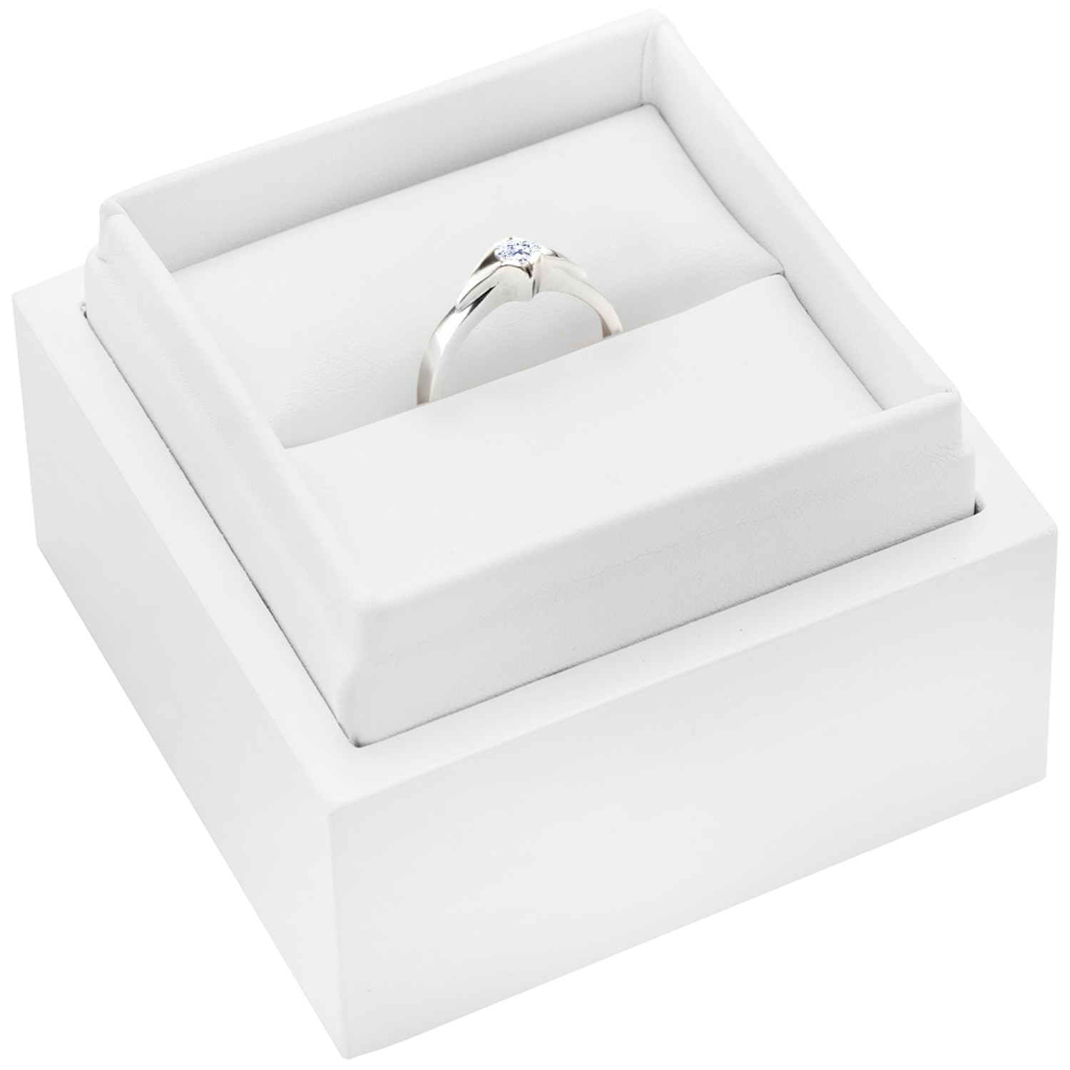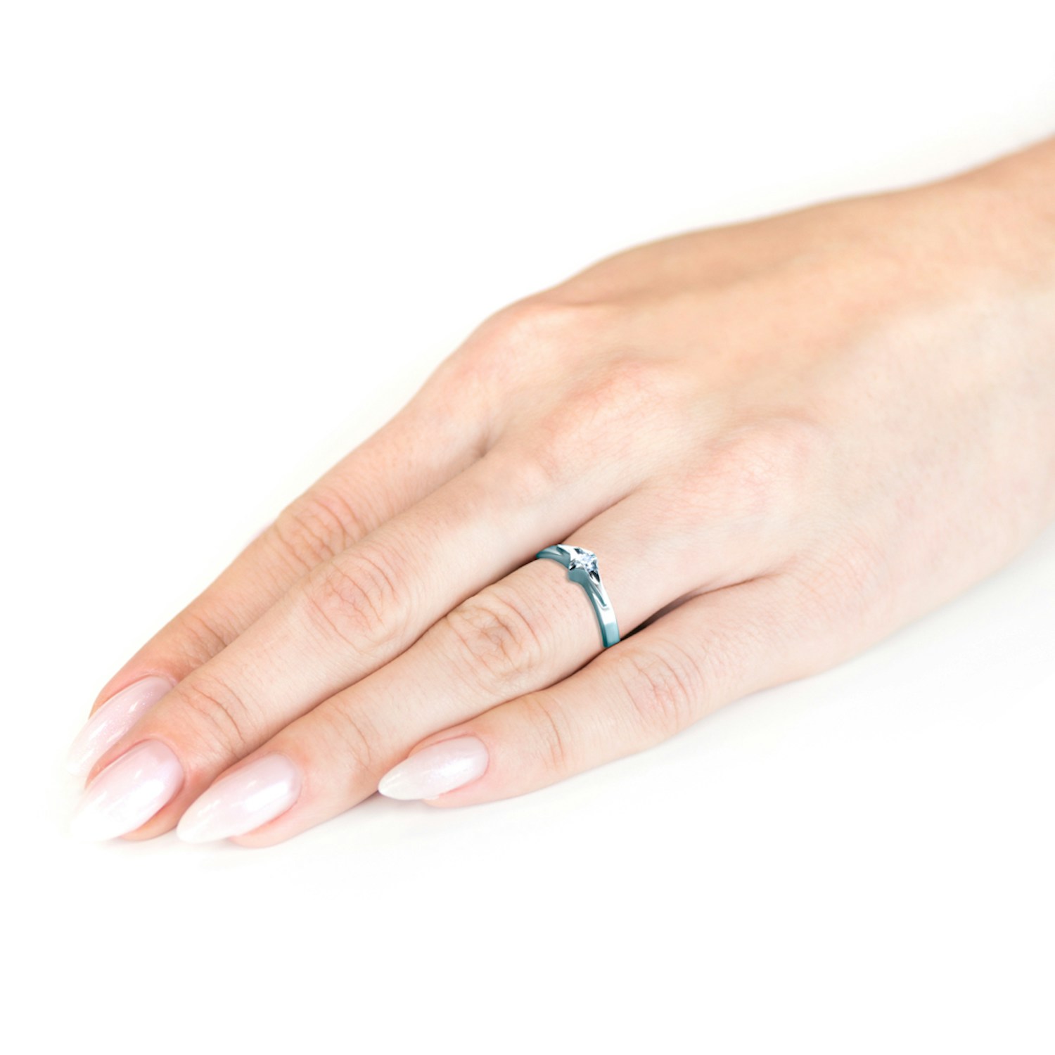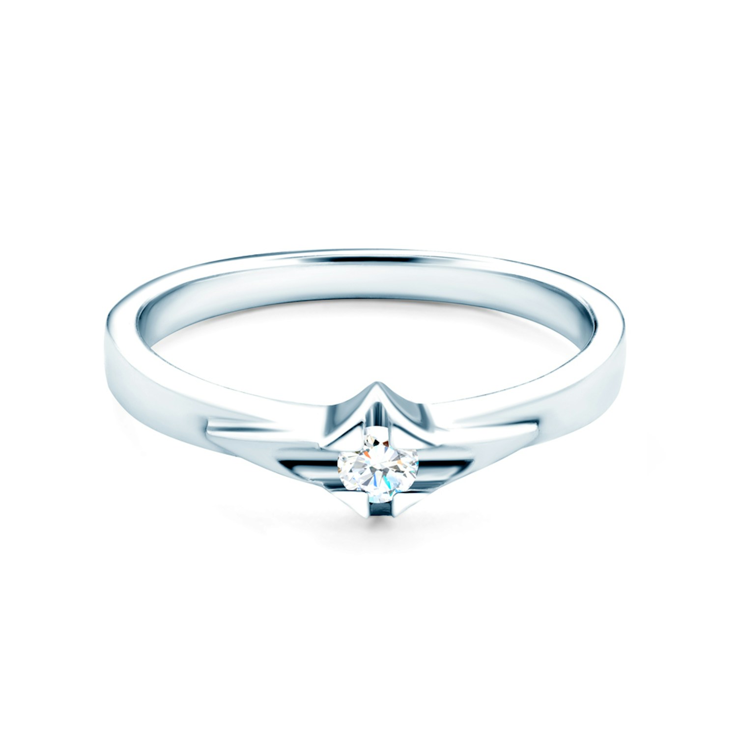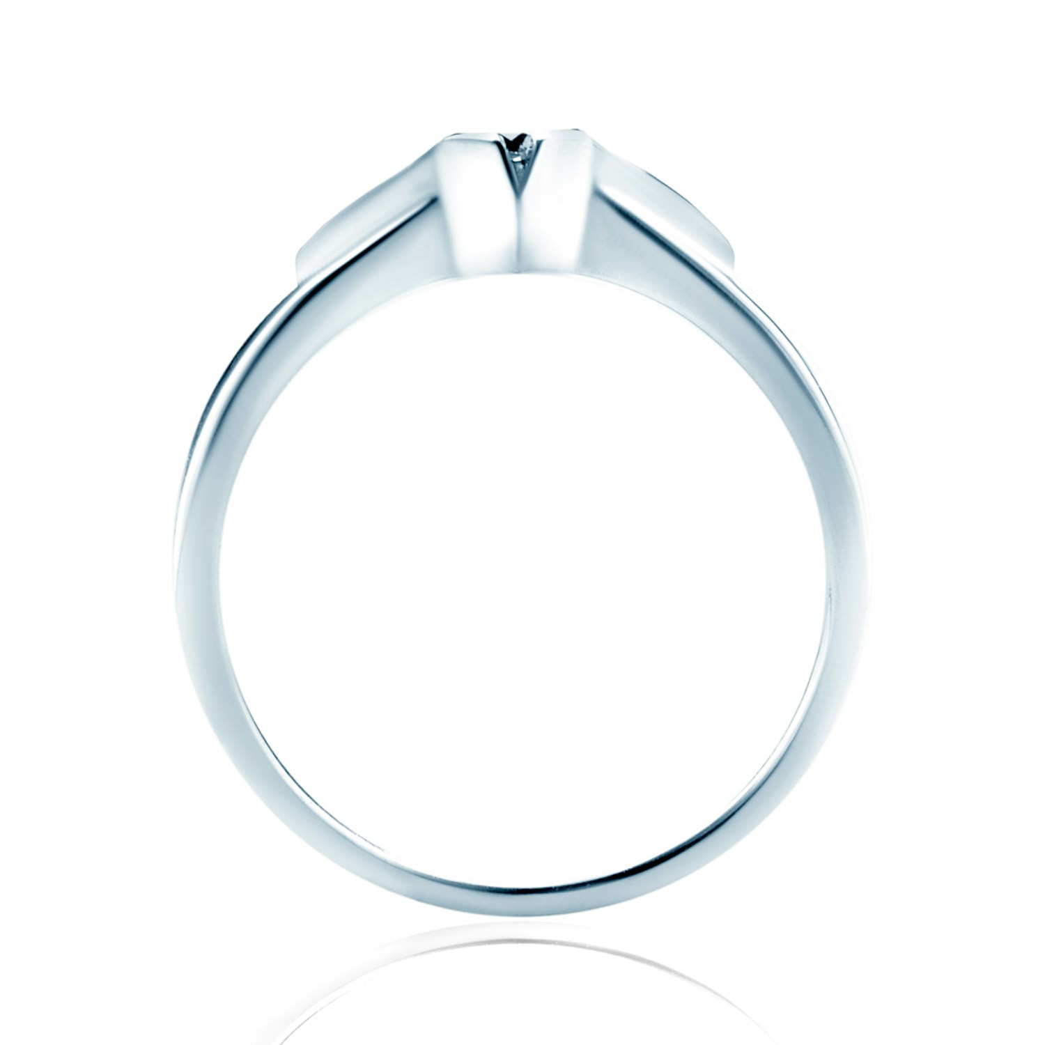 Pierścionek zaręczynowy z centralnie umieszczonym diamentem 0,09 ct o perfekcyjnym szlifie brylantowym, wysokiej czystości i kolorze SI/H (wszystkie diamenty w naszym sklepie objęte są wieczystą gwarancją oraz posiadają oryginalny certyfikat jakości, wystawiany przez naszą firmę). Wykonany z 14-karatowego białego złota (próba 585).