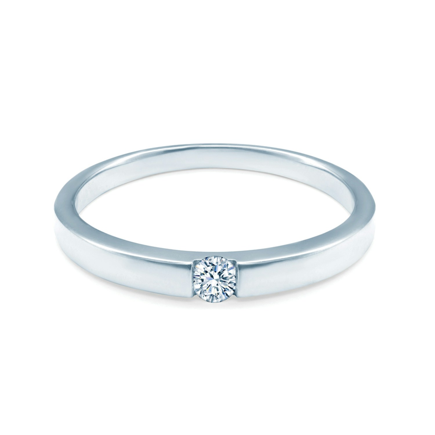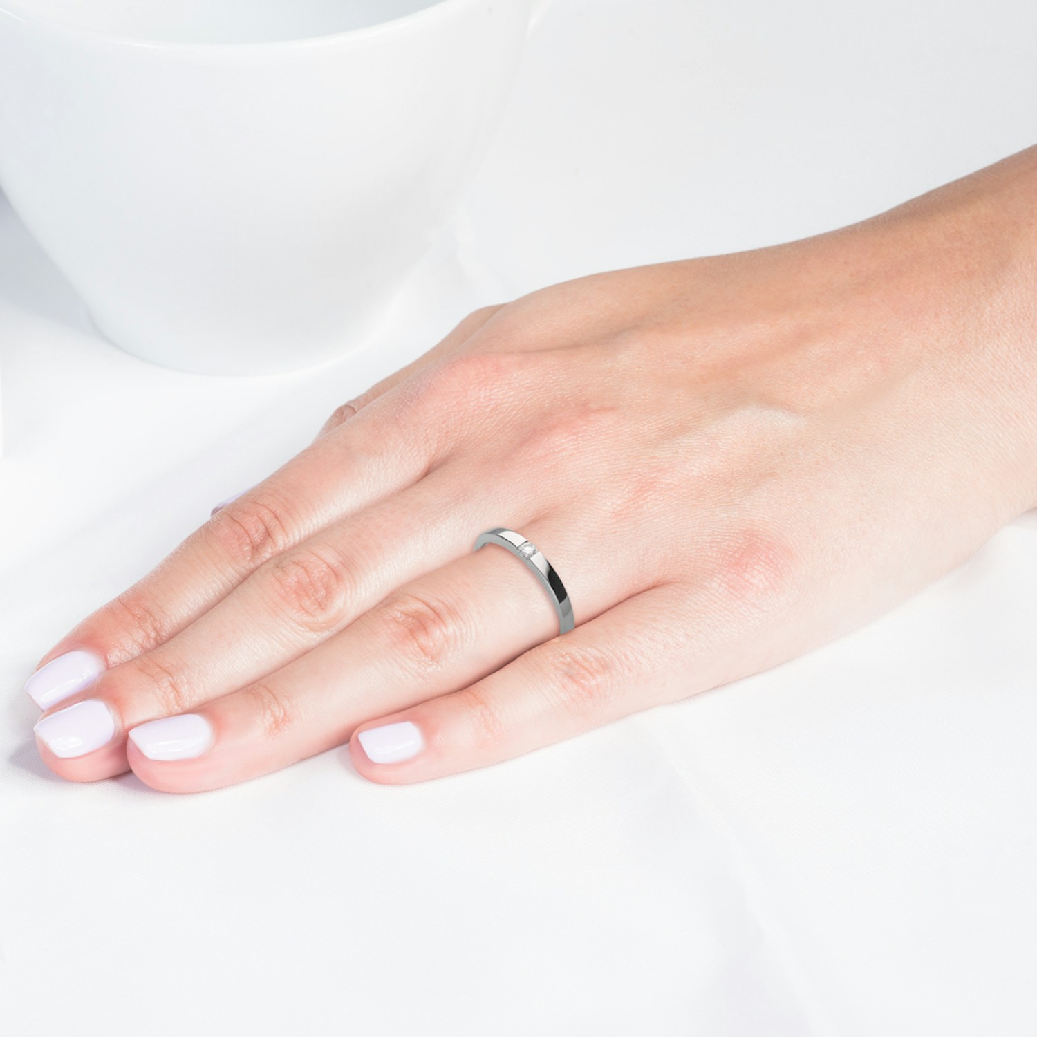 Pierścionek zaręczynowy z centralnie umieszczonym diamentem 0,06 ct o perfekcyjnym szlifie brylantowym, wysokiej czystości i kolorze SI1/H (wszystkie diamenty w naszym sklepie objęte są wieczystą gwarancją oraz posiadają oryginalny certyfikat jakości, wystawiany przez naszą firmę). Wykonany z 14-karatowego białego złota (próba 585).
