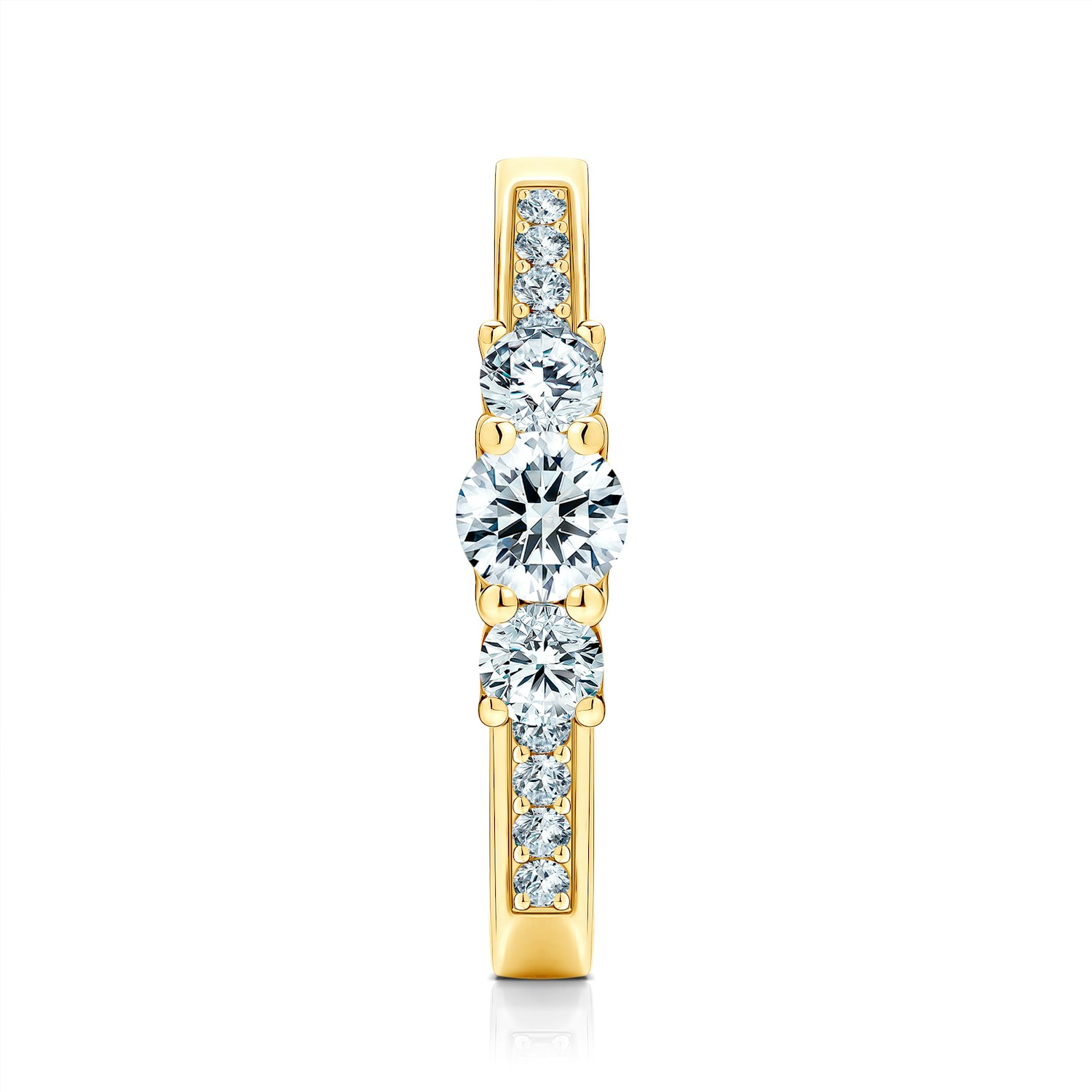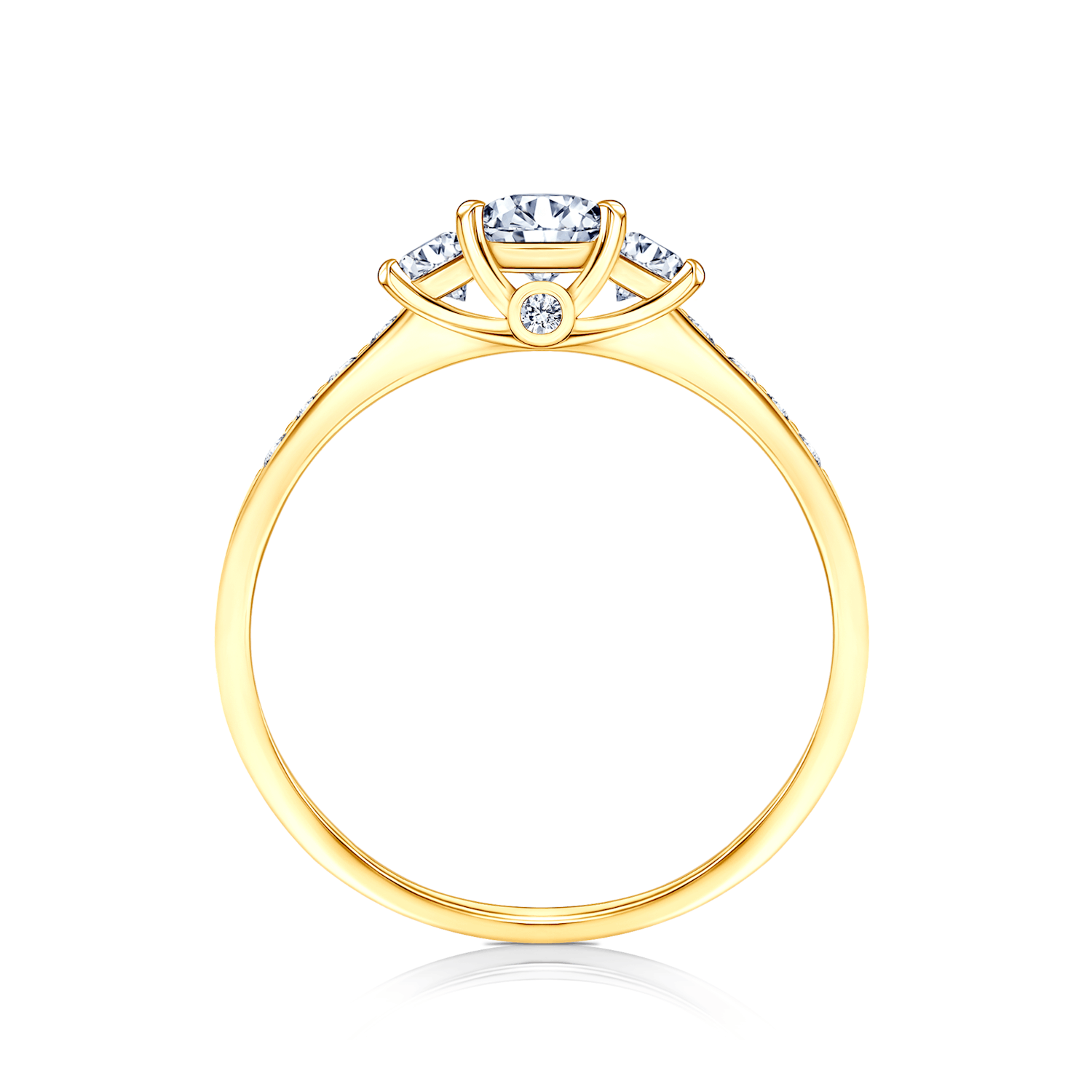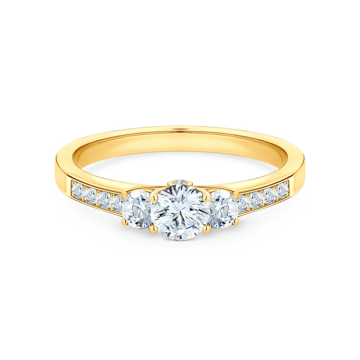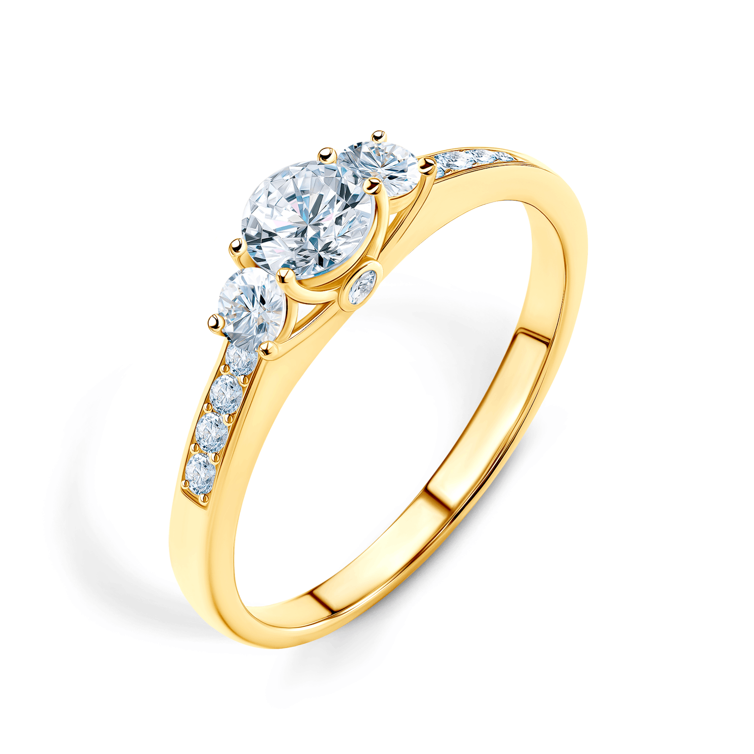 Pierścionek zaręczynowy z centralnie umieszczonym białym szafirem o masie 0,20 ct oraz dwoma białymi szafirami o łącznej masie 0,16 ct. Boczne diamenty posiadają łączną masę 0,104 ct o wysokiej czystości SI/H i szlifie brylantowym. Wykonany z 14-karatowego żółtego złota (próba 585).
