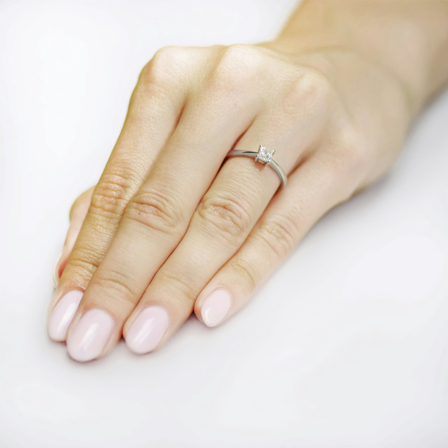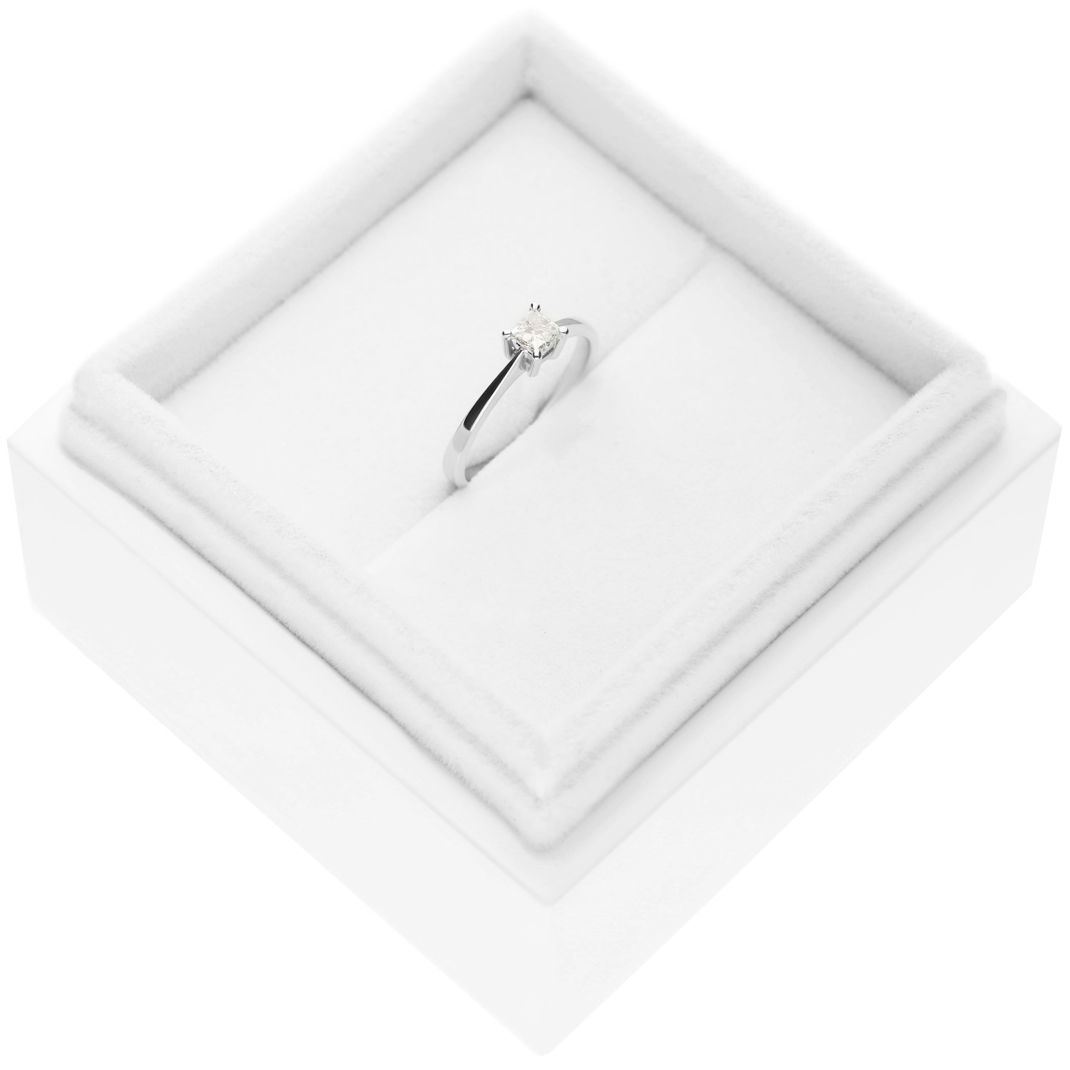 Pierścionek zaręczynowy z centralnie umieszczonym diamentem 0,25 ct o perfekcyjnym szlifie princessa, wysokiej czystości i kolorze SI2/H (wszystkie diamenty w naszym sklepie objęte są wieczystą gwarancją oraz posiadają oryginalny certyfikat jakości, wystawiany przez naszą firmę). Wykonany z 14-karatowego białego złota (próba 585).