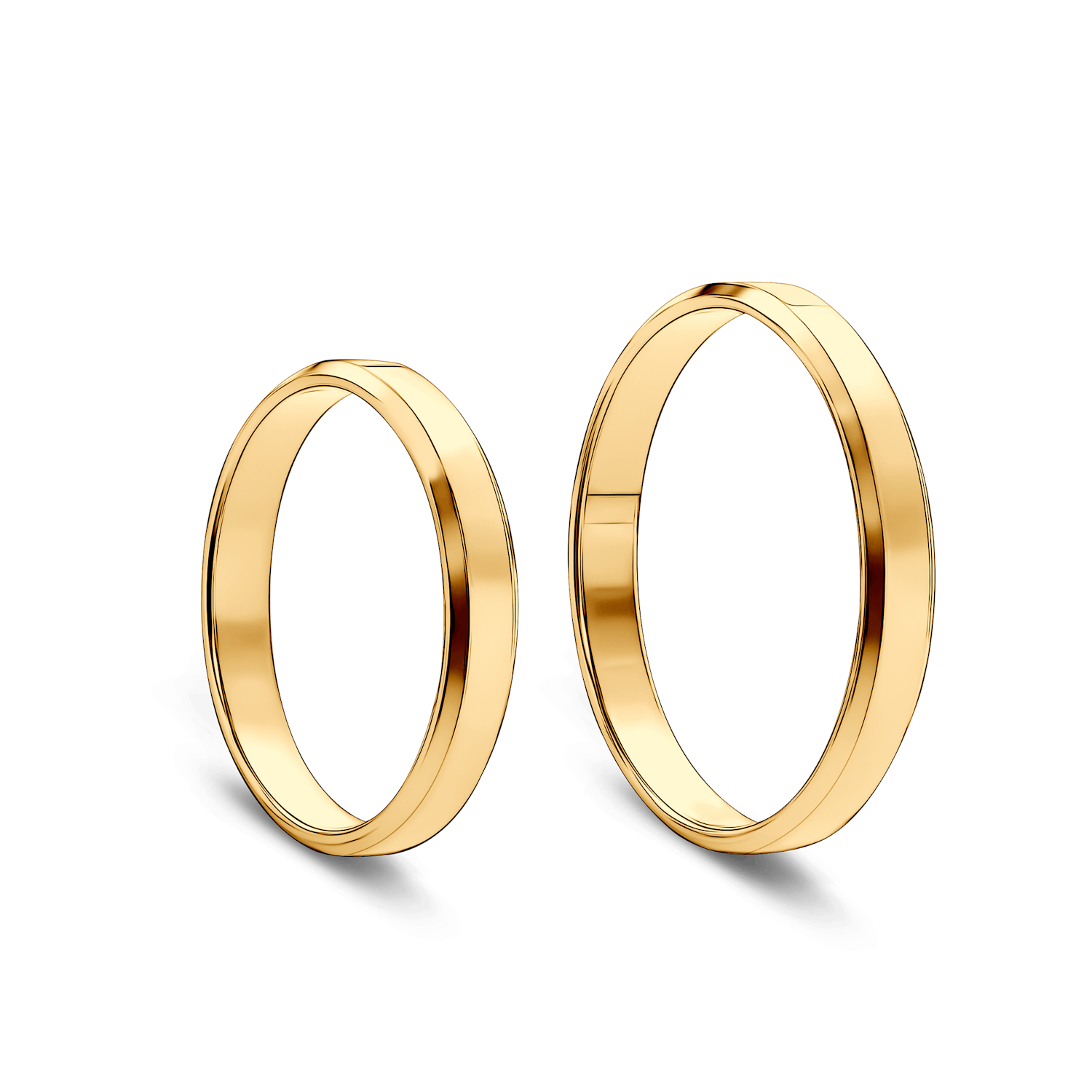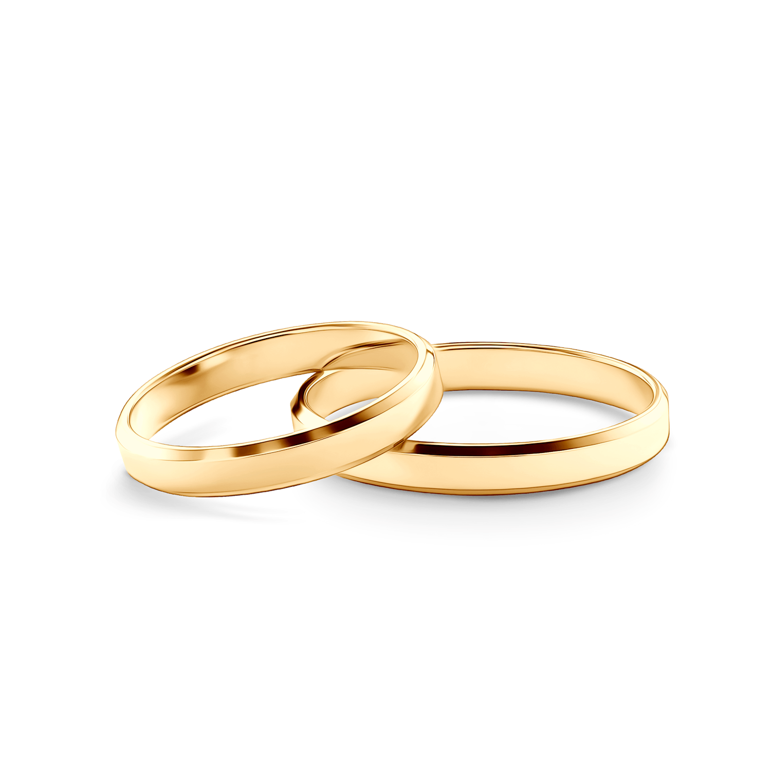 Obrączki ślubne z fazą o klasycznym wzorze, wykonane z żółtego złota (próba 0,333/0,585/0,750), o szerokości 3 mm.