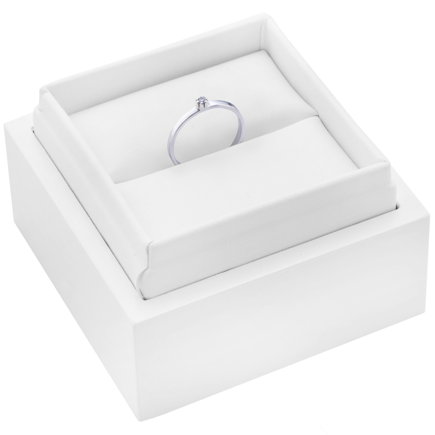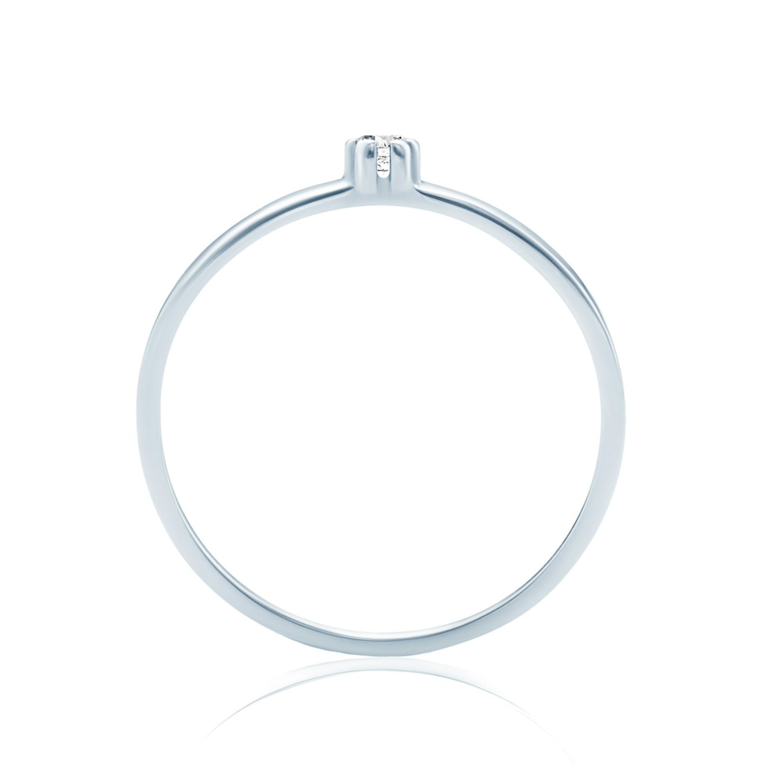 Pierścionek zaręczynowy z centralnie umieszczonym diamentem 0,04 ct o perfekcyjnym szlifie brylantowym (wszystkie diamenty w naszym sklepie objęte są wieczystą gwarancją oraz posiadają oryginalny certyfikat jakości, wystawiany przez naszą firmę). Wykonany z 14-karatowego białego złota (próba 585).