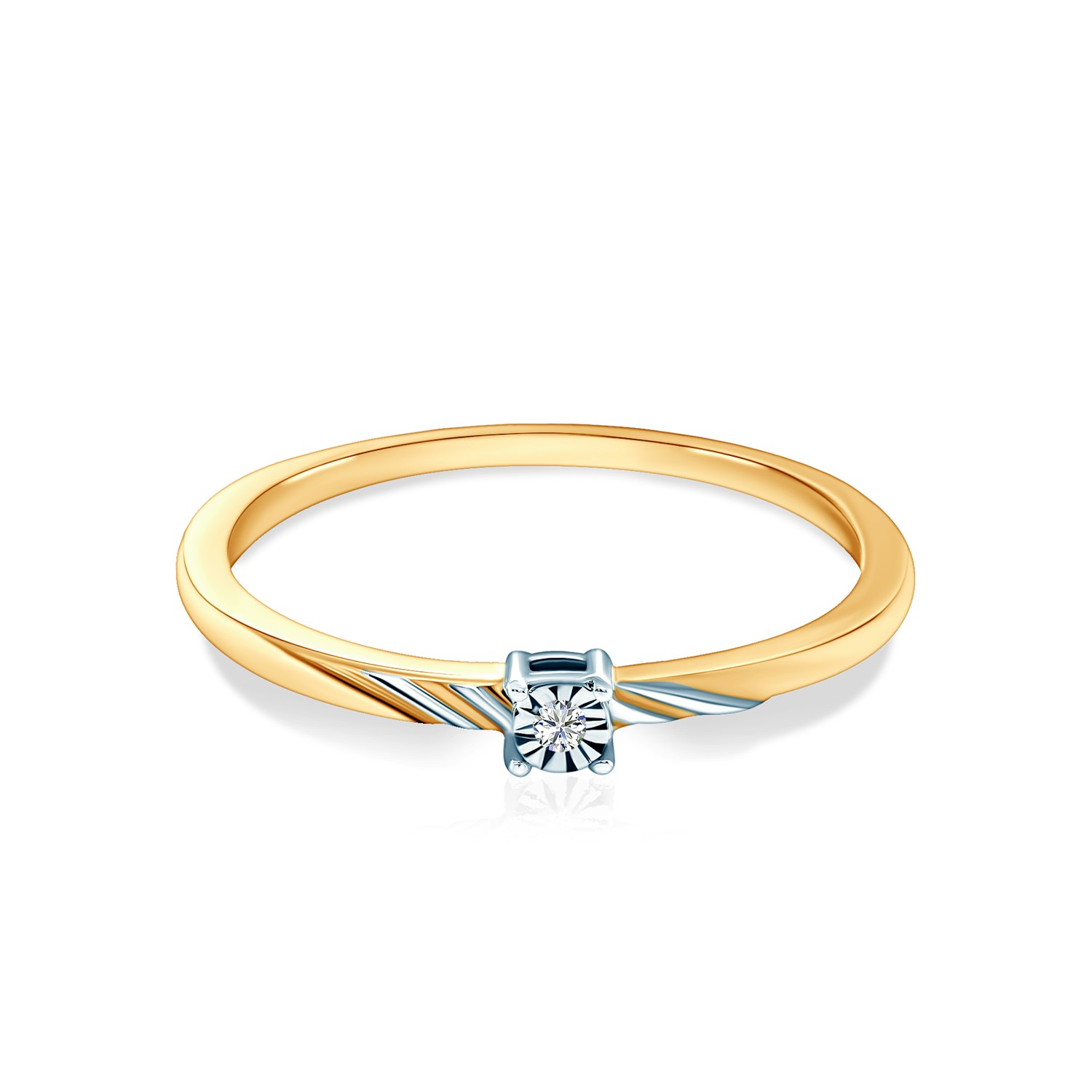 | Pierścionek zaręczynowy z diamentem o masie 0,01ct i parametrach SI2/H w szlifie brylantowym. Wykonany został z 14-karatowego dwukolorowego złota (próba 585). |