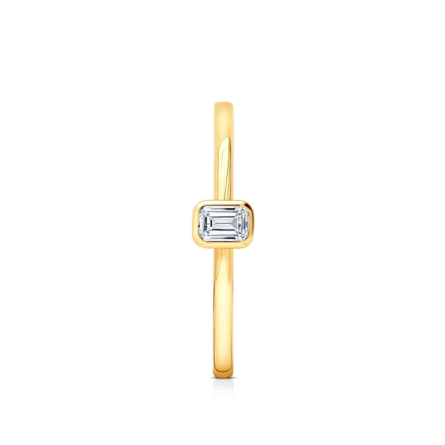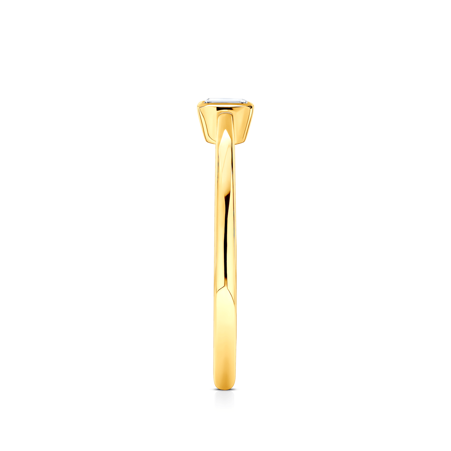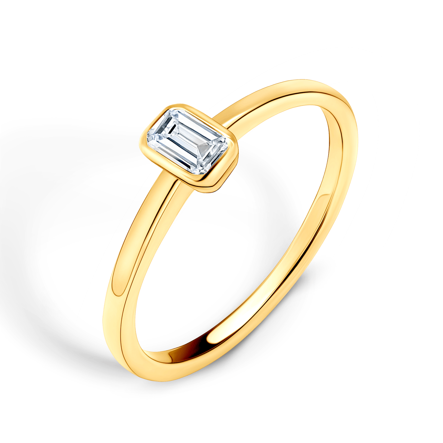 Pierścionek zaręczynowy z centralnie umieszczonym diamentem o masie 0,2 ct wysokiej czystości VS/G, o szlifie szmaragdowym. Wykonany z 14-karatowego żółtego złota (próba 0,585).