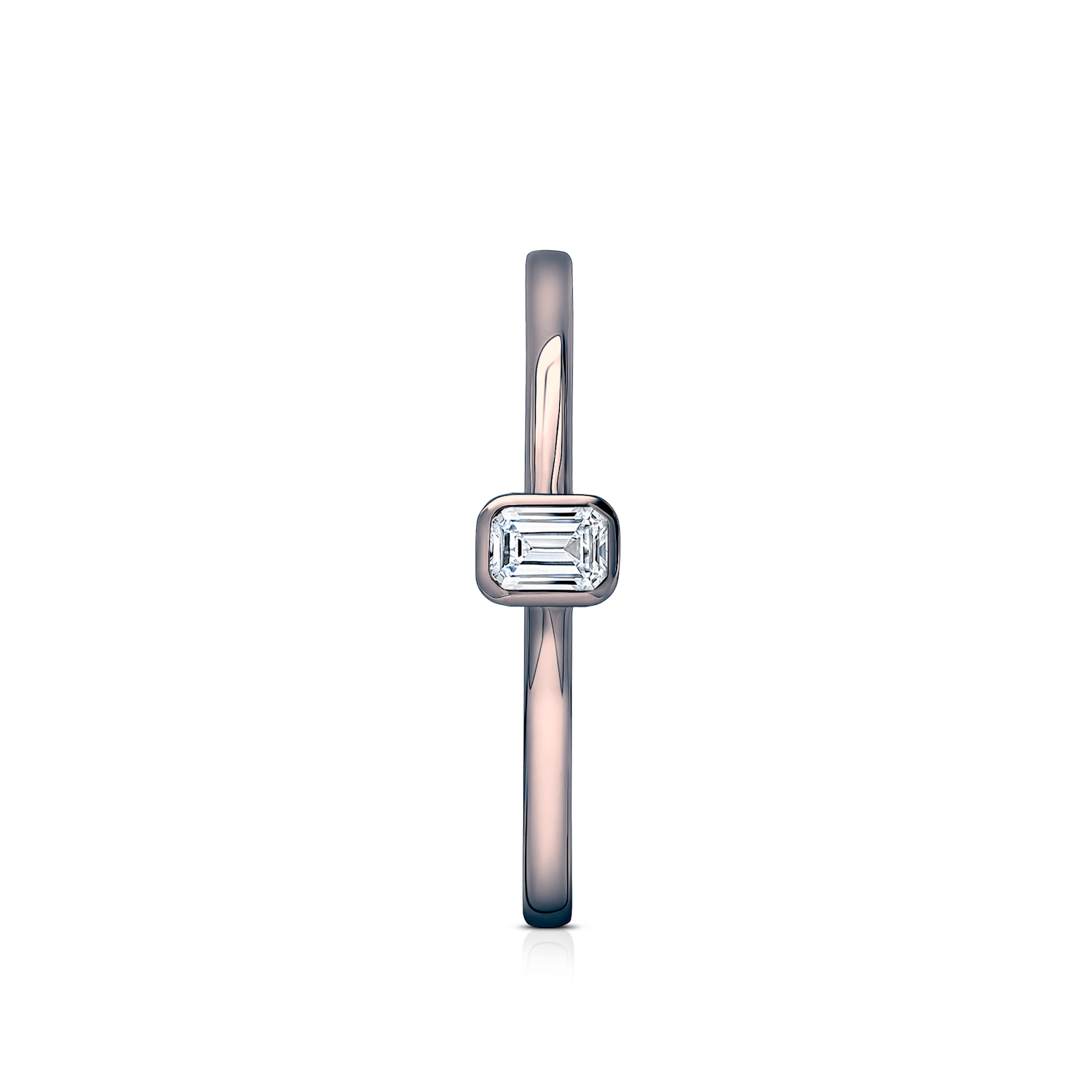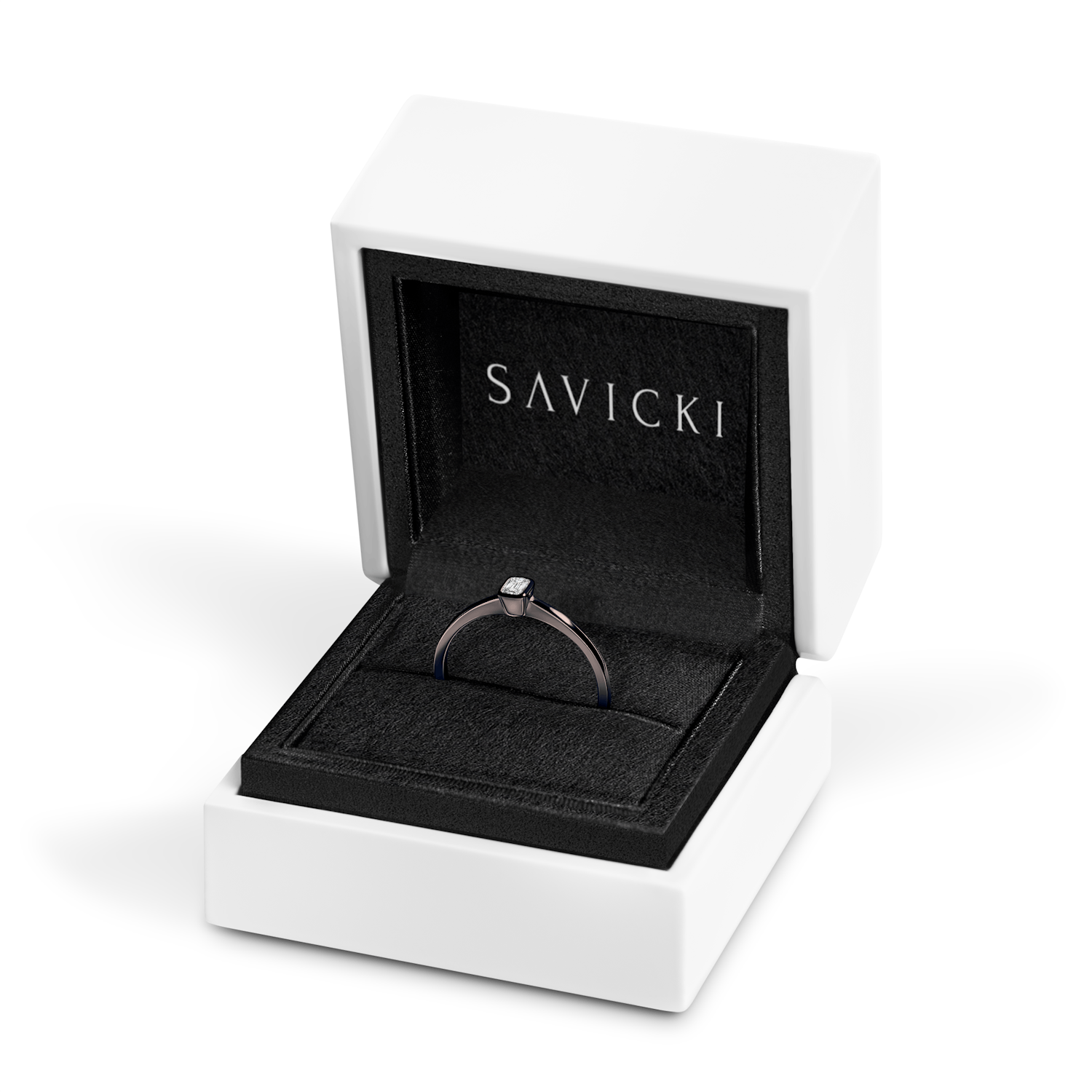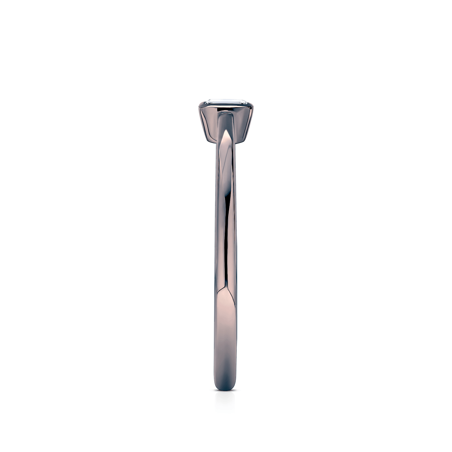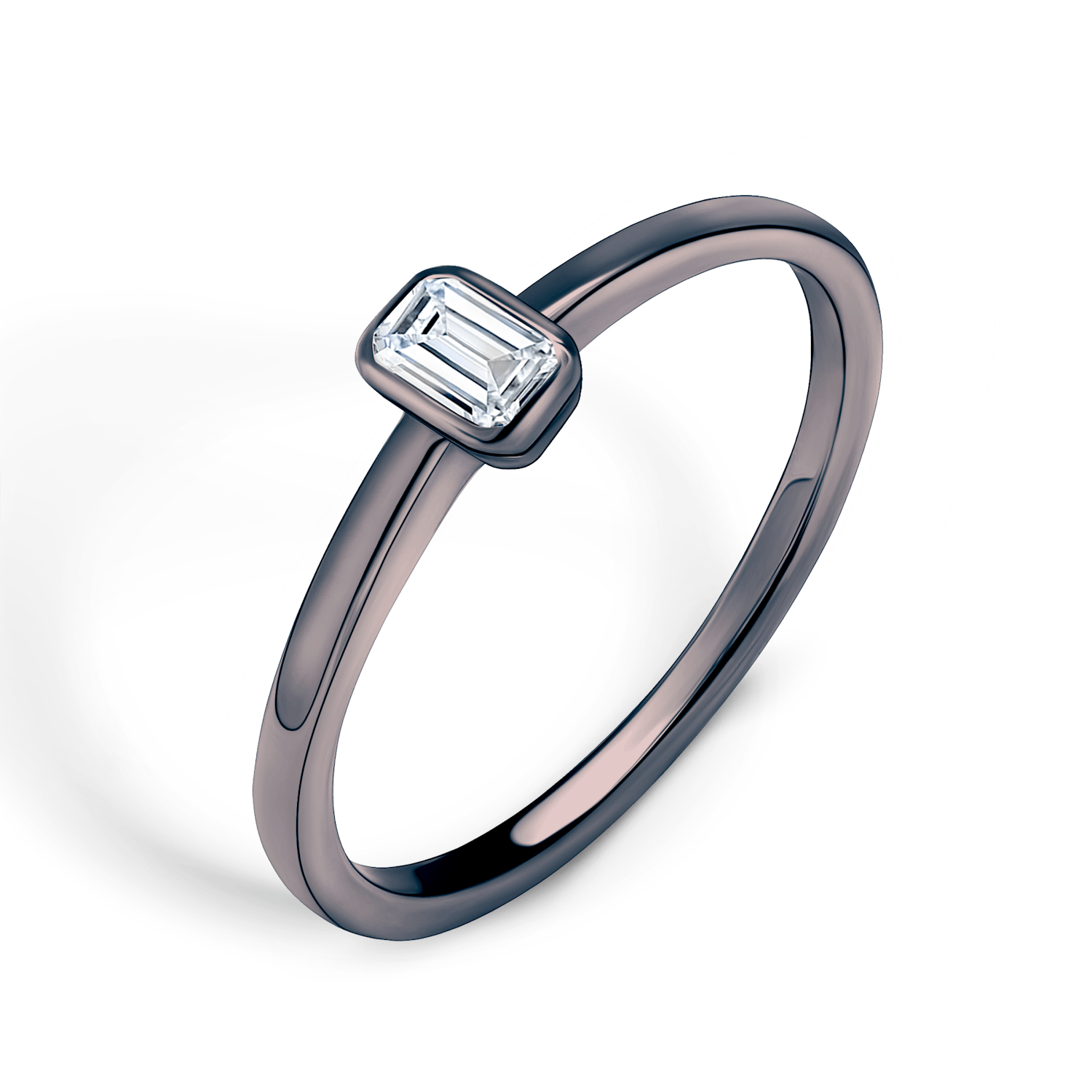 Pierścionek zaręczynowy z centralnie umieszczonym diamentem o masie 0,14 ct wysokiej czystości VS/G, o szlifie szmaragdowym. Wykonany z 14-karatowego czarnego złota (próba 0,585).
