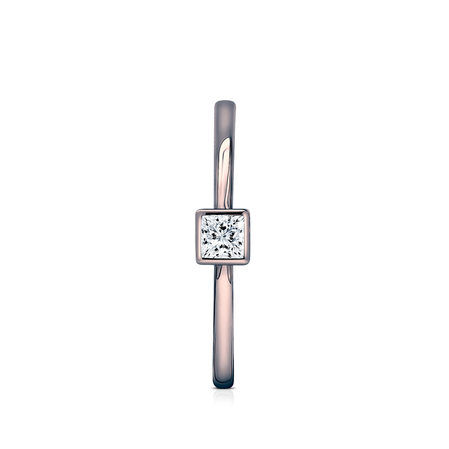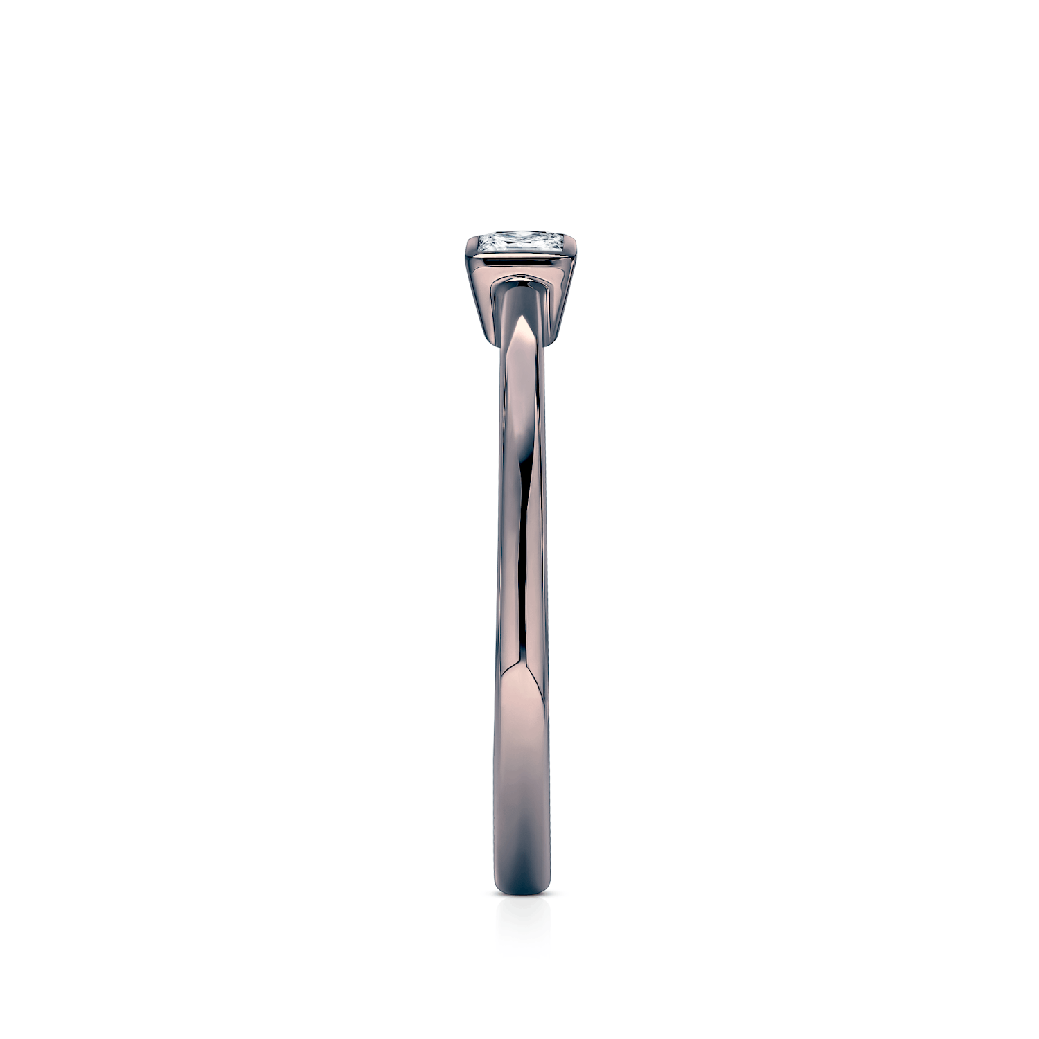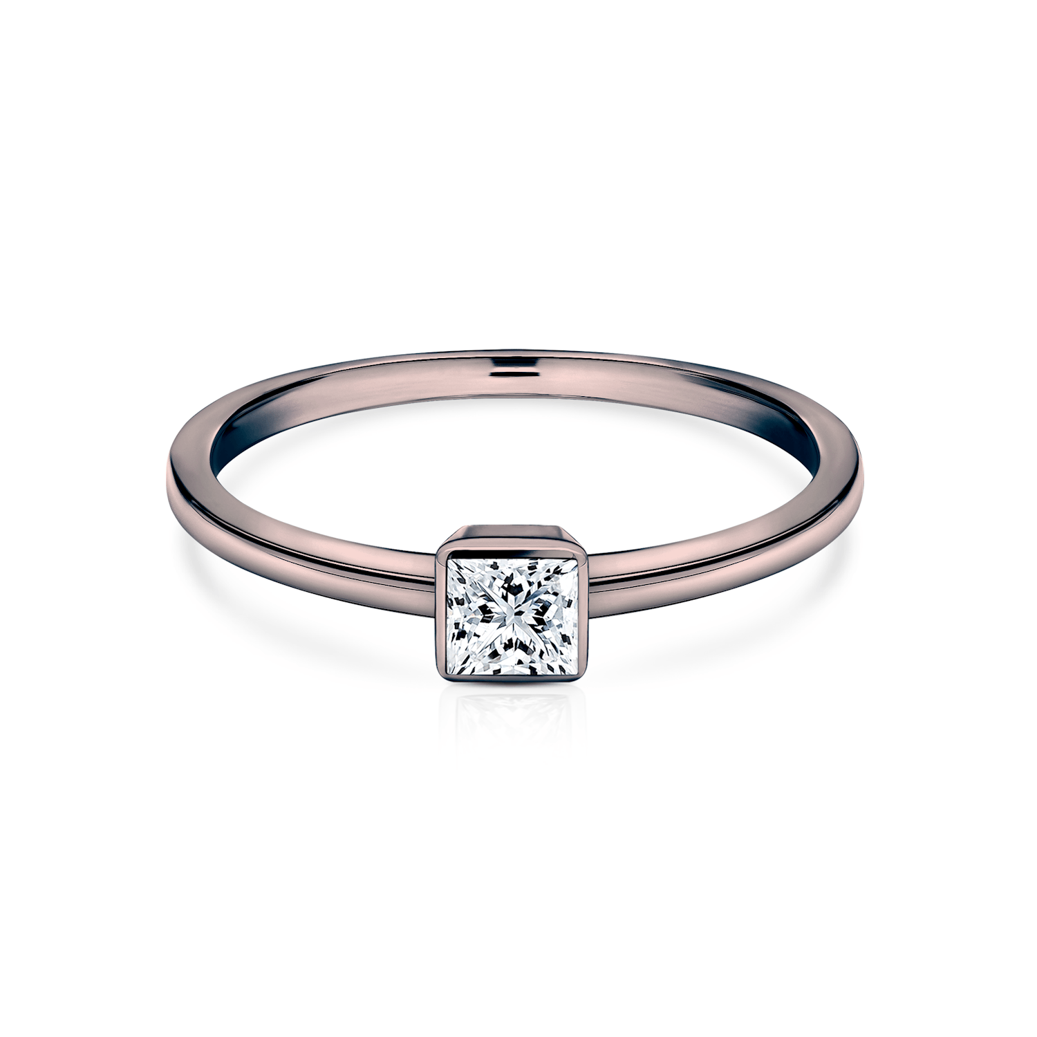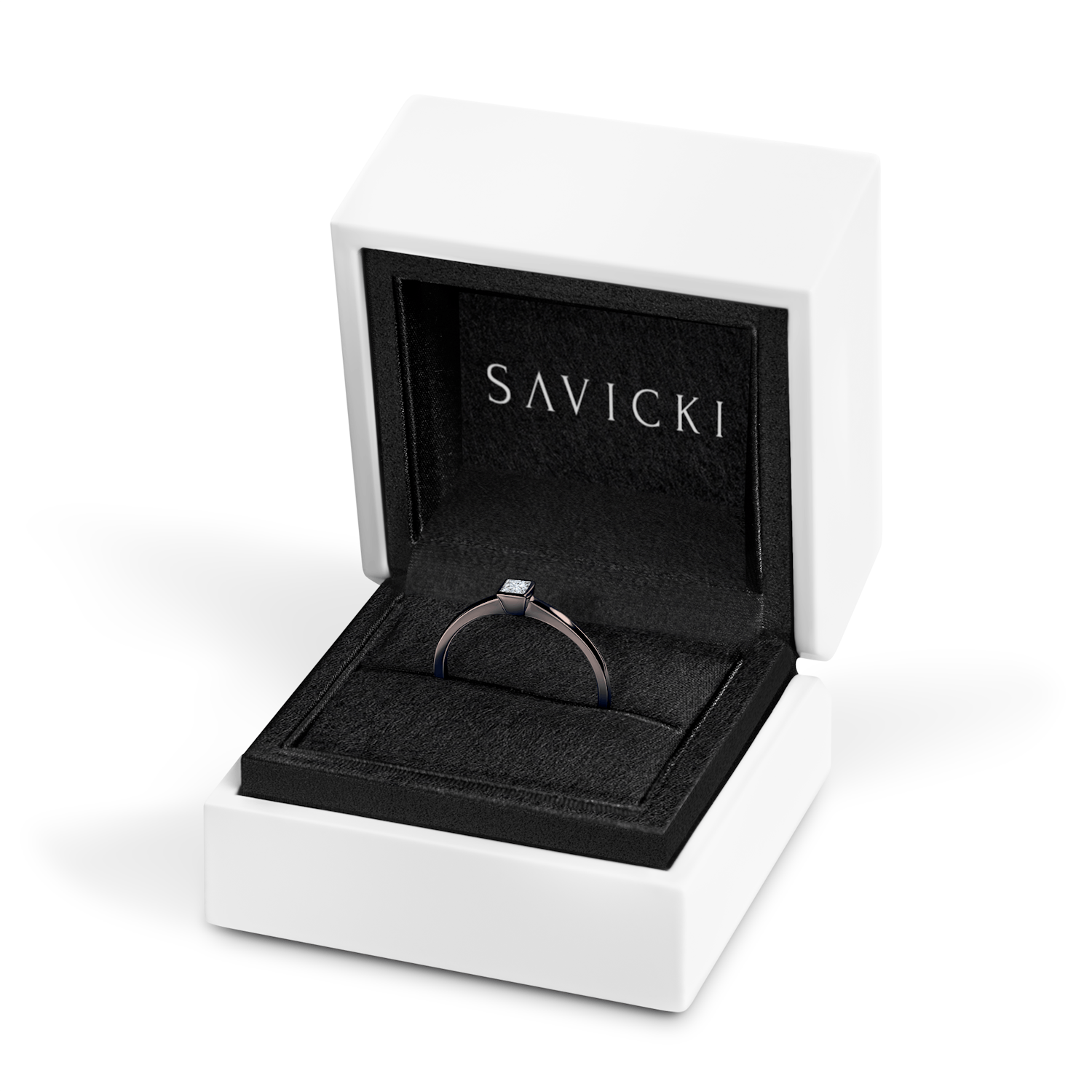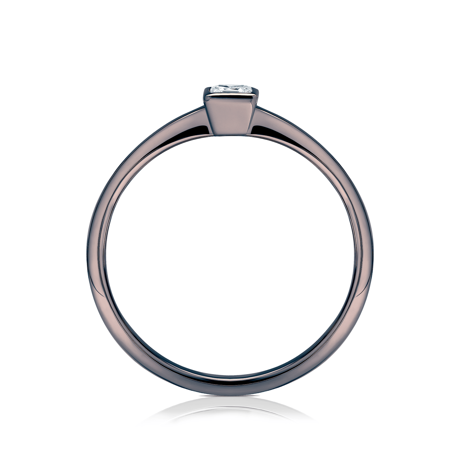 Pierścionek zaręczynowy z centralnie umieszczonym diamentem o masie 0,15 ct wysokiej czystości VS/G, o szlifie princessa. Wykonany z 14-karatowego czarnego złota (próba 0,585).