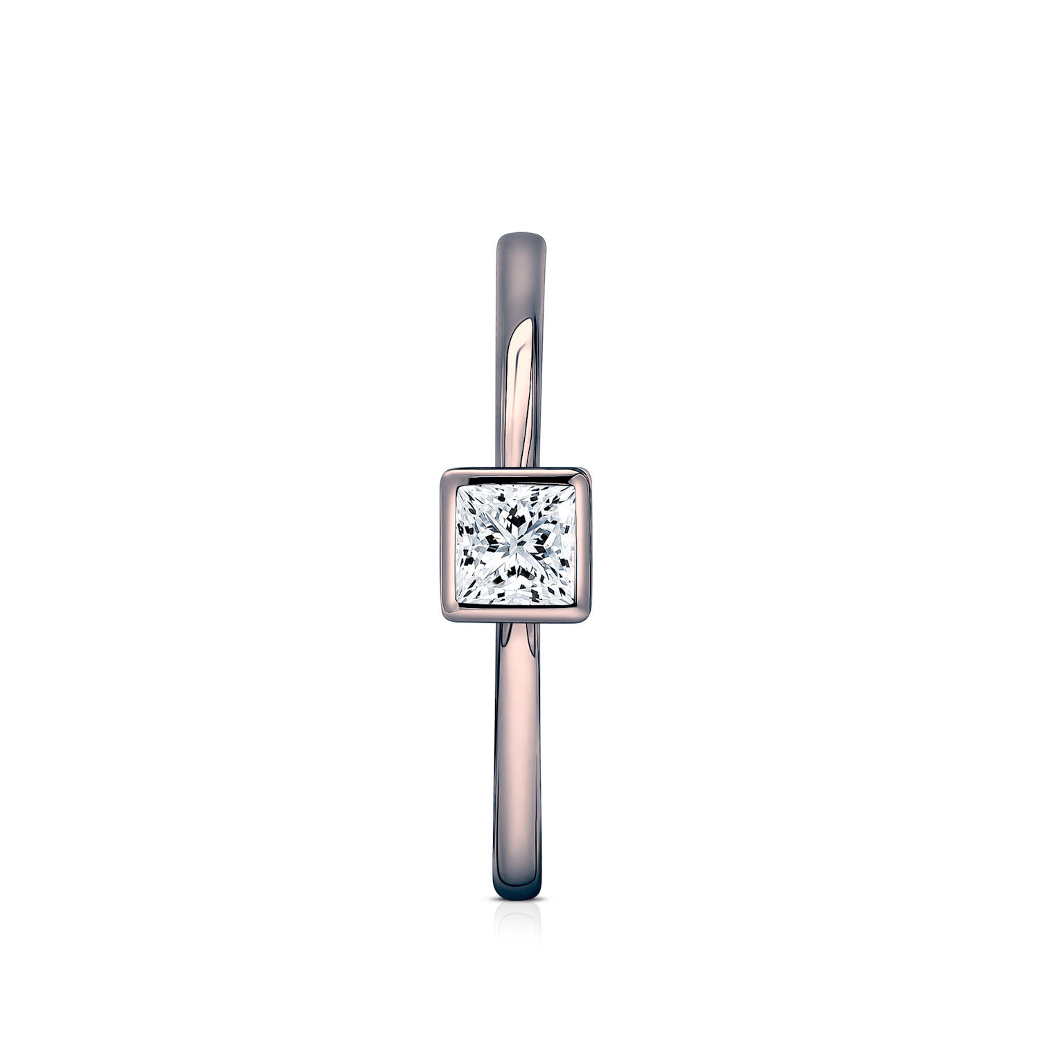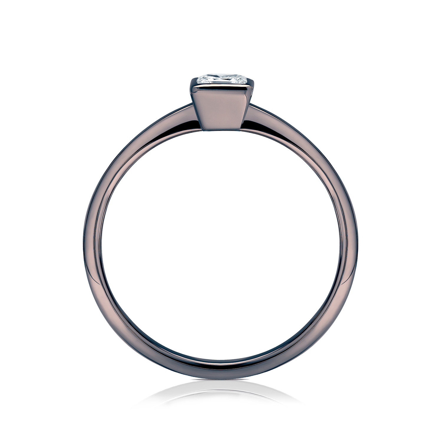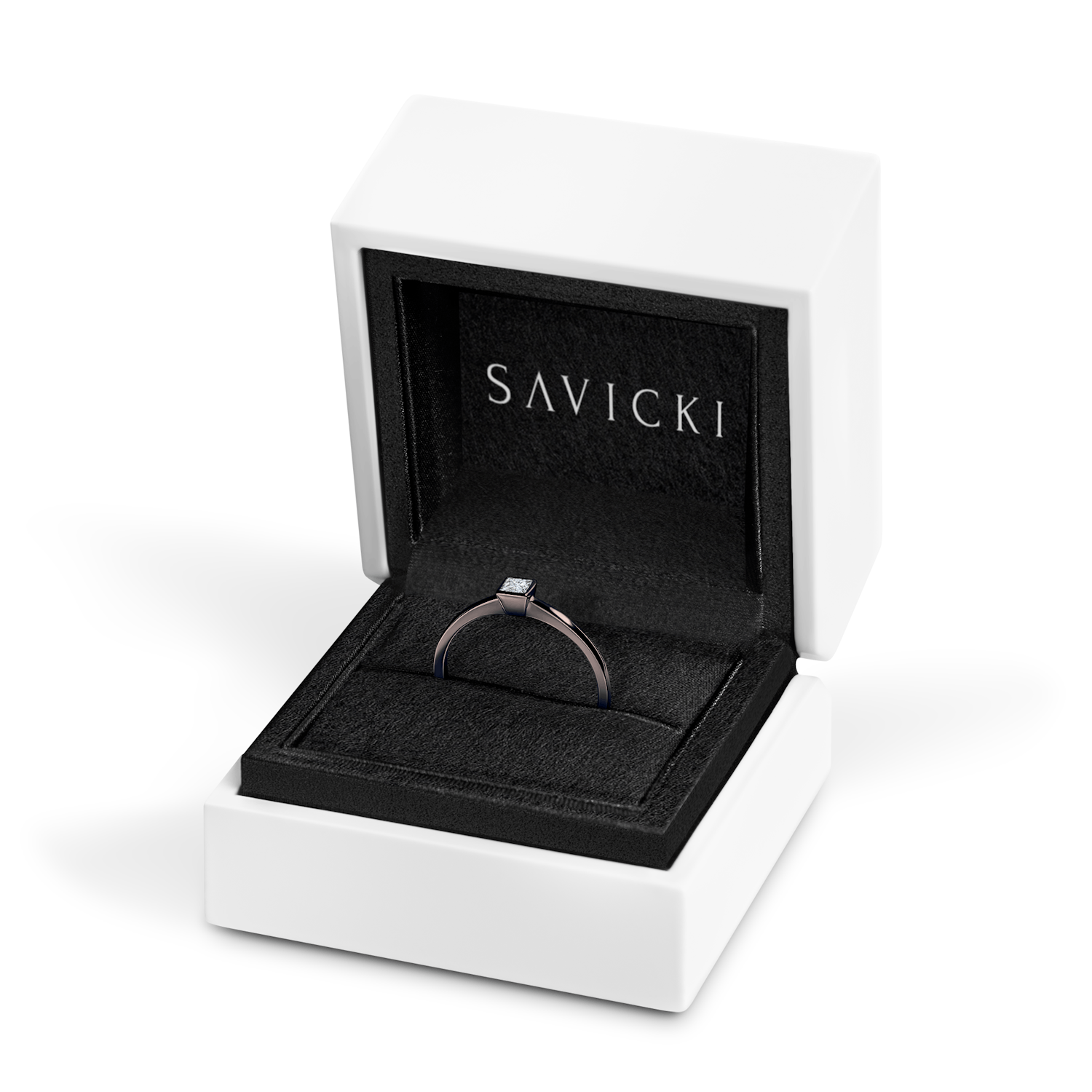 Pierścionek zaręczynowy z centralnie umieszczonym diamentem o masie 0,3 ct wysokiej czystości VS/G, o szlifie princessa. Wykonany z 14-karatowego czarnego złota (próba 0,585).