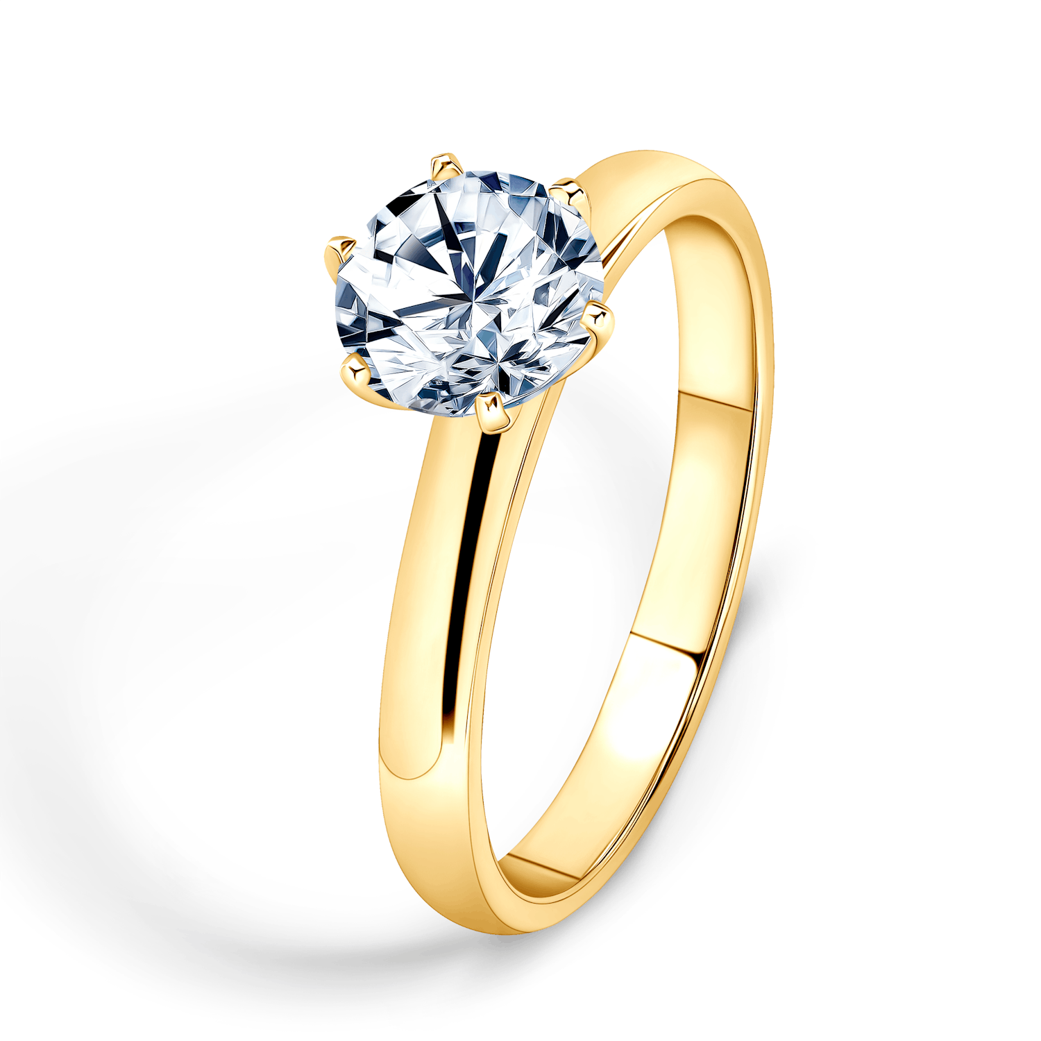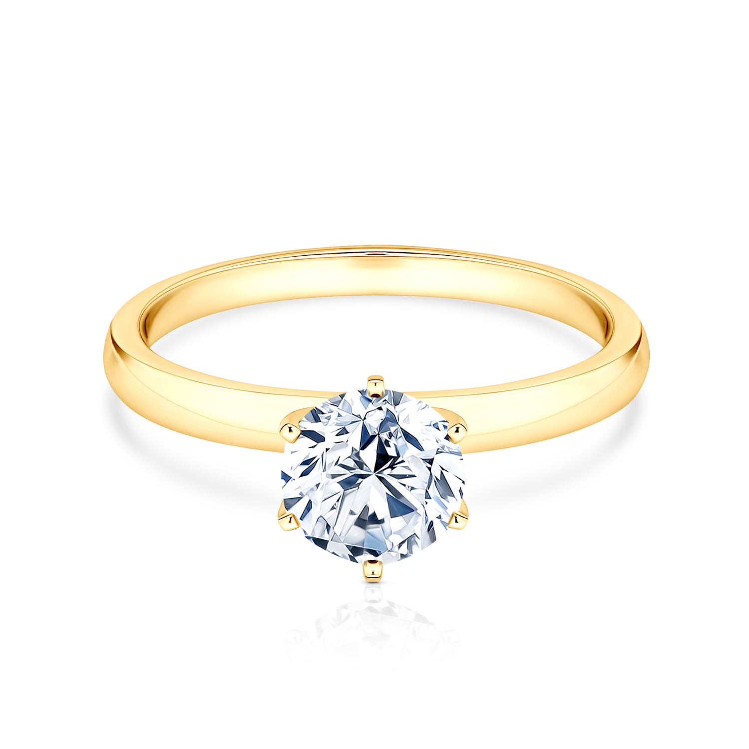 Pierścionek zaręczynowy z centralnie umieszczonym diamentem o masie 0,8 ct wysokiej czystości SI1/G, o szlifie brylantowym. Wykonany z 14-karatowego żółtego złota (próba 0,585).