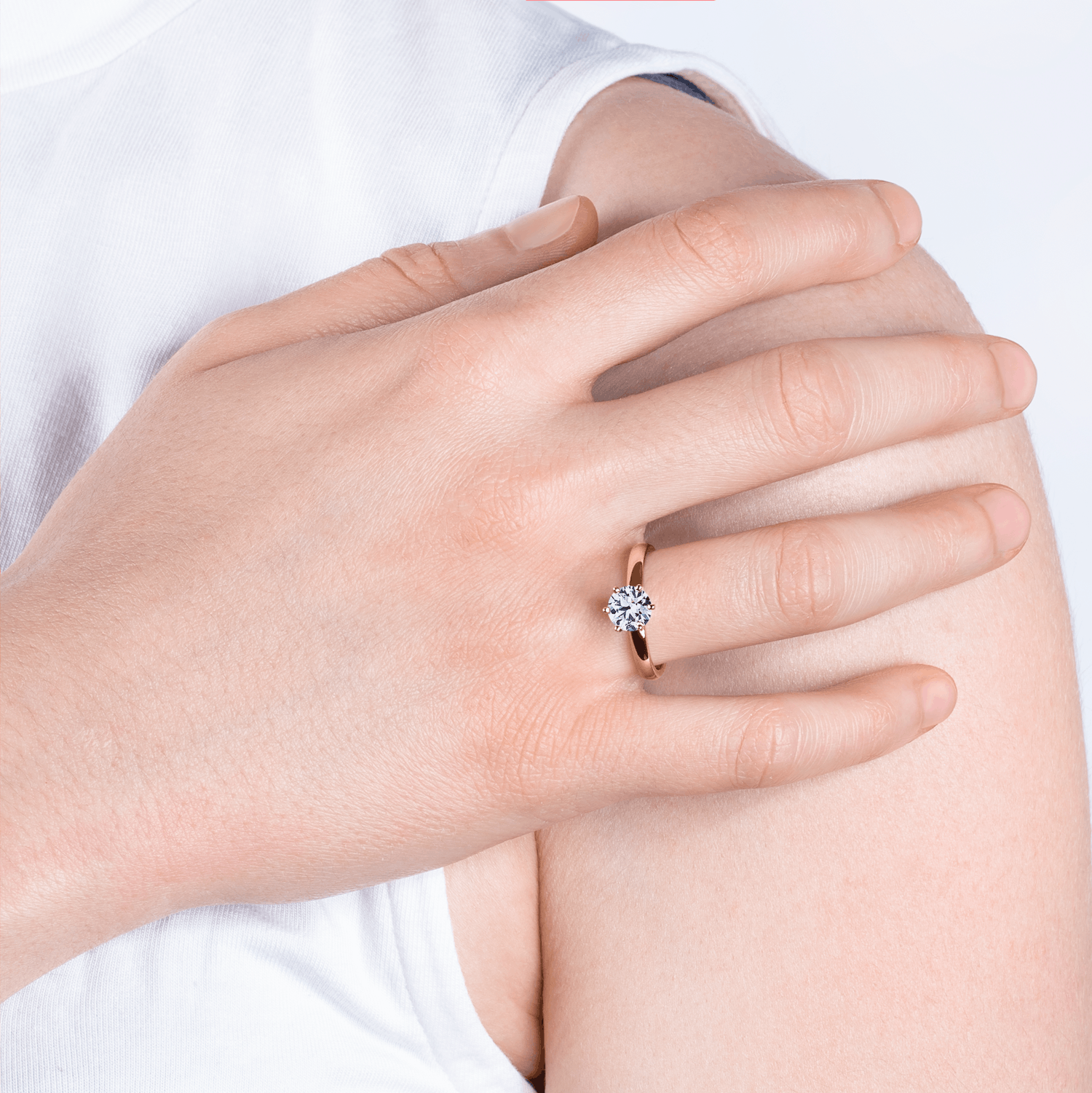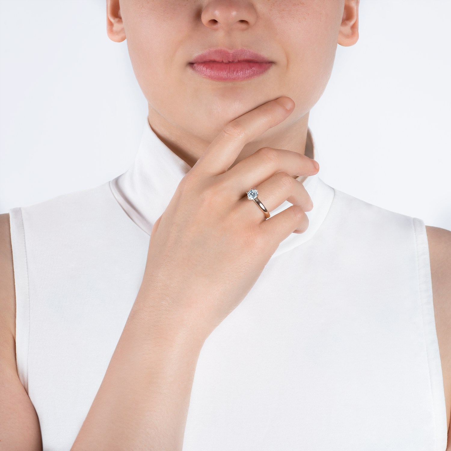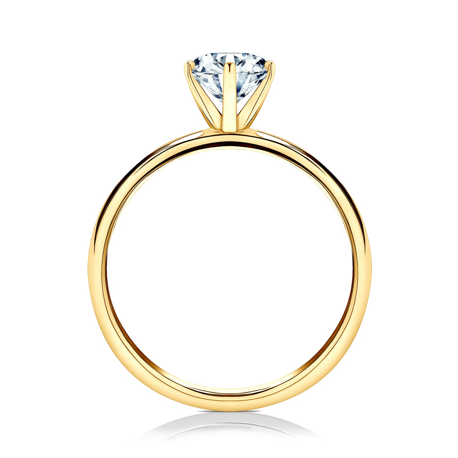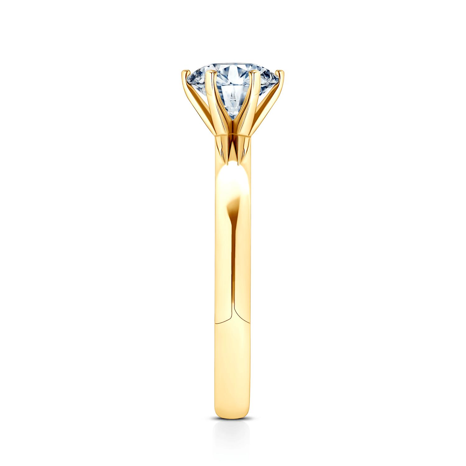 Pierścionek zaręczynowy z centralnie umieszczonym diamentem o masie 0,9 ct wysokiej czystości SI1/G, o szlifie brylantowym. Wykonany z 14-karatowego żółtego złota (próba 0,585).