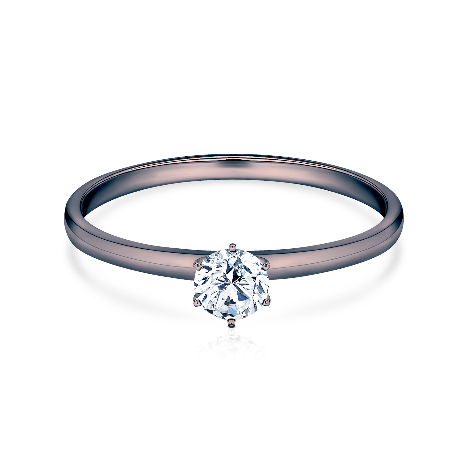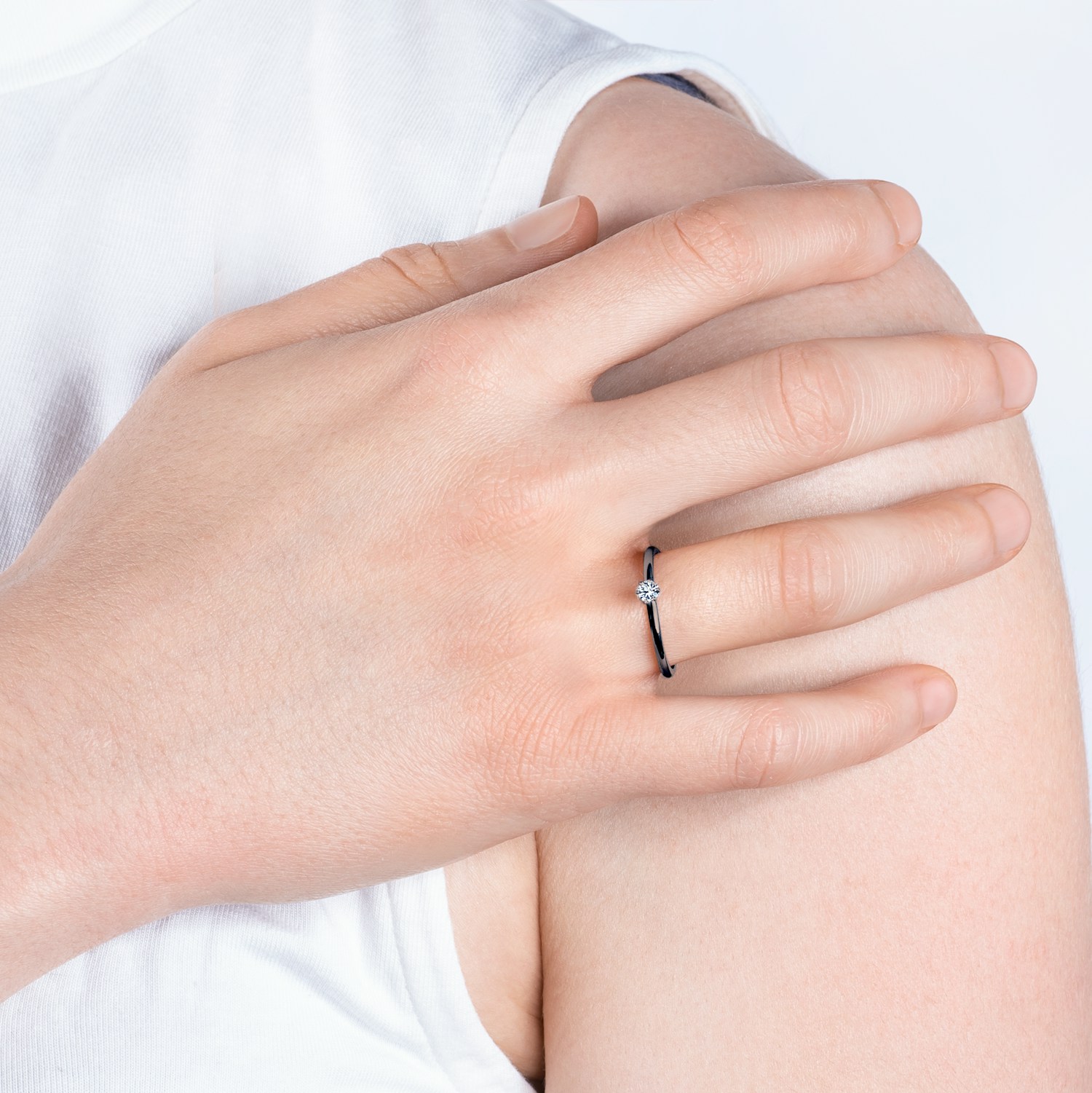 Pierścionek zaręczynowy z centralnie umieszczonym diamentem o masie 0,1 ct wysokiej czystości SI1/G, o szlifie brylantowym. Wykonany z 14-karatowego czarnego złota (próba 0,585).