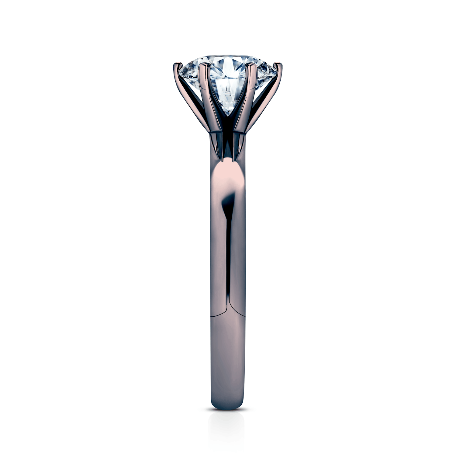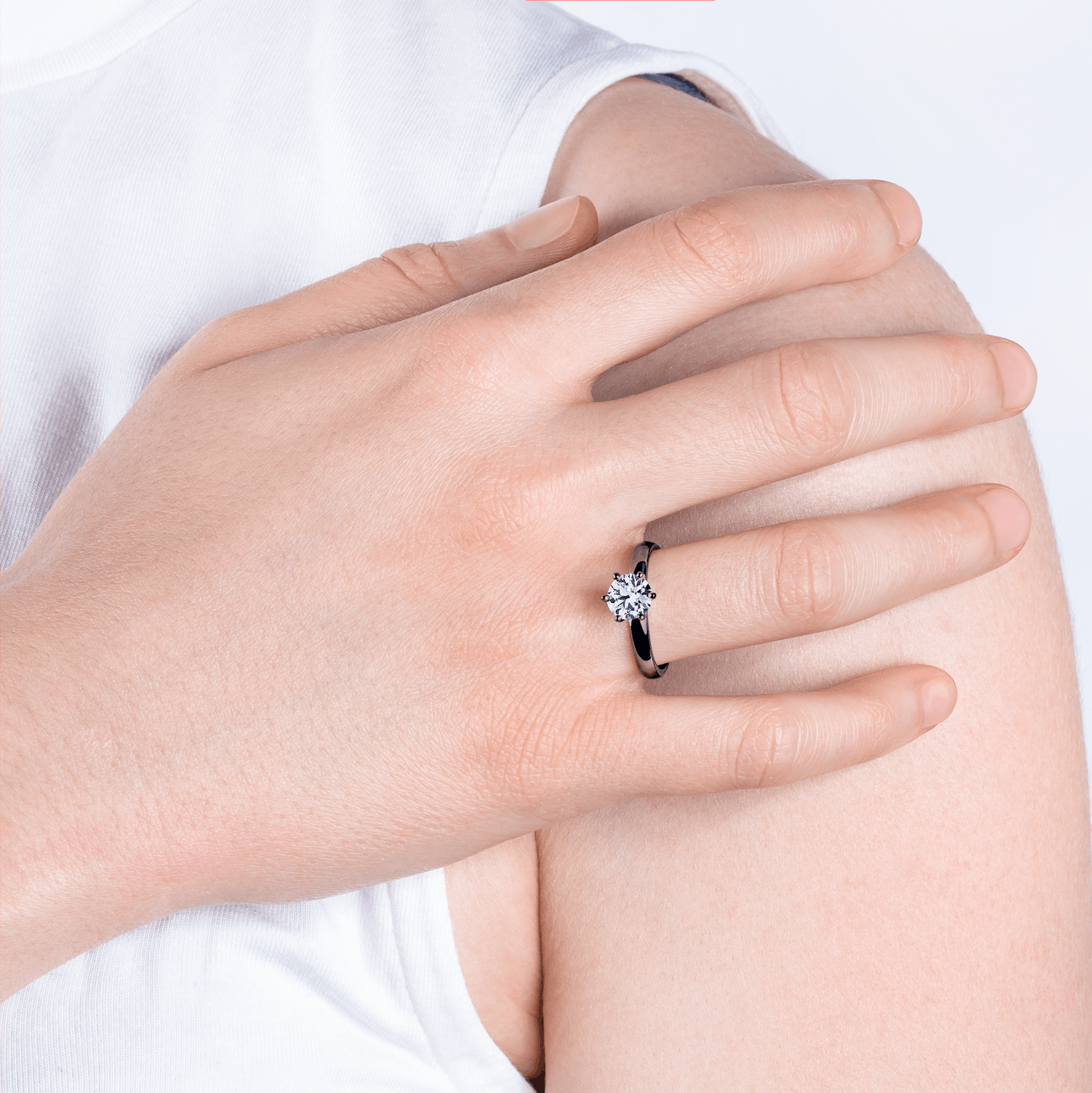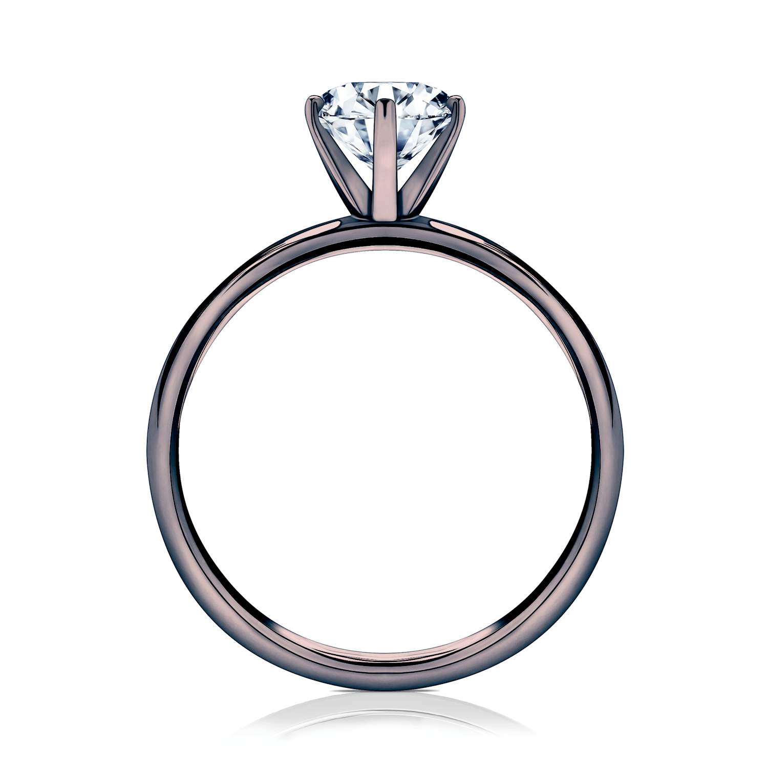 Pierścionek zaręczynowy z centralnie umieszczonym diamentem o masie 1 ct wysokiej czystości SI1/G, o szlifie brylantowym. Wykonany z 14-karatowego czarnego złota (próba 0,585).