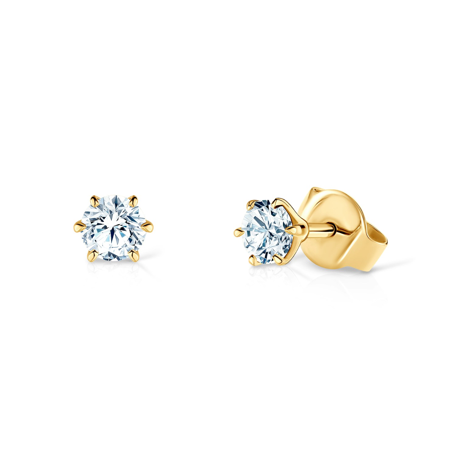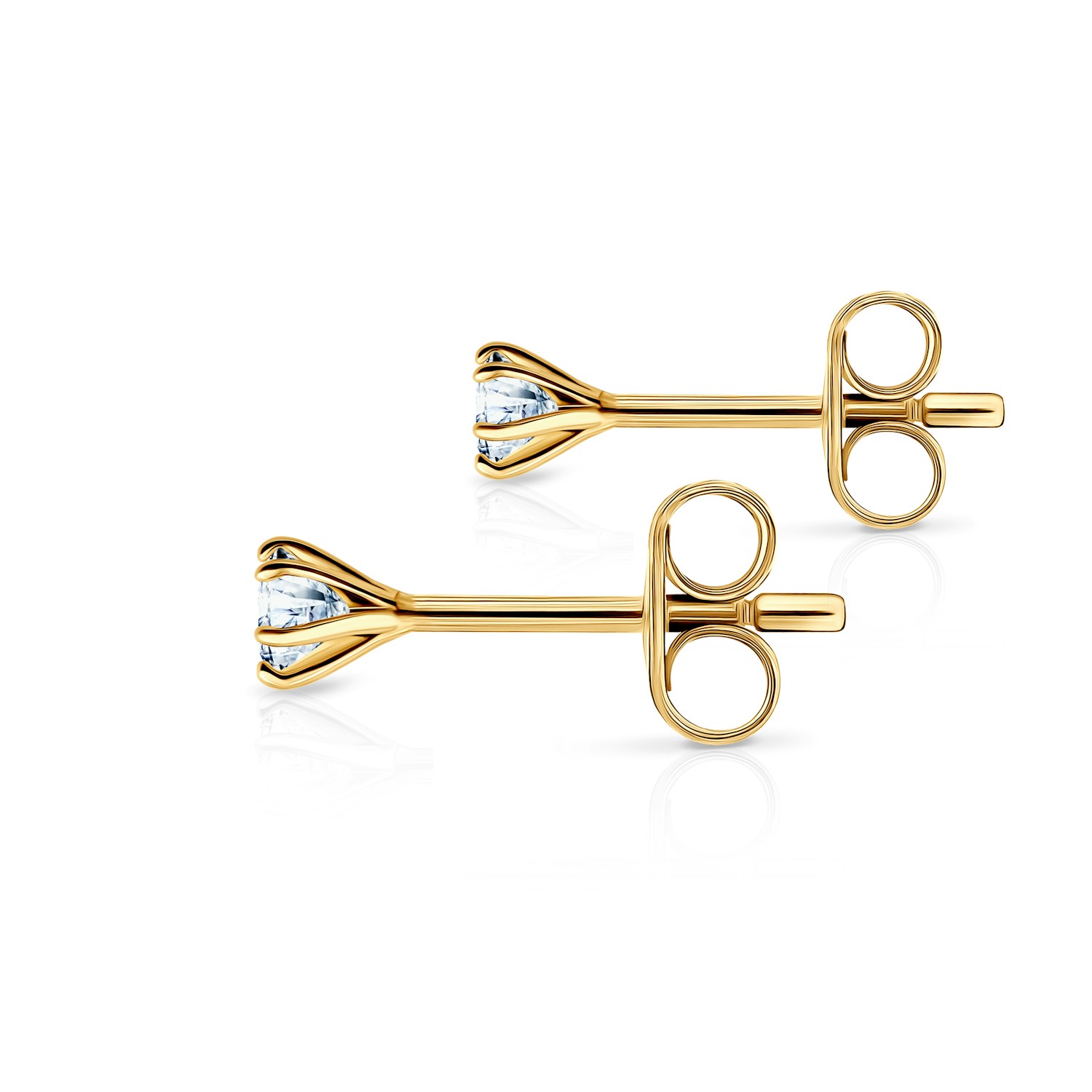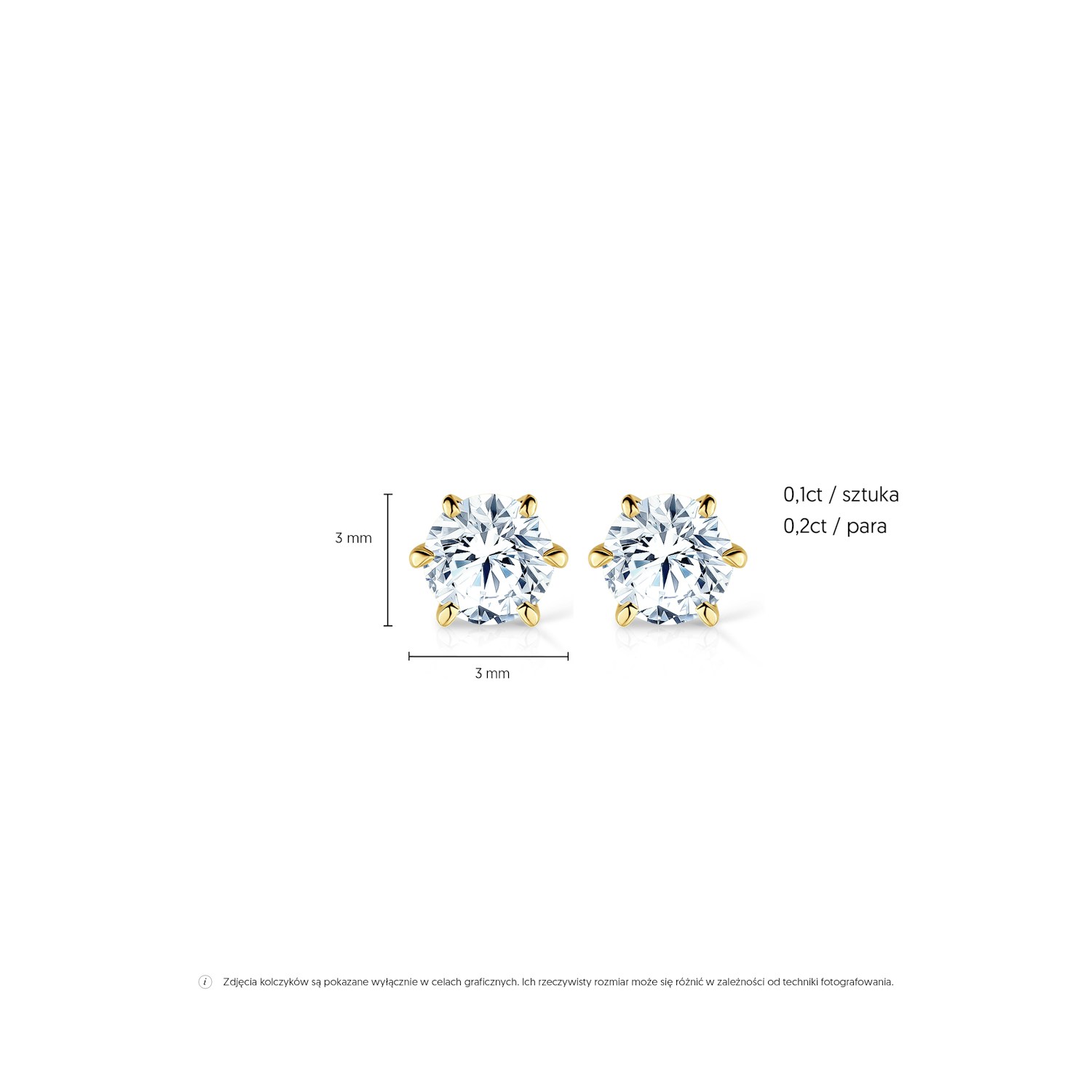 Kolczyki wykonane z 14-karatowego żółtego złota (próba 585). W kolczykach zostały osadzone 2 diamenty o szlifie brylantowym o łącznej masie 0,2 ct.