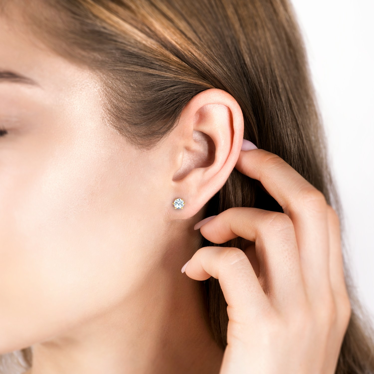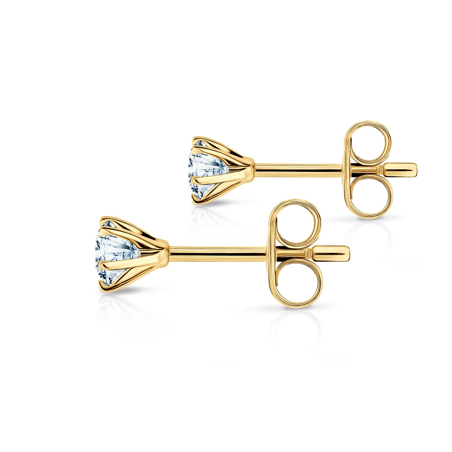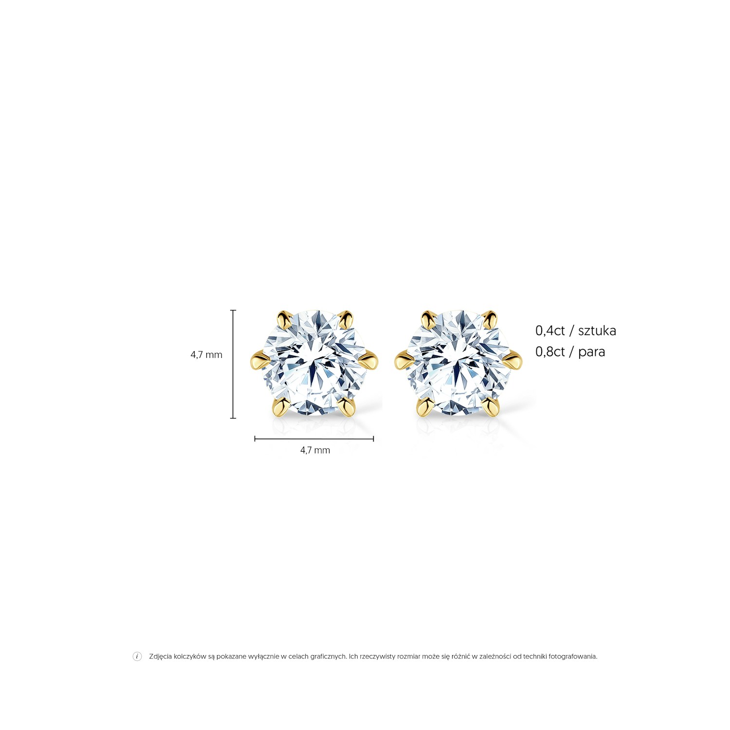 Kolczyki wykonane z 14-karatowego żółtego złota (próba 585). W kolczykach zostały osadzone 2 diamenty o szlifie brylantowym o łącznej masie 0,8 ct.