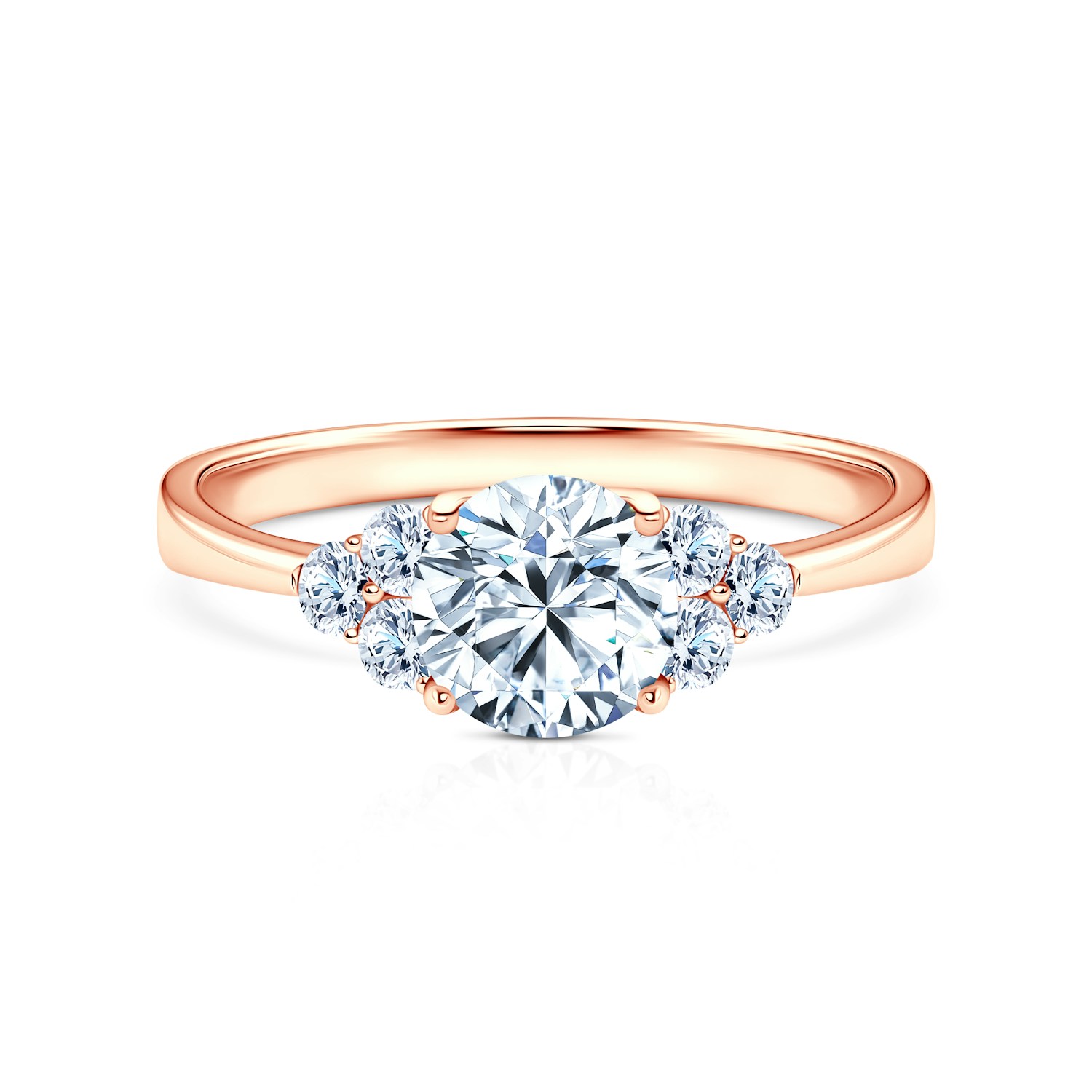 Ten olśniewający pierścionek zaręczynowy z diamentem o szlifie brylantowym i masie 1 ct oraz otaczającymi go sześcioma diamentami o łącznej masie 0,27 ct, wykonany został z 14-karatowego różowego złota próby 0,585.