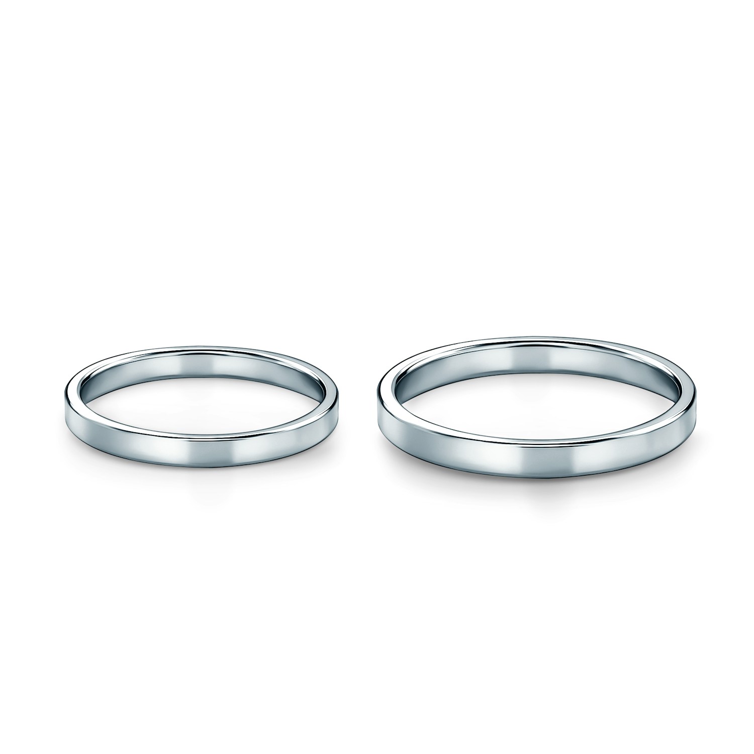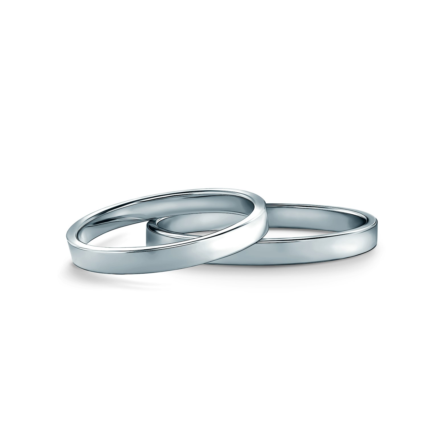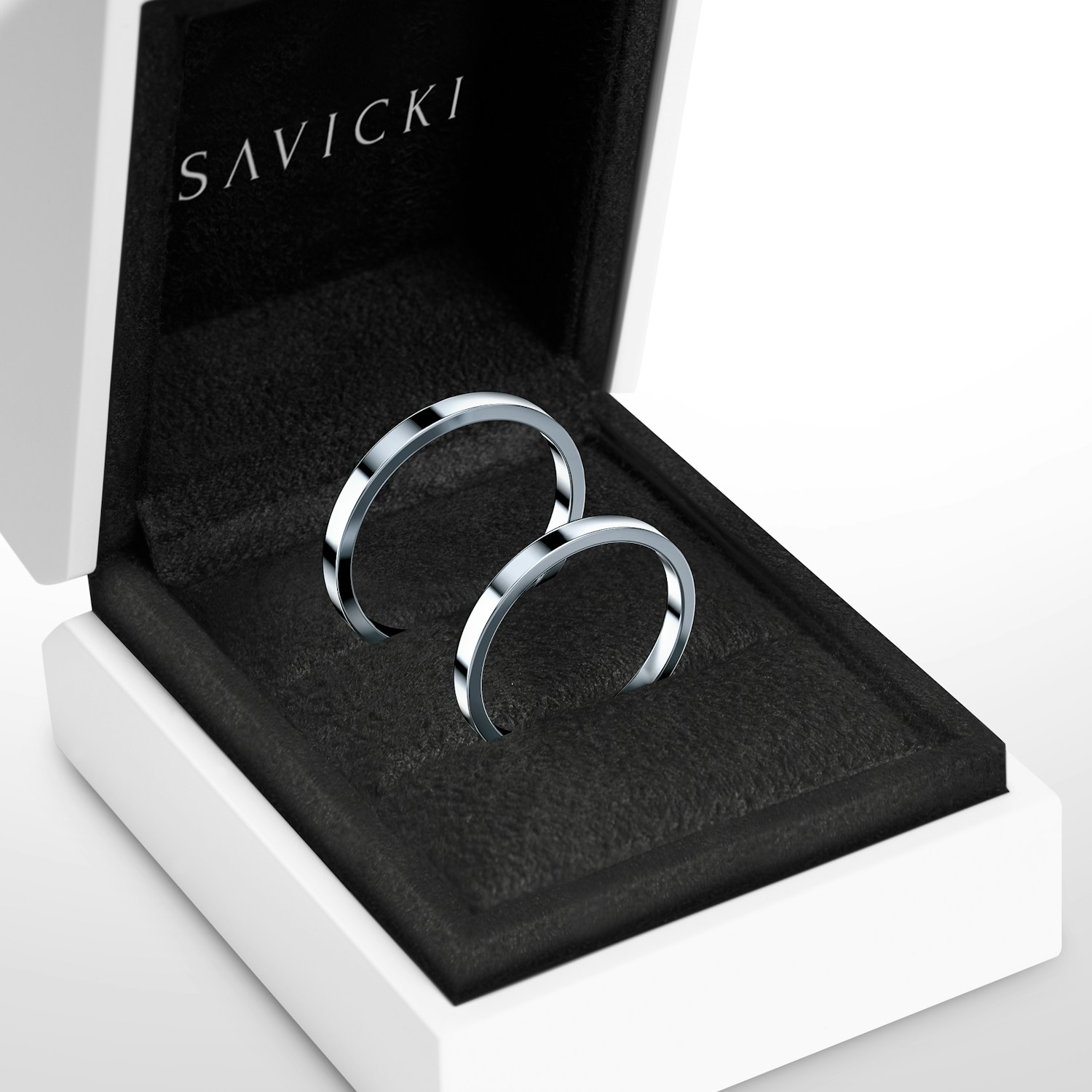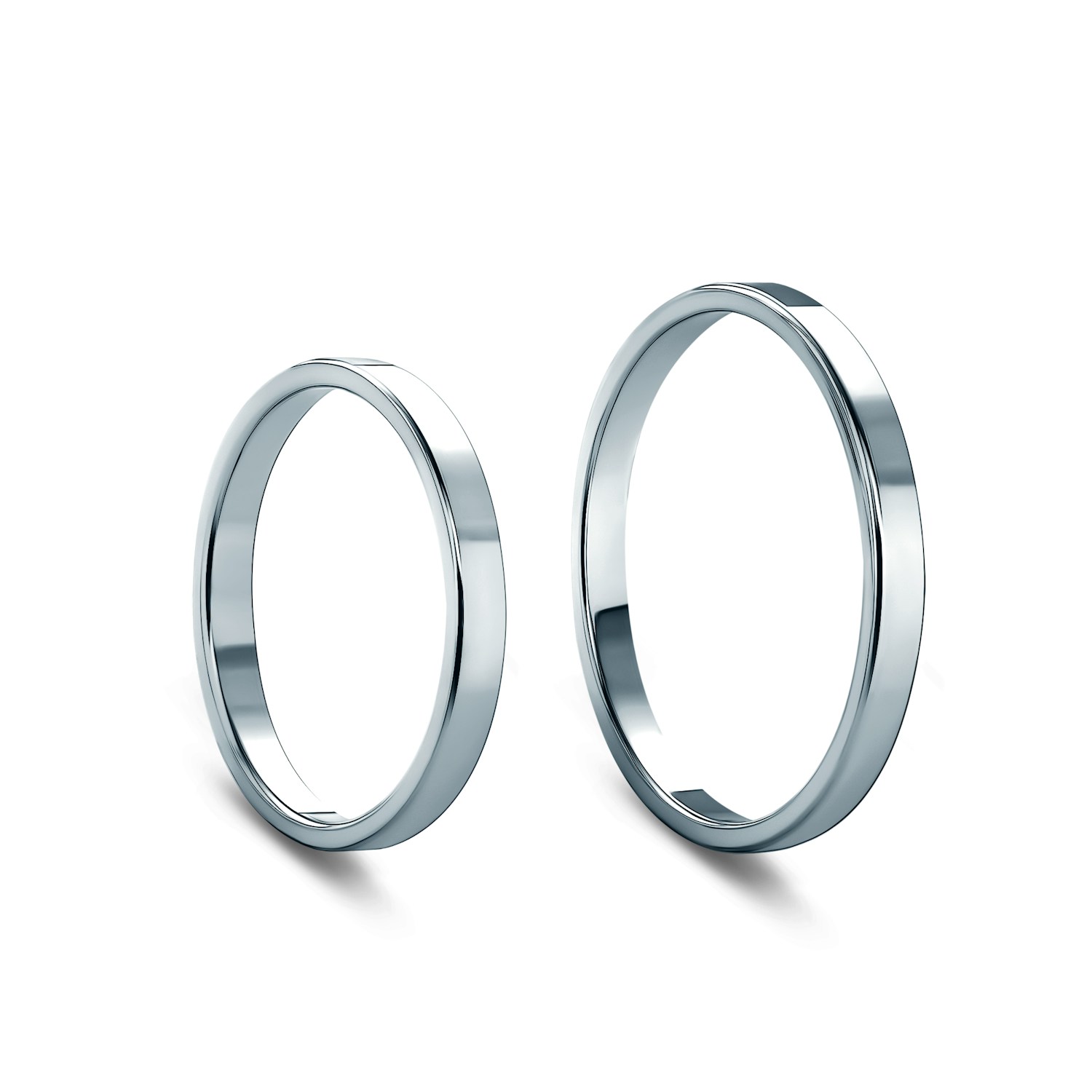 Obrączki ślubne płaskie o klasycznym wzorze, wykonane z platyny próby 950, o szerokości 2 mm.