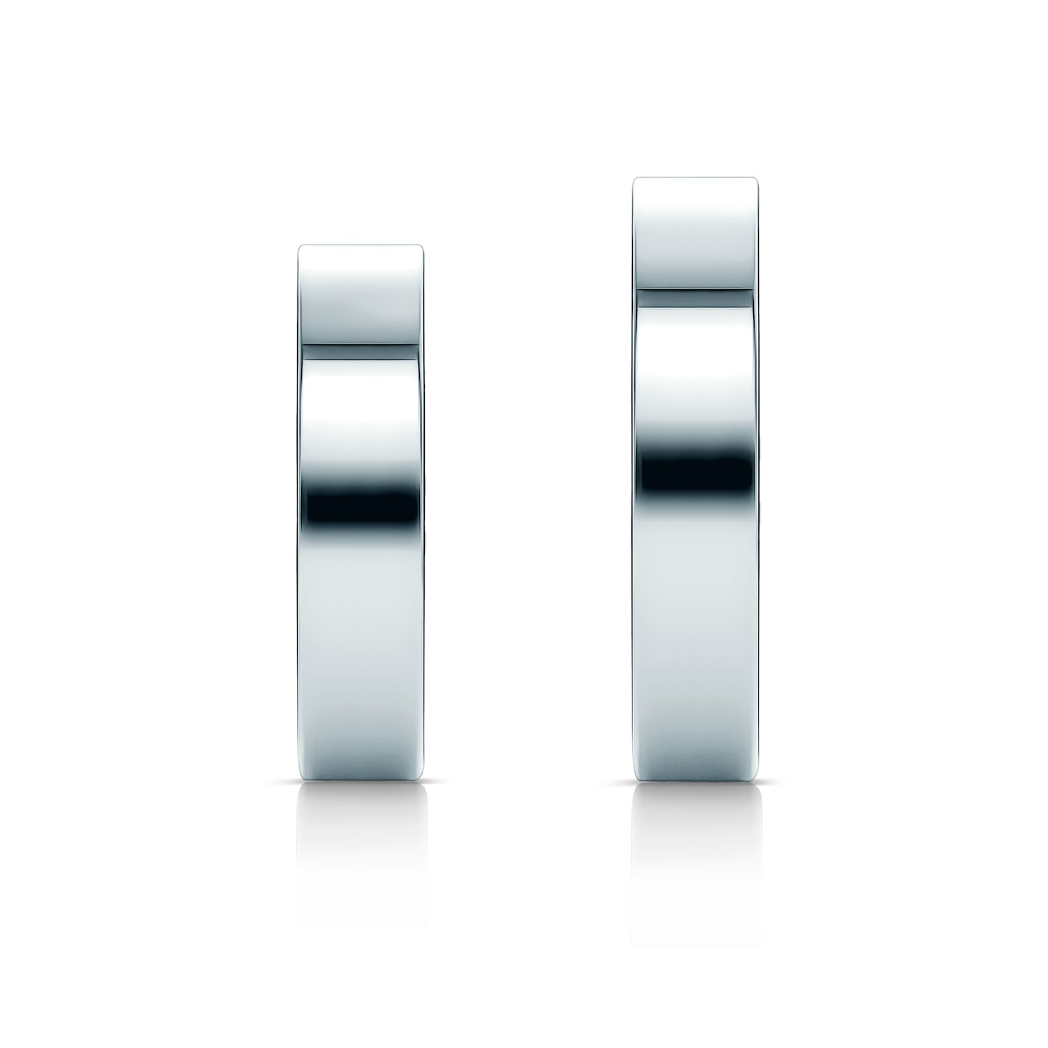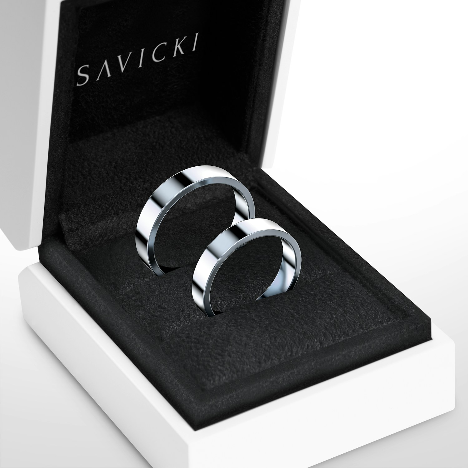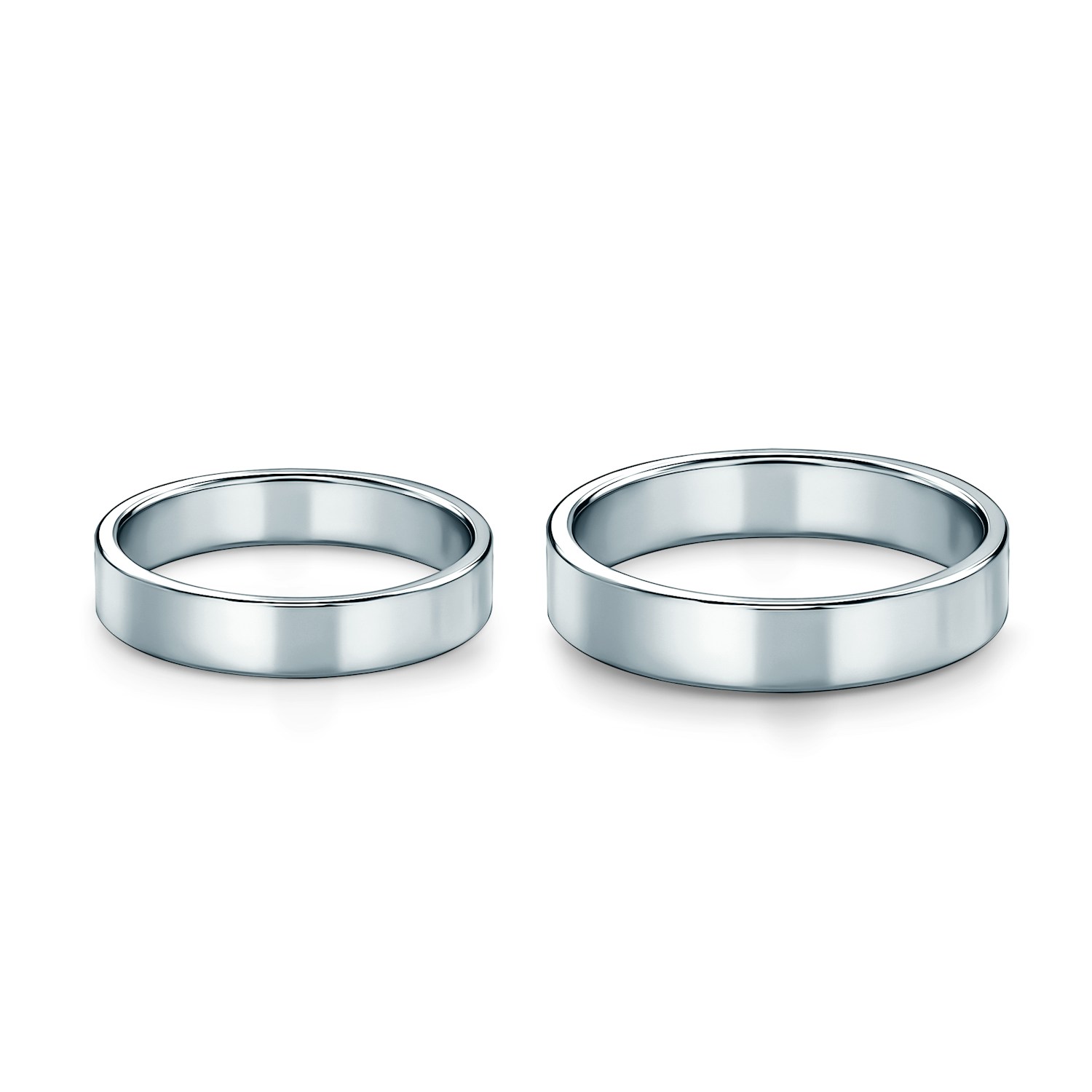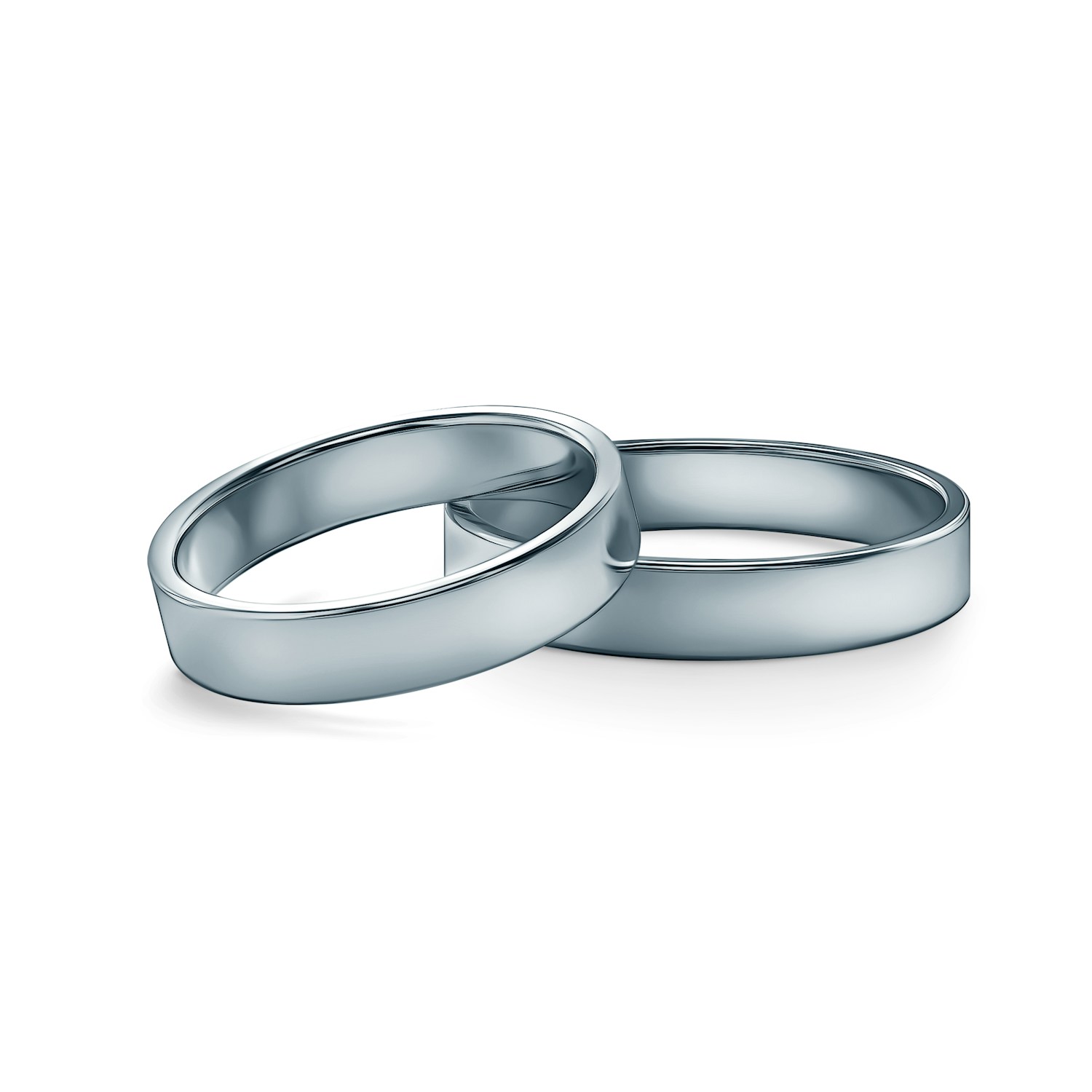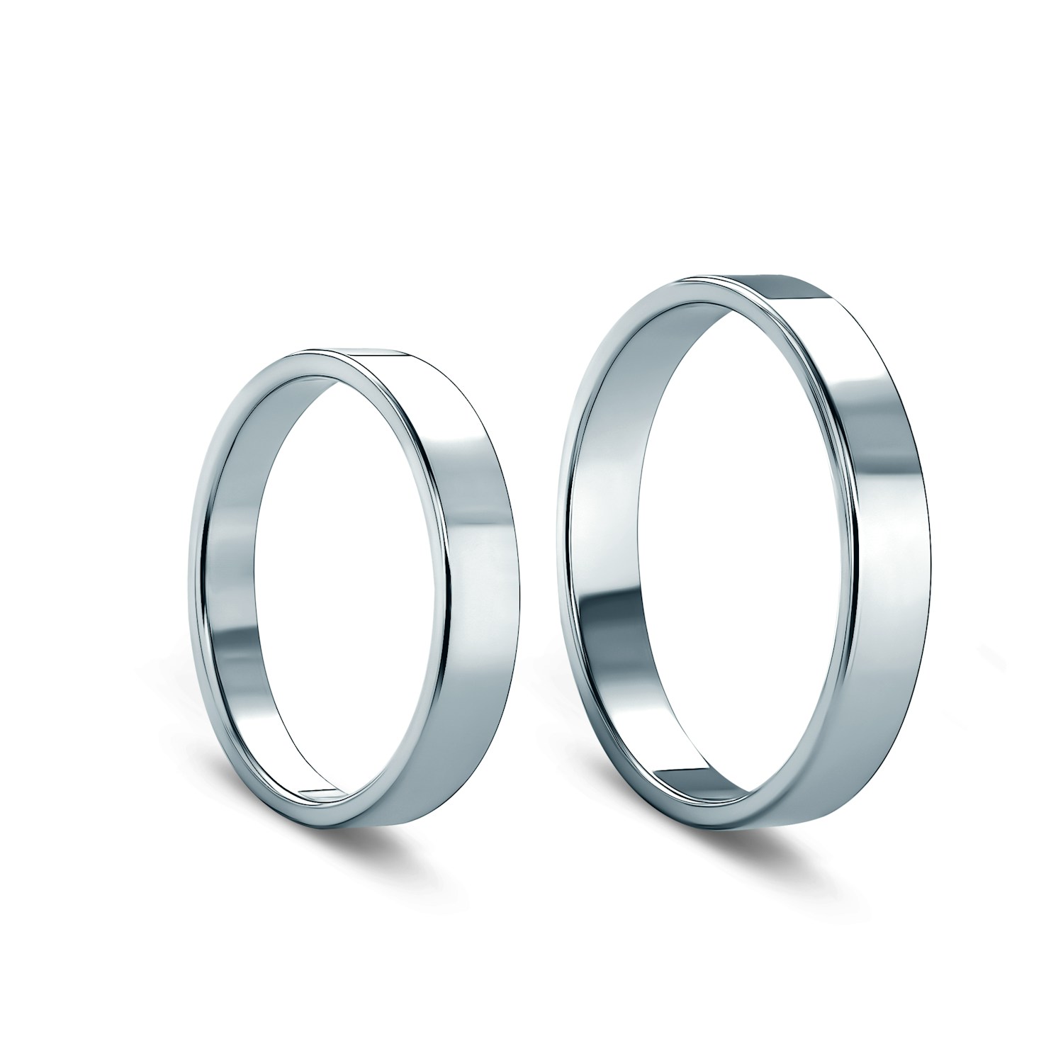 Obrączki ślubne płaskie o klasycznym wzorze, wykonane z platyny próby 950, o szerokości 4 mm.