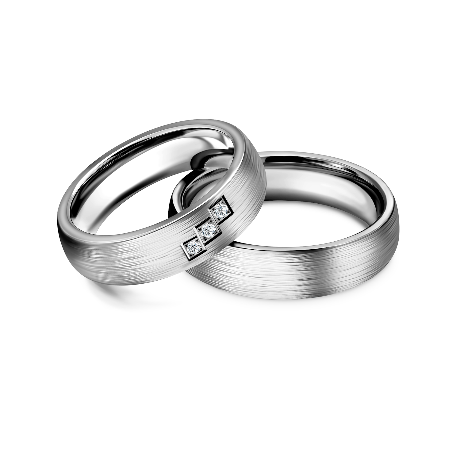 Obrączki ślubne wykonane z czystego tytanu, o szerokości 5,5 mm. Obrączka damska z 3 diamentami o łącznej masie 0,045 ct.