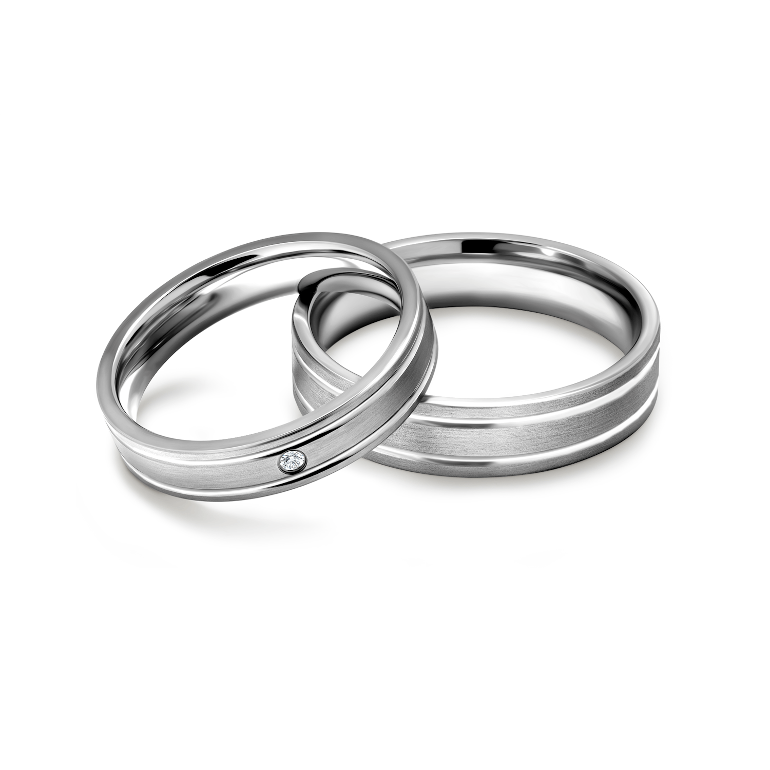 Obrączki ślubne wykonane z czystego tytanu. Obrączka damska o szerokości 4 mm, z diamentem o masie 0,015 ct. Męska obrączka o szerokości 5 mm.
