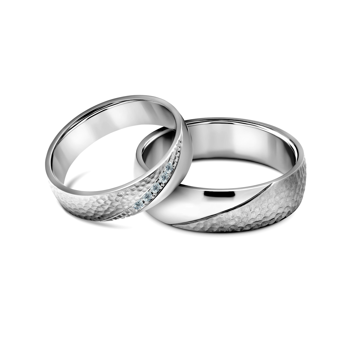 Obrączki ślubne wykonane z czystego tytanu. Obrączka damska o szerokości 5 mm, z 5 diamentami o łącznej masie 0,05 ct. Męska obrączka o szerokości 6 mm.