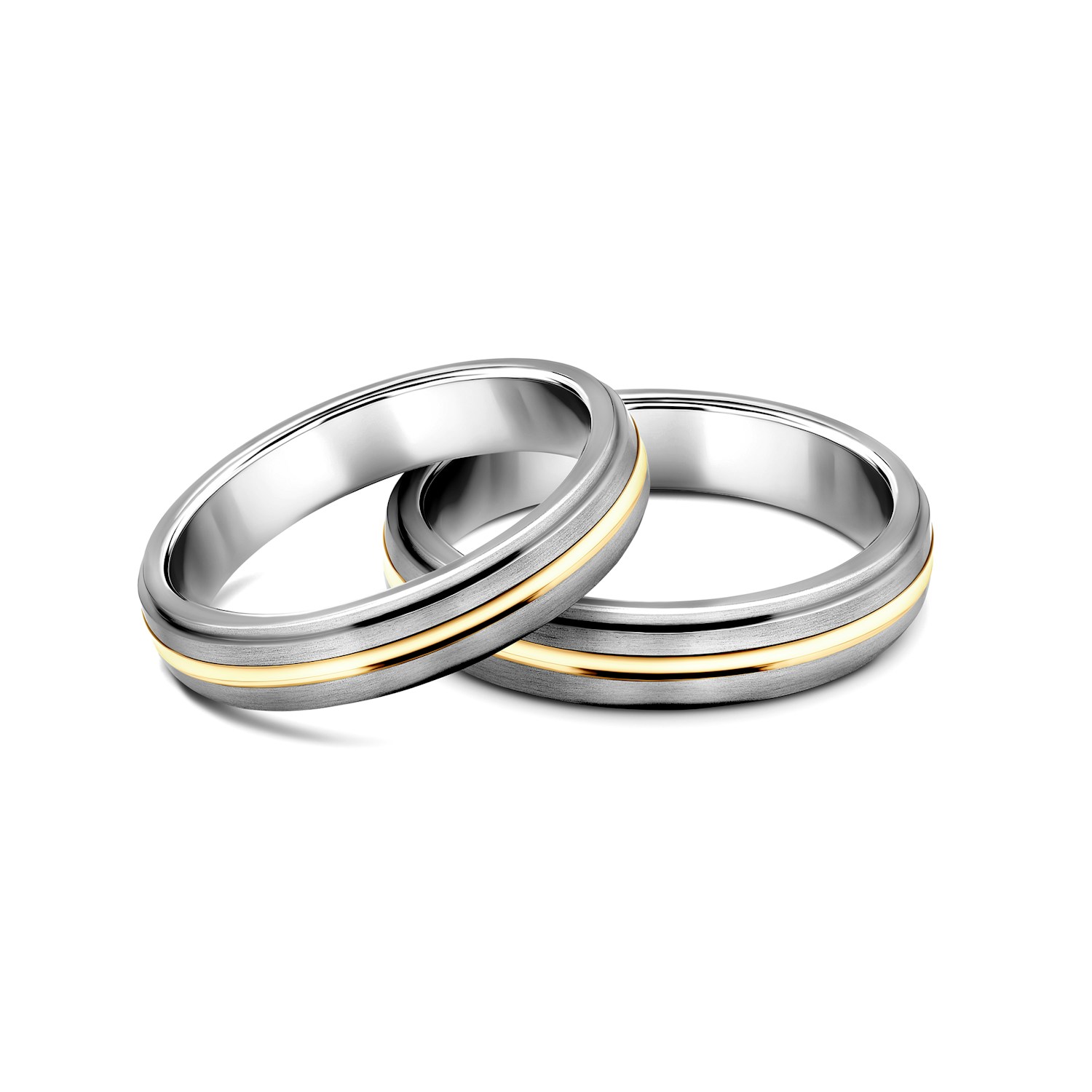 Obrączki ślubne wykonane z tytanu w połączeniu z tradycyjnym złotem, o szerokości 4 i 5 mm.