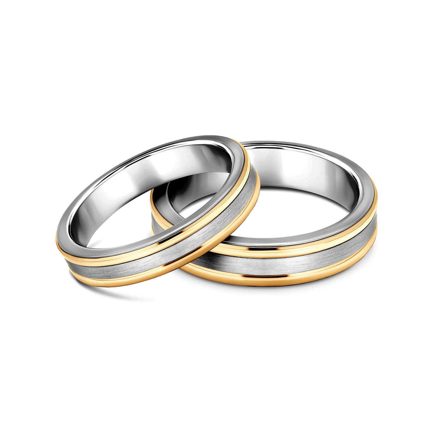 Obrączki ślubne wykonane z tytanu w połączeniu z tradycyjnym złotem, o szerokości 4 i 5 mm.