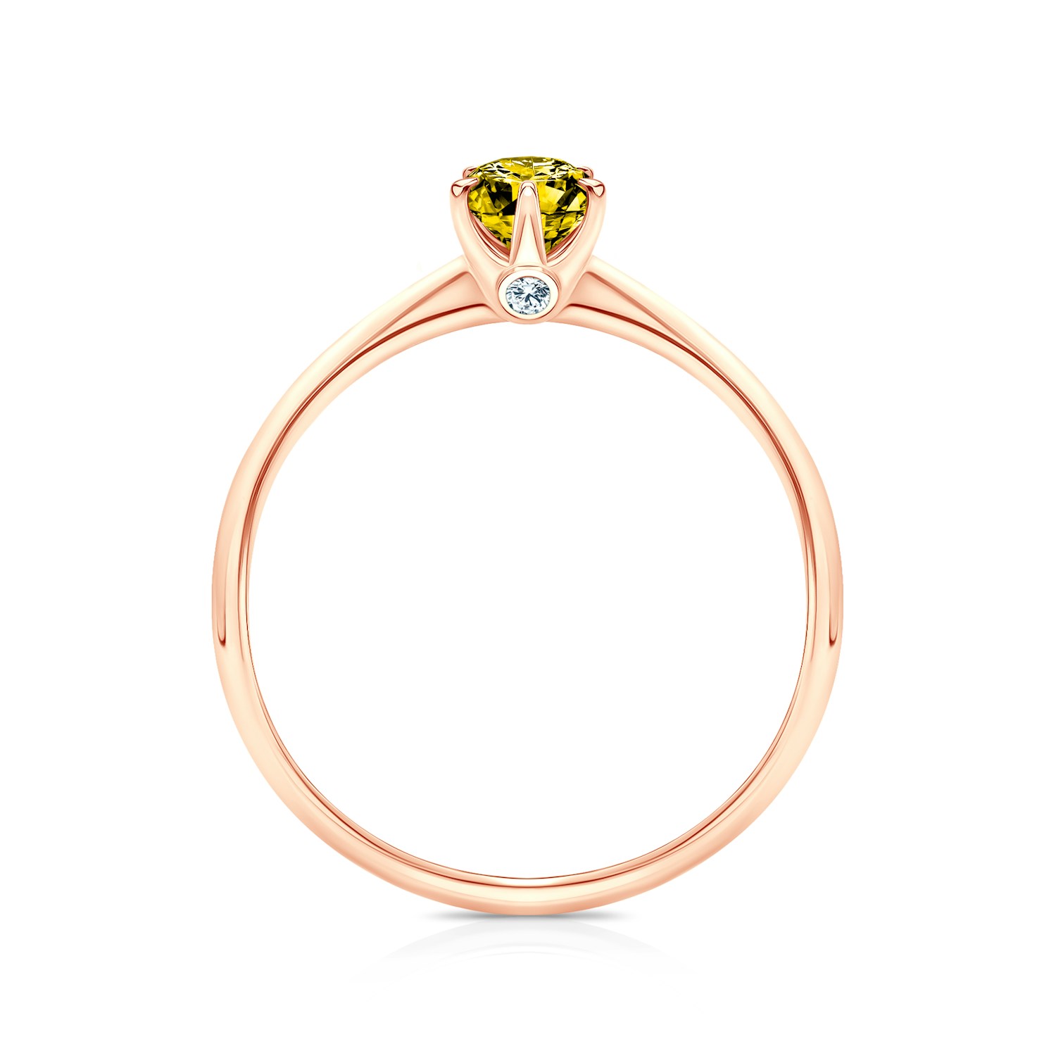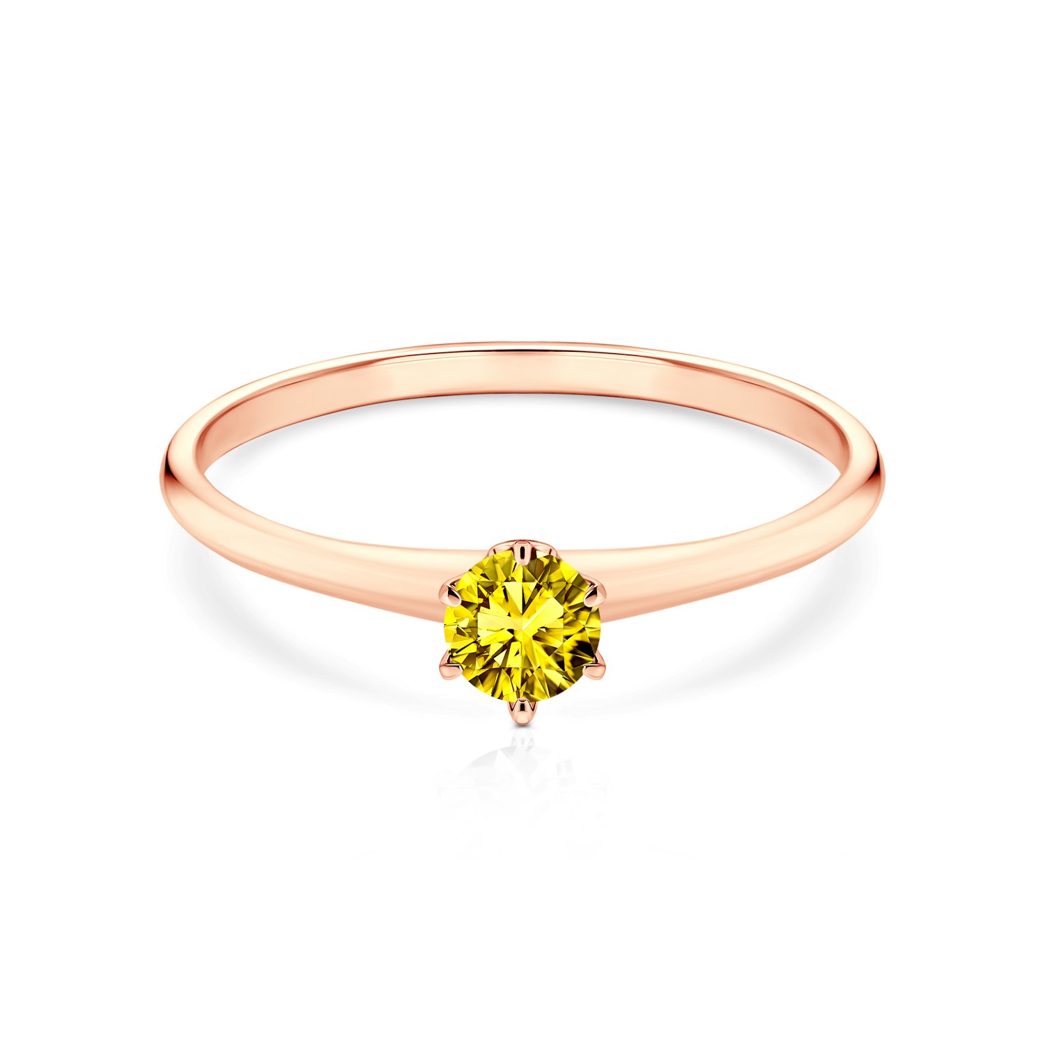 Pierścionek zaręczynowy z centralnie umieszczonym żółtym diamentem o masie 0,15 ct oraz dwoma diamentami o łącznej masie 0,015 ct, wysokiej czystości SI/H, o szlifie brylantowym. Wykonany z 14-karatowego różowego złota (próba 0,585).